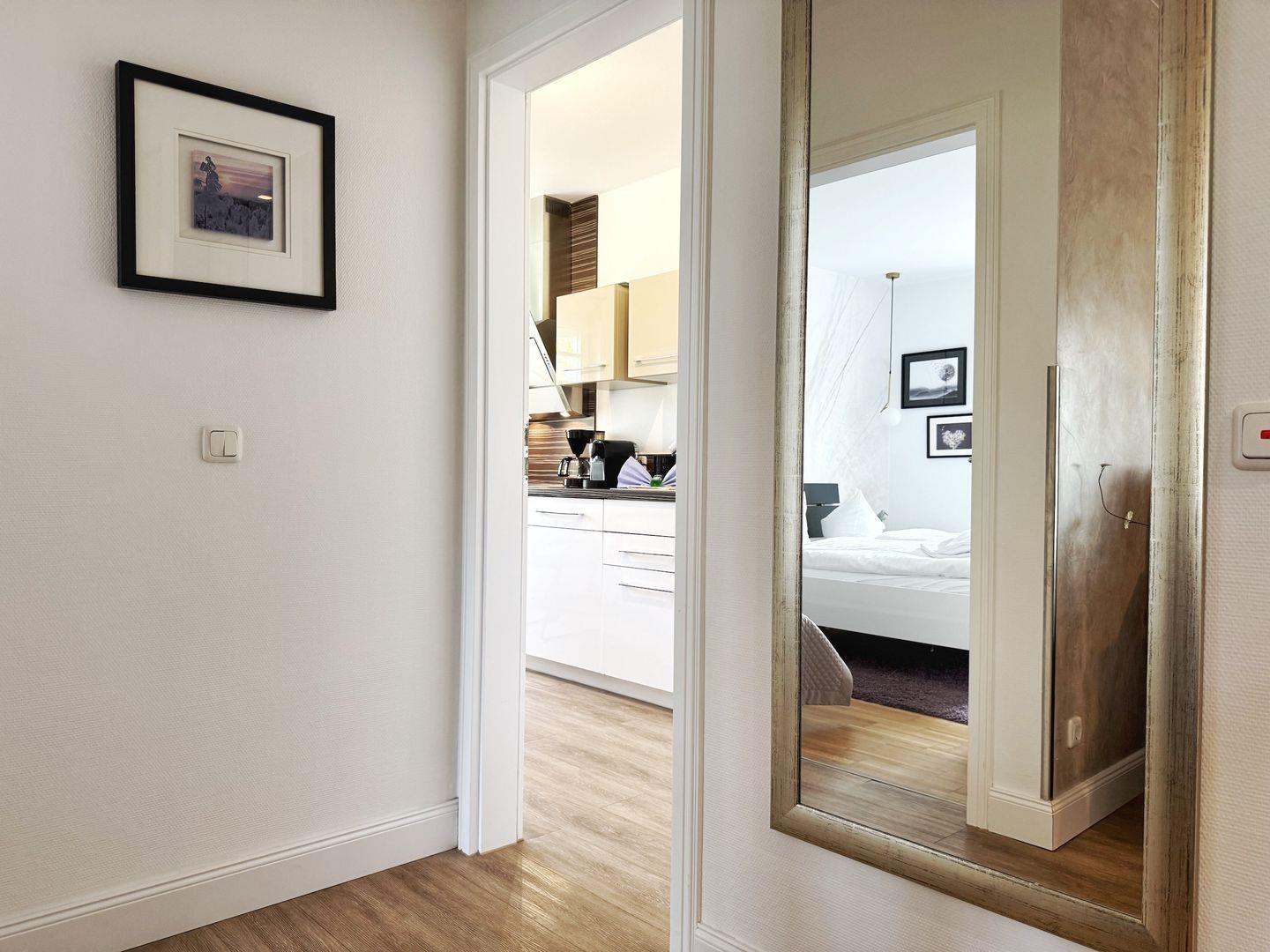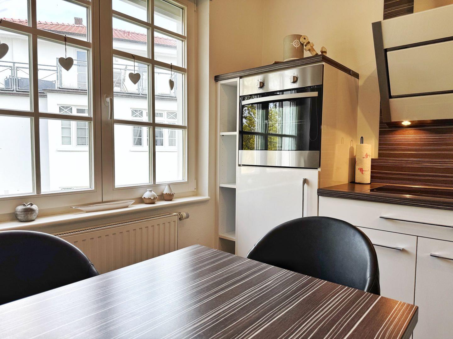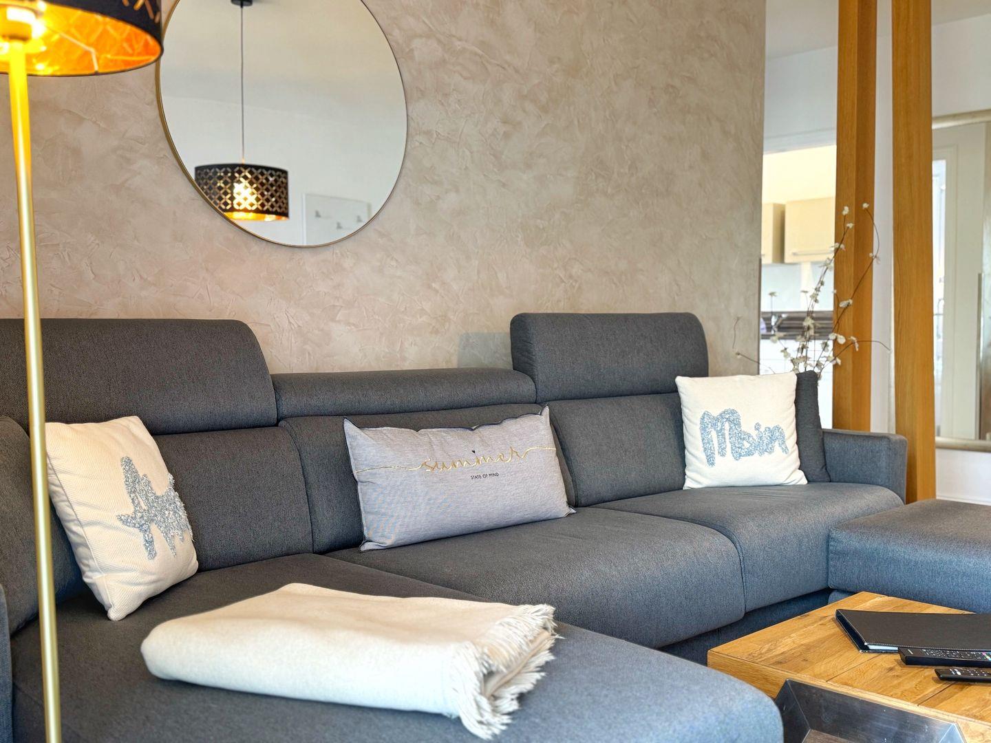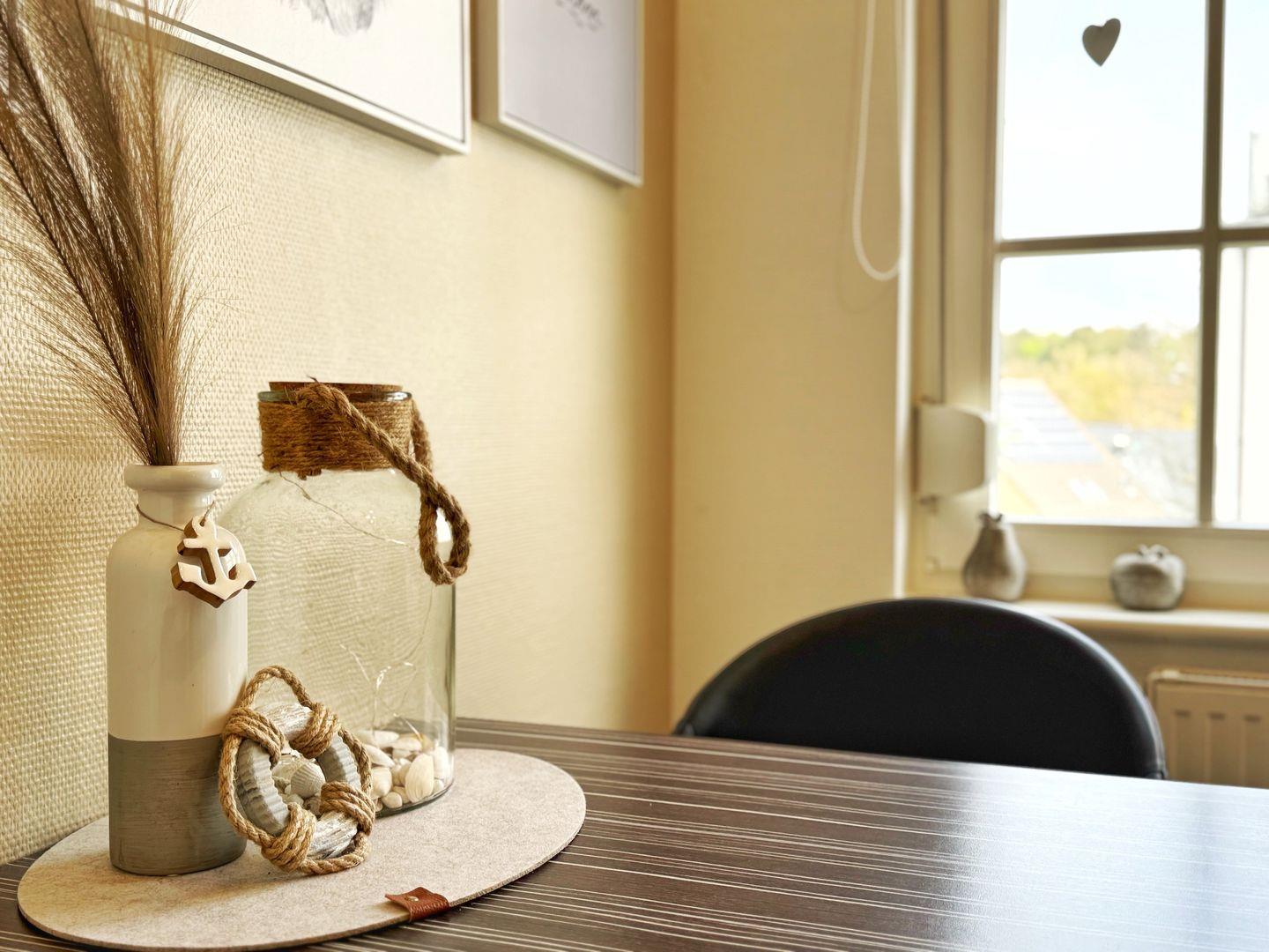 Die Wohnung befindet sich im 1.OG und bietet auf 55qm Wohnfläche Platz für 3 Personen in 2 Zimmern. Sie besteht aus einem Wohnzimmer (mit Schlafsofa) und einem Schlafzimmer (mit Doppelbett und einem weiteren, kleinen Einzelbett 170x90cm). Sowohl im Wohnzimmer als auch im Schlafzimmer gibt es einen Flachbild-TV. Die Küche ist separat und abgeschlossen mit einem Esstisch, Geschirrspüler, Ceran-Herd, Backofen und Kühlschrank. Im Bad gibt es eine Dusche, Waschbecken, WC und einen Haartrockner. Auf dem überdachten Balkon stehen Gartenmöbel und ein Sonnenschirm zur Verfügung - von Mittag bis in den Abend haben Sie dort die Sonne. Die Wohnung verfügt über eine Abstellkammer (mit Bügelbrett, Bügeleisen) und und ist mit Außenjalousien ausgestattet. WLAN ist vorhanden.