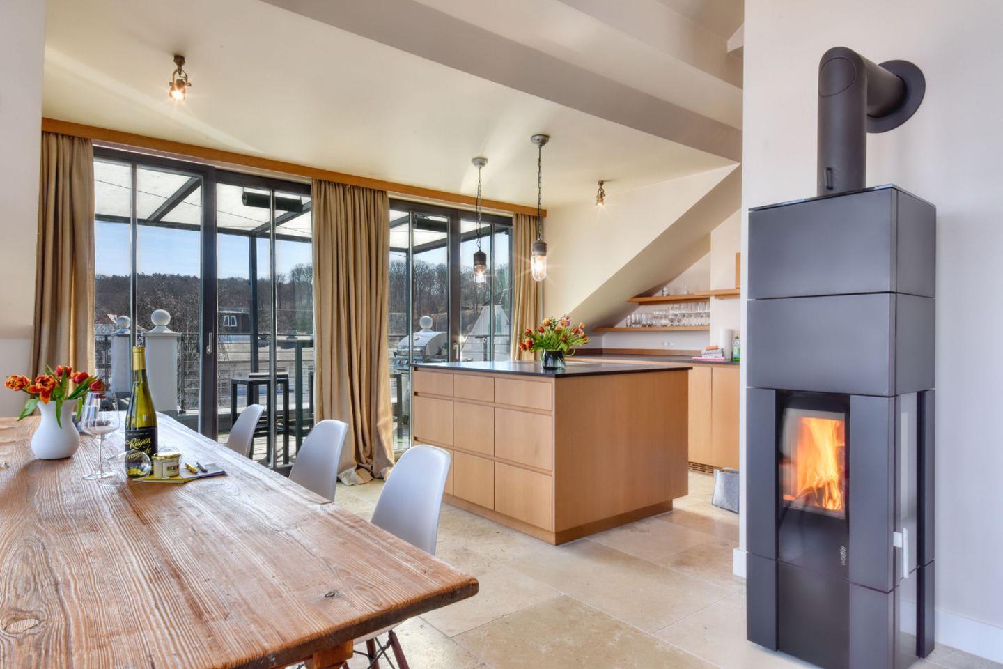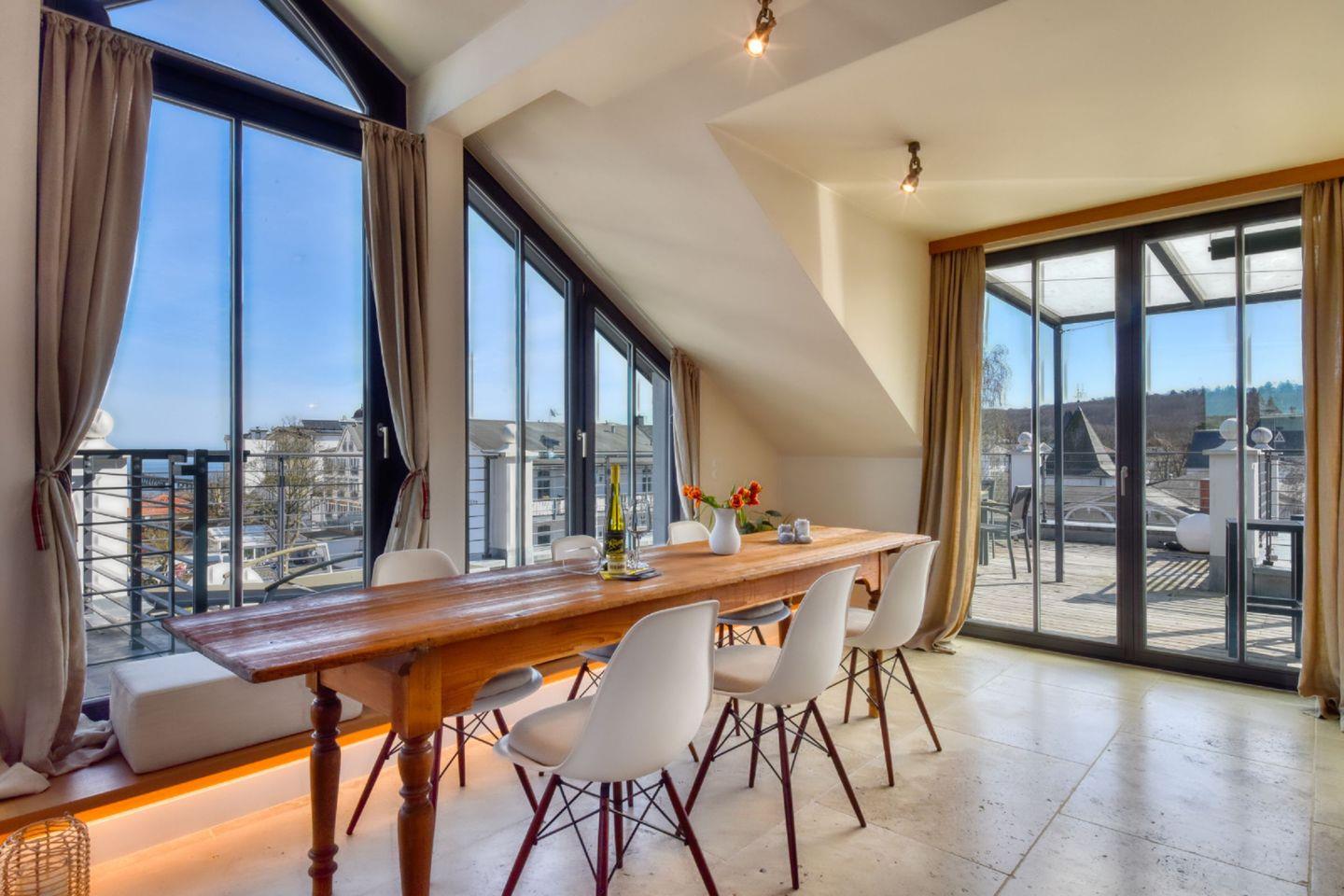 Das Penthouse befindet sich im 3. Stock der Villa und vereint modernen Wohnkomfort mit einer traumhaften Aussicht. Der helle, offene Wohn- und Essbereich ist mit stilvollen Möbeln ausgestattet und lädt dazu ein, entspannte Stunden zu verbringen. Von hier aus gelangen Sie direkt auf den Balkon, wo Sie frische Ostseeluft genießen und die umliegende Natur bewundern können. Ein großer Esstisch bietet ausreichend Platz, um gemeinsam zu speisen oder gesellige Abende zu verbringen.