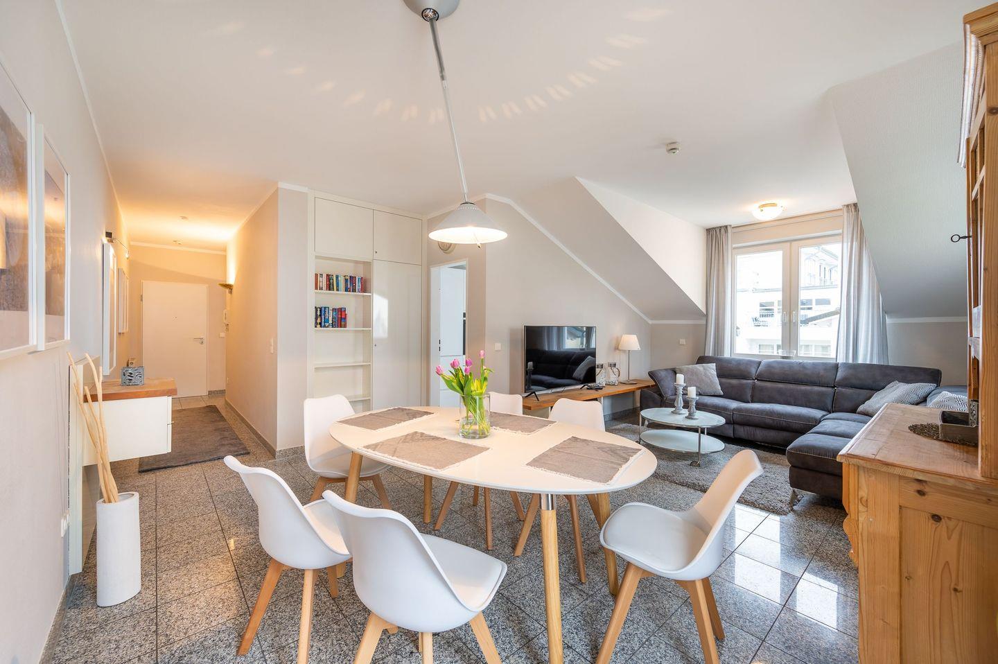 Viel Platz und Möglichkeiten - das Appartement verfügt über 2 Schlafzimmer, einem Duschbad, ein geräumiges Wohnzimmer mit Zugang zum ruhig gelegenen Balkon und natürlich Smart-TV, dem Essbereich, sowie eine separate, vollständig eingerichtete, hochwertige Nolte Küche.