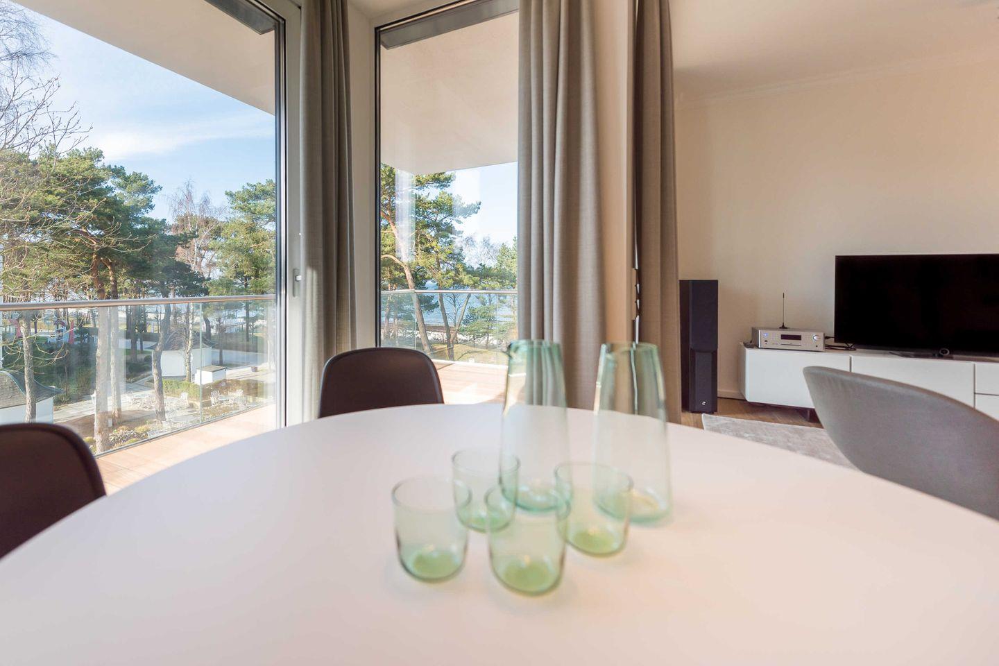 Vom hellen Wohnbereich, puristisch eingerichtet mit Möbeln von Poliform ,gelangen Sie auf den großzügigen und natürlich bestückten Balkon, von der Sie nicht nur den phantastischen Blick auf die Ostsee, den Kreidefelsen und auf die Seebrücke - sondern auch an kälteren Tagen noch den Sonnenuntergang in vollen Zügen genießen können.