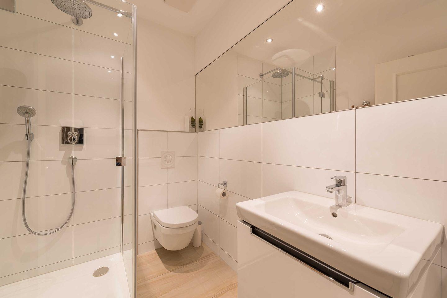 hochwertiges Duschbad mit ebenerdiger Dusche inkl. Echtglasduschabtrennung, Regendusche, Fön und hochwertiger Badkeramik von Villeroy & Boch,