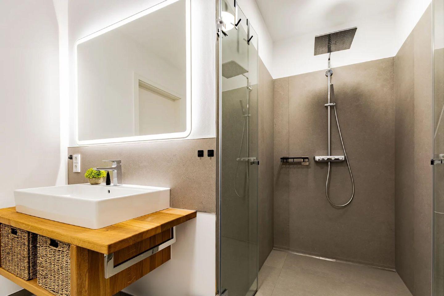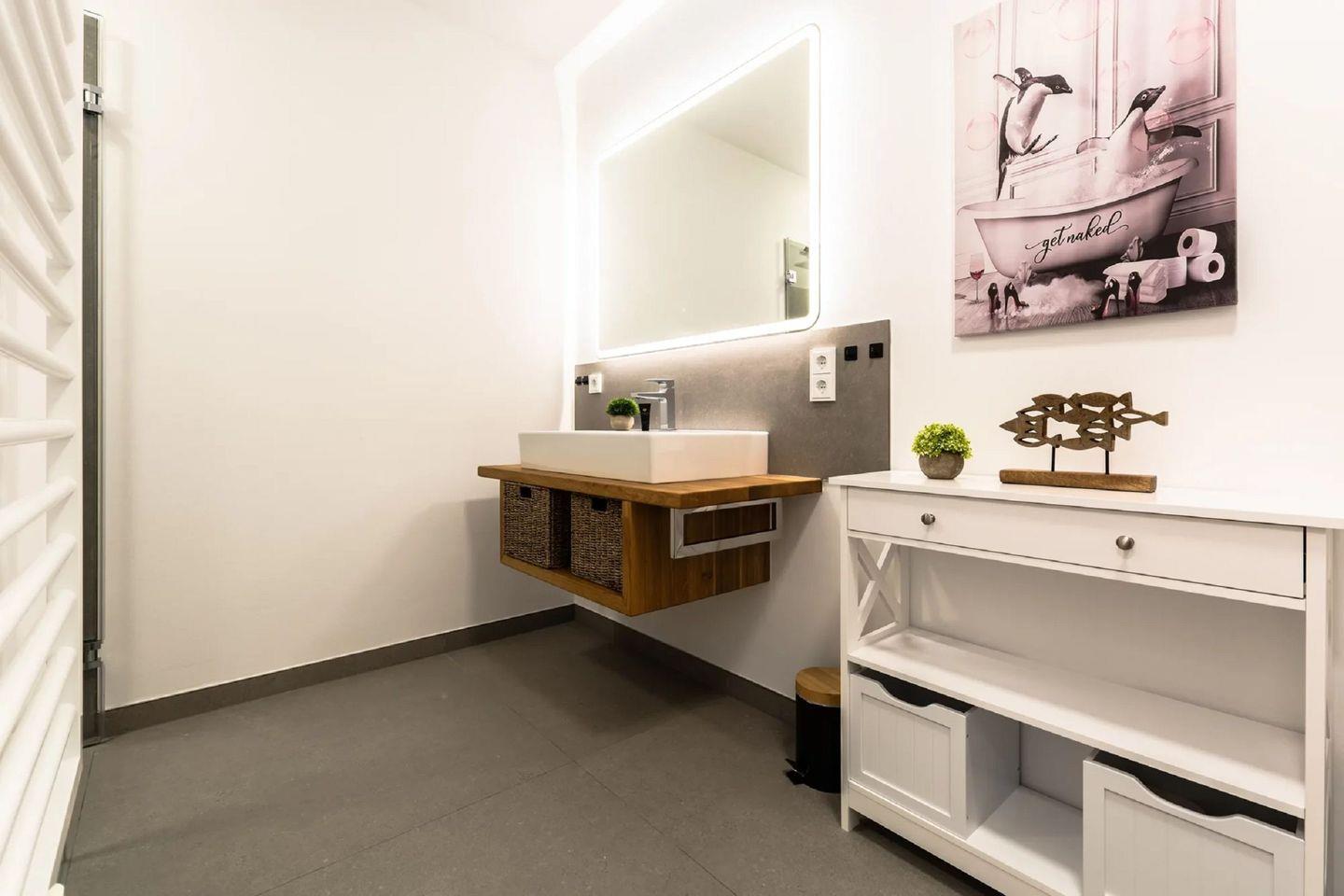 Die beiden großzügigen Badezimmer sind jeweils ausgestattet mit ebenerdiger Regendusche, großem beleuchteten Spiegel, Handtuchwärmer und edlen Armaturen.