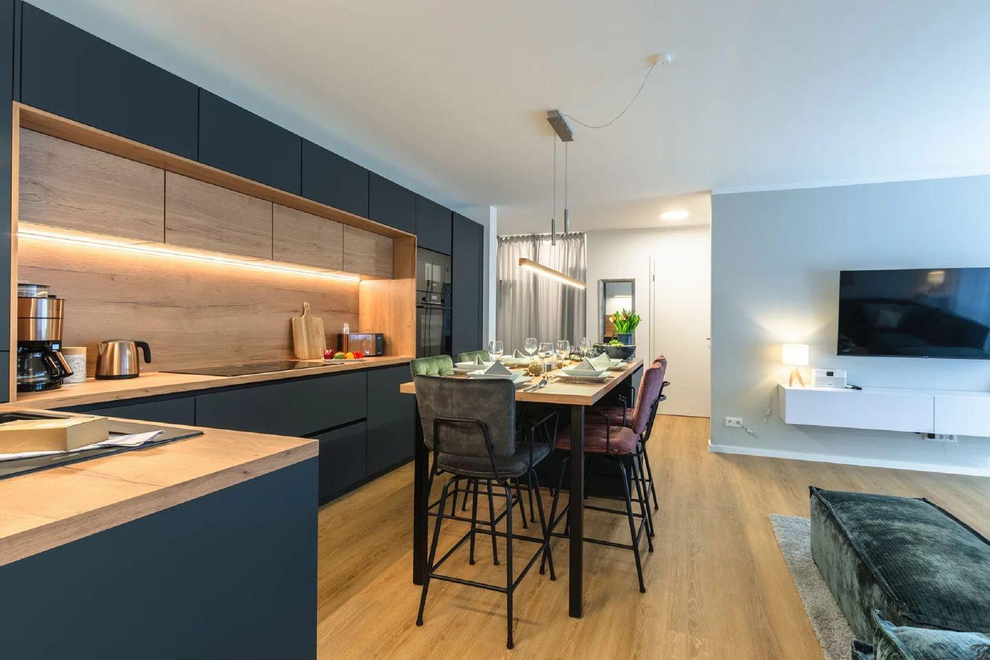 Die offene Premium-Küche ist nahtlos in den Wohnbereich integriert und lässt keine Wünsche offen: Induktionsherd mit integriertem Dunstabzug, Backofen, Mikrowelle, Kühl- und Gefrierkombination, Geschirrspüler, Toaster, Wasserkocher und eine Filterkaffeemaschine mit Mahlwerk. Perfekt für gemeinsame Kochabende – vom ausgiebigen Frühstück bis zum Gourmet-Dinner.