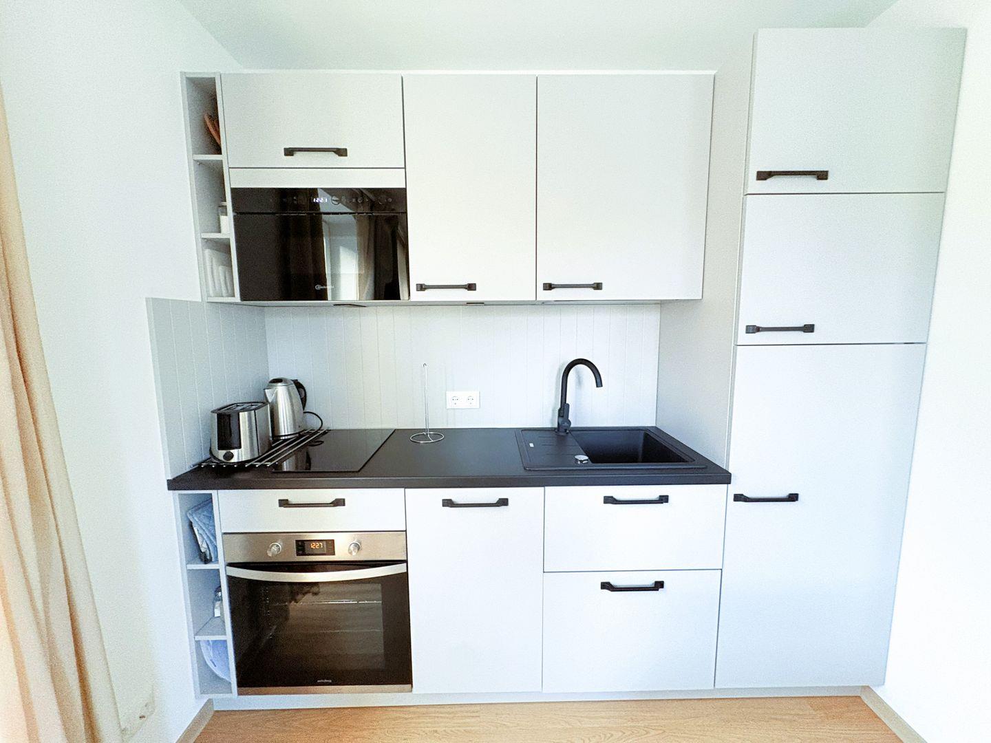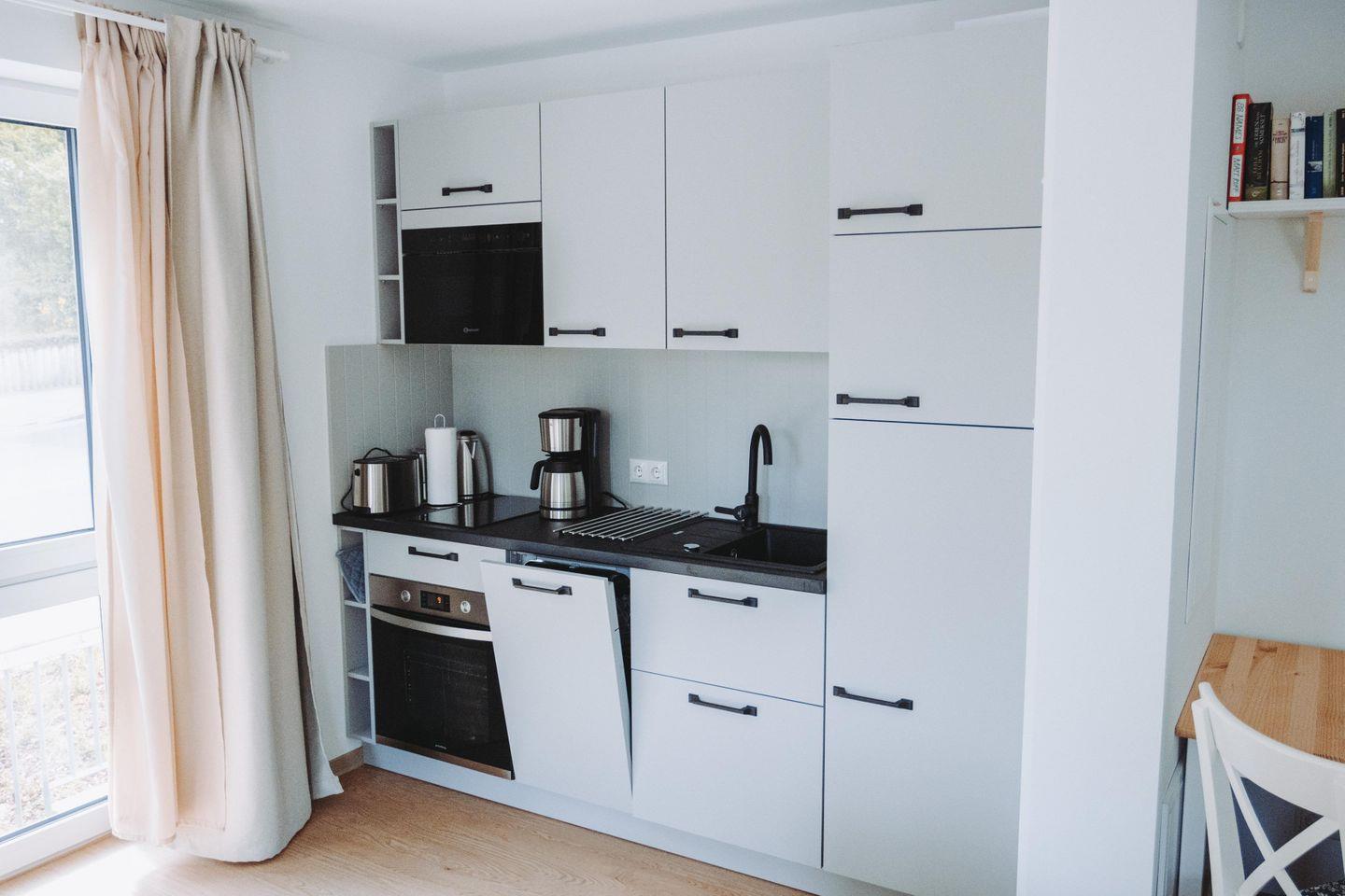 Küchenzeile mit Kühlschrank, Mikrowelle & Kaffeemaschine