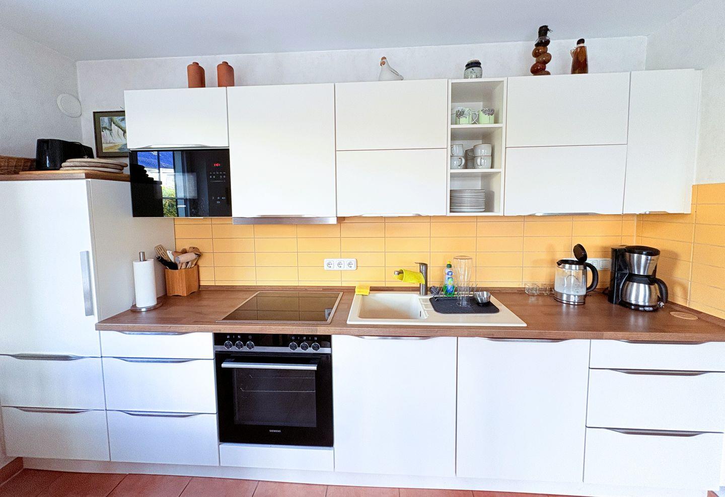 - Küchenzeile mit Ceranfeld, Mikrowelle, Kühlschrank, Geschirrspüler, Kaffeemaschine, Wasserkocher, Mixer & Toaster