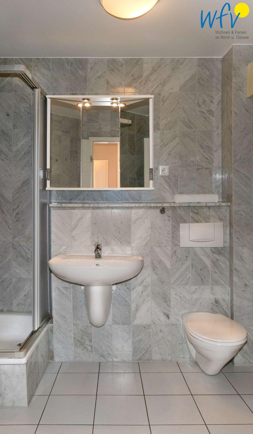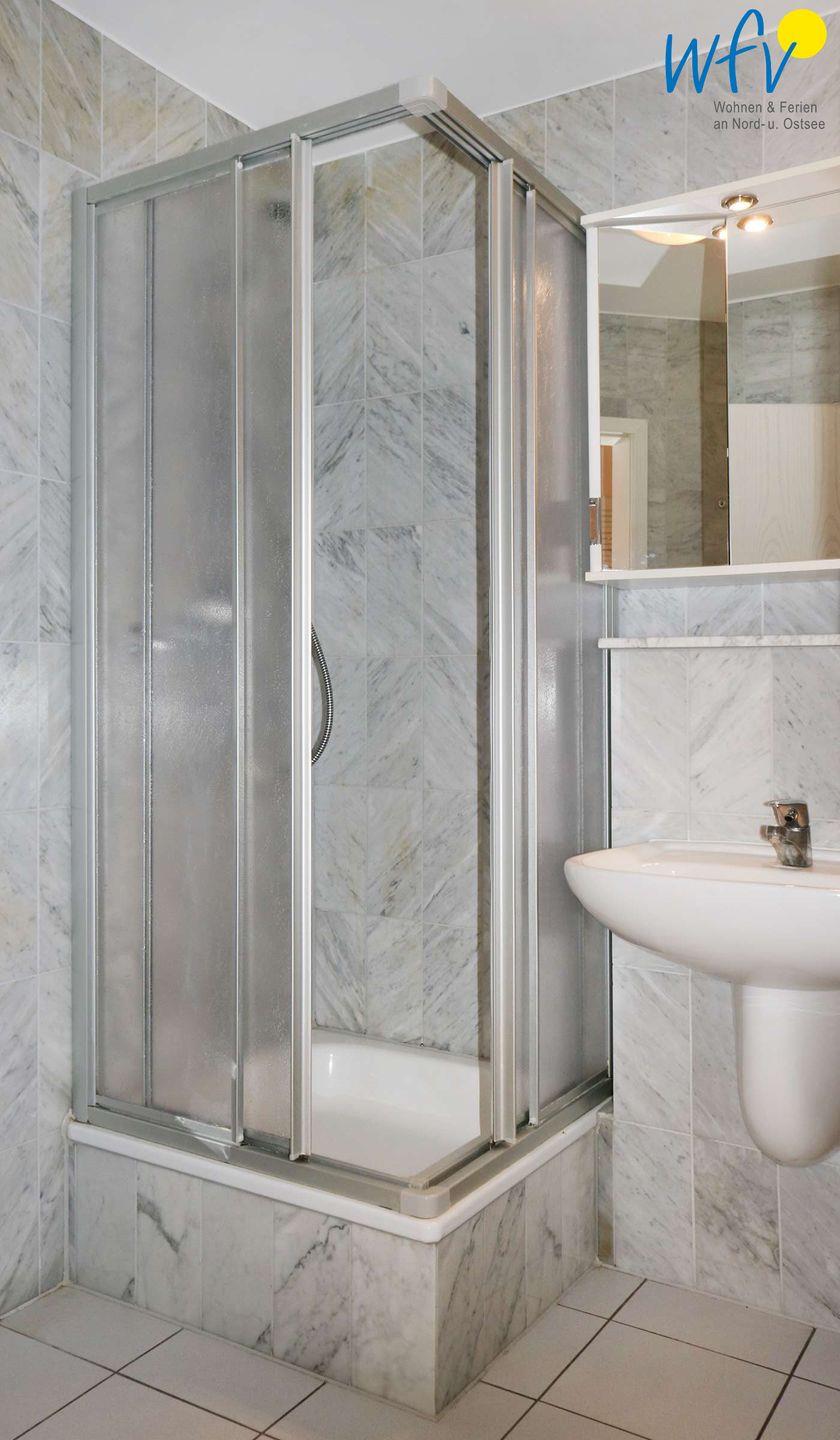 Das mit Marmor geflieste Duschbad ergänzt den Wohnkomfort der Unterkunft.