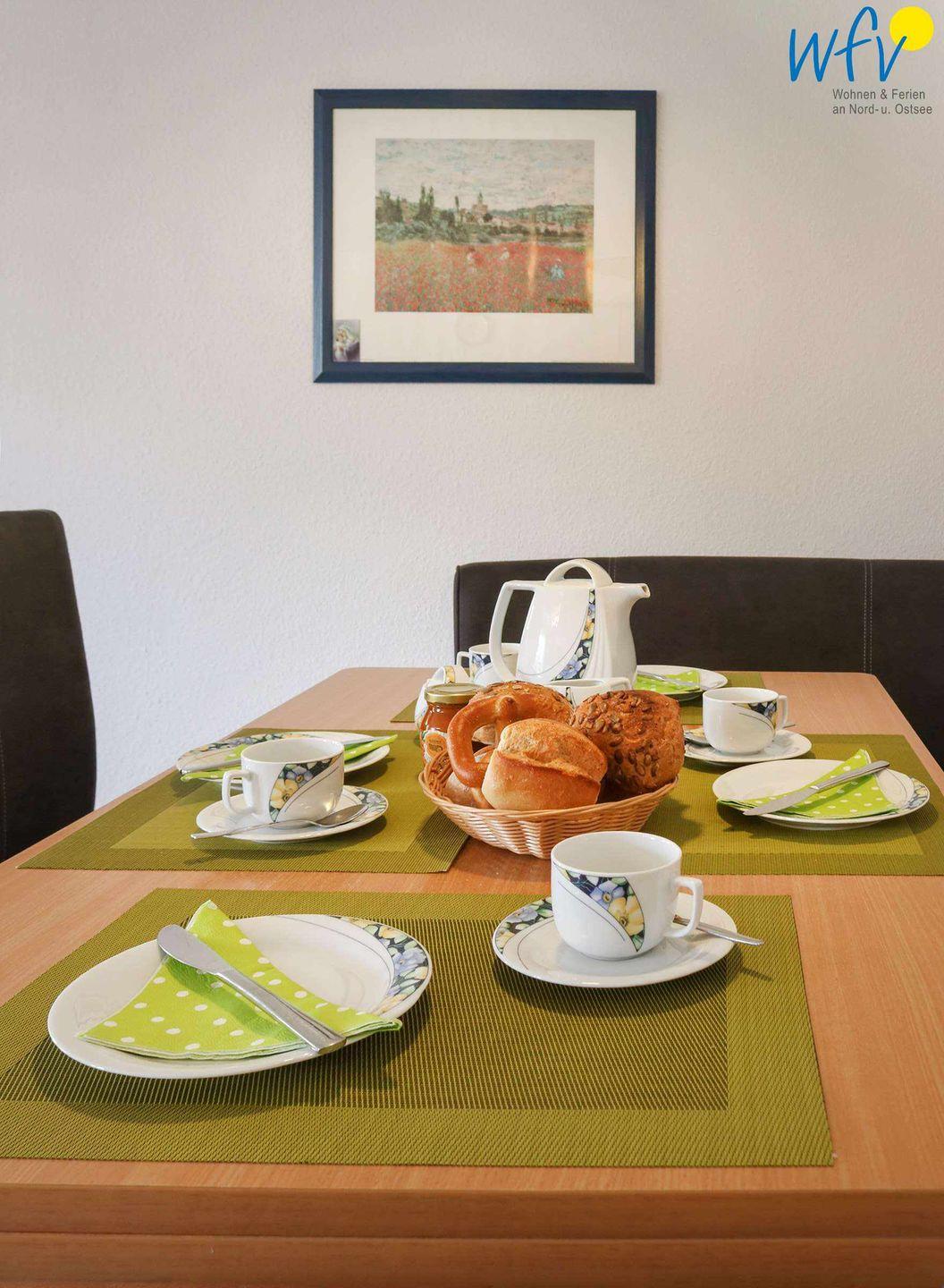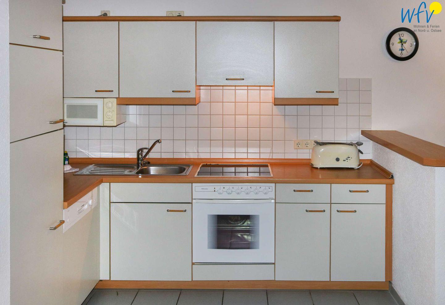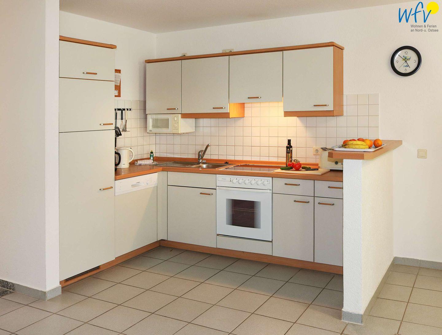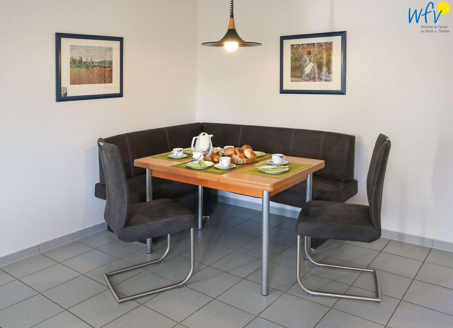 Für eine bequeme Selbstverpflegung schließt sich an den Wohnbereich eine komplett ausgestattete Küche an (u.a. mit Mikrowelle, Spülmaschine, Ceranfeld etc.). Gemeinsame Mahlzeiten können Sie an dem großen Esstisch mit Eckbank einnehmen.