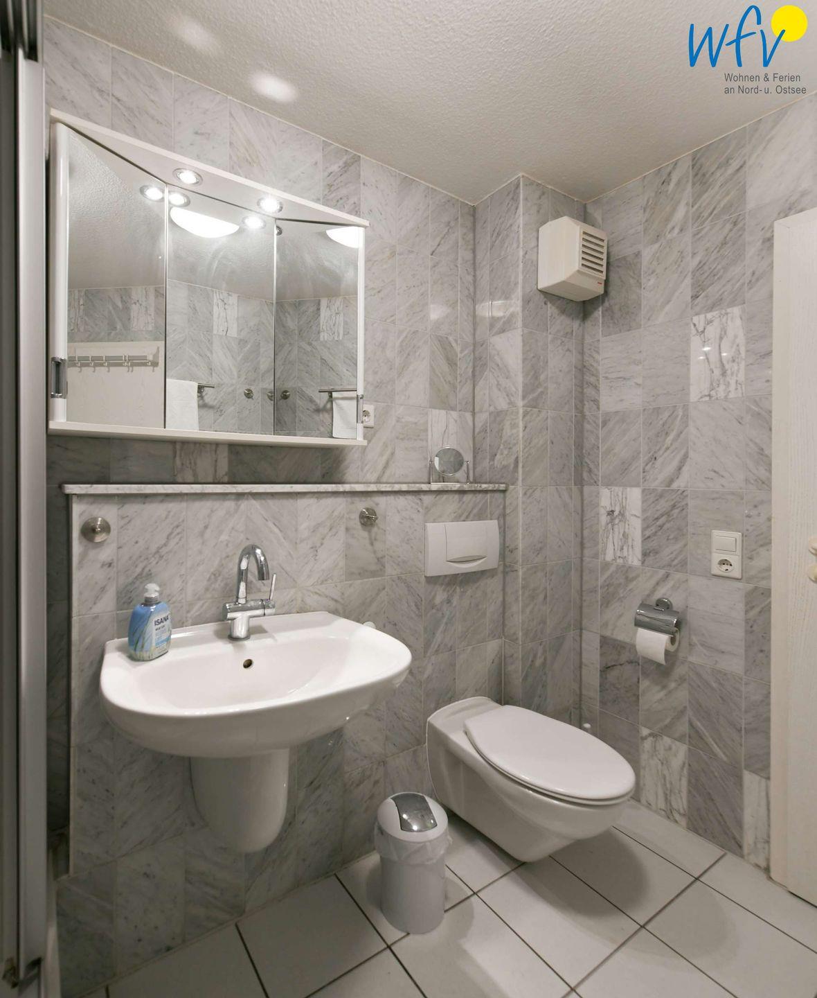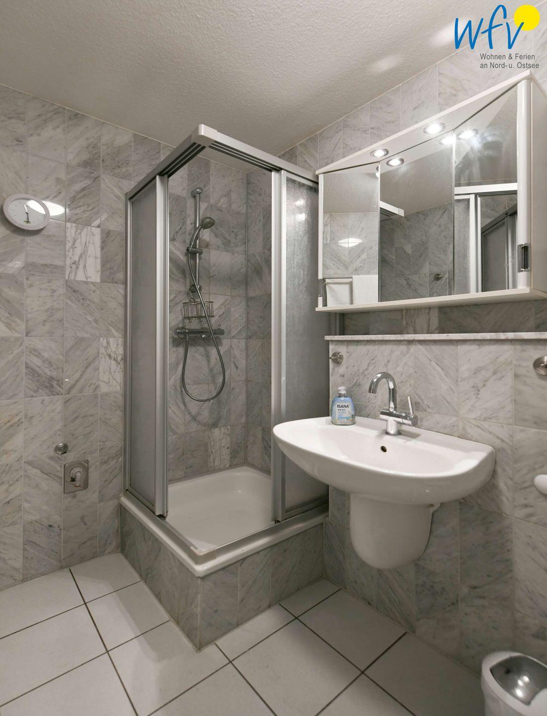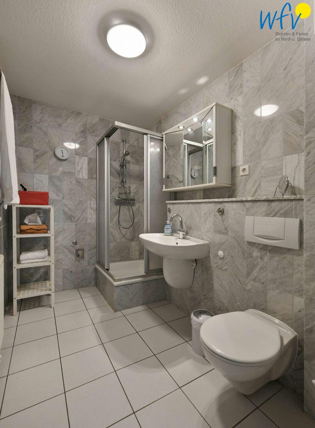 Das mit Marmor geflieste Duschbad ergänzt den Wohnkomfort.