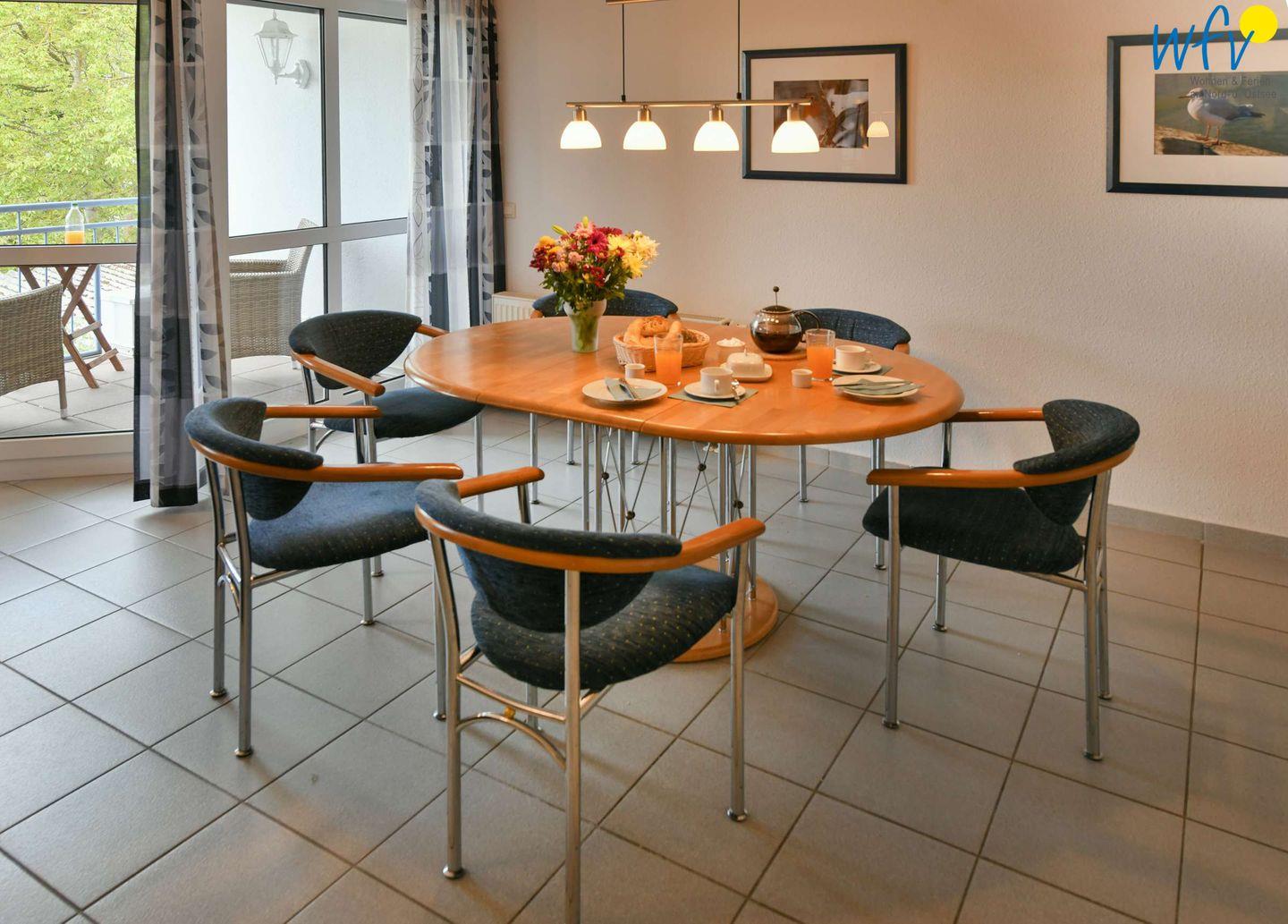 Im Essbereich befindet sich ein großer Tisch mit 6 gepolsterten Stühlen - perfekt für Mahlzeiten oder lustige Spieleabende!