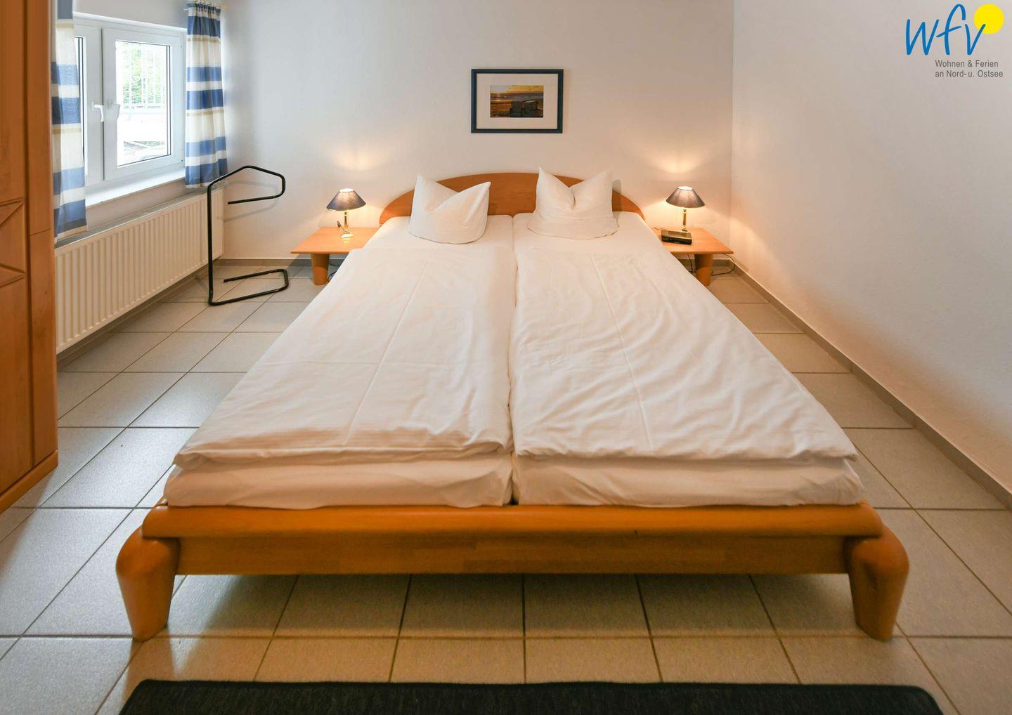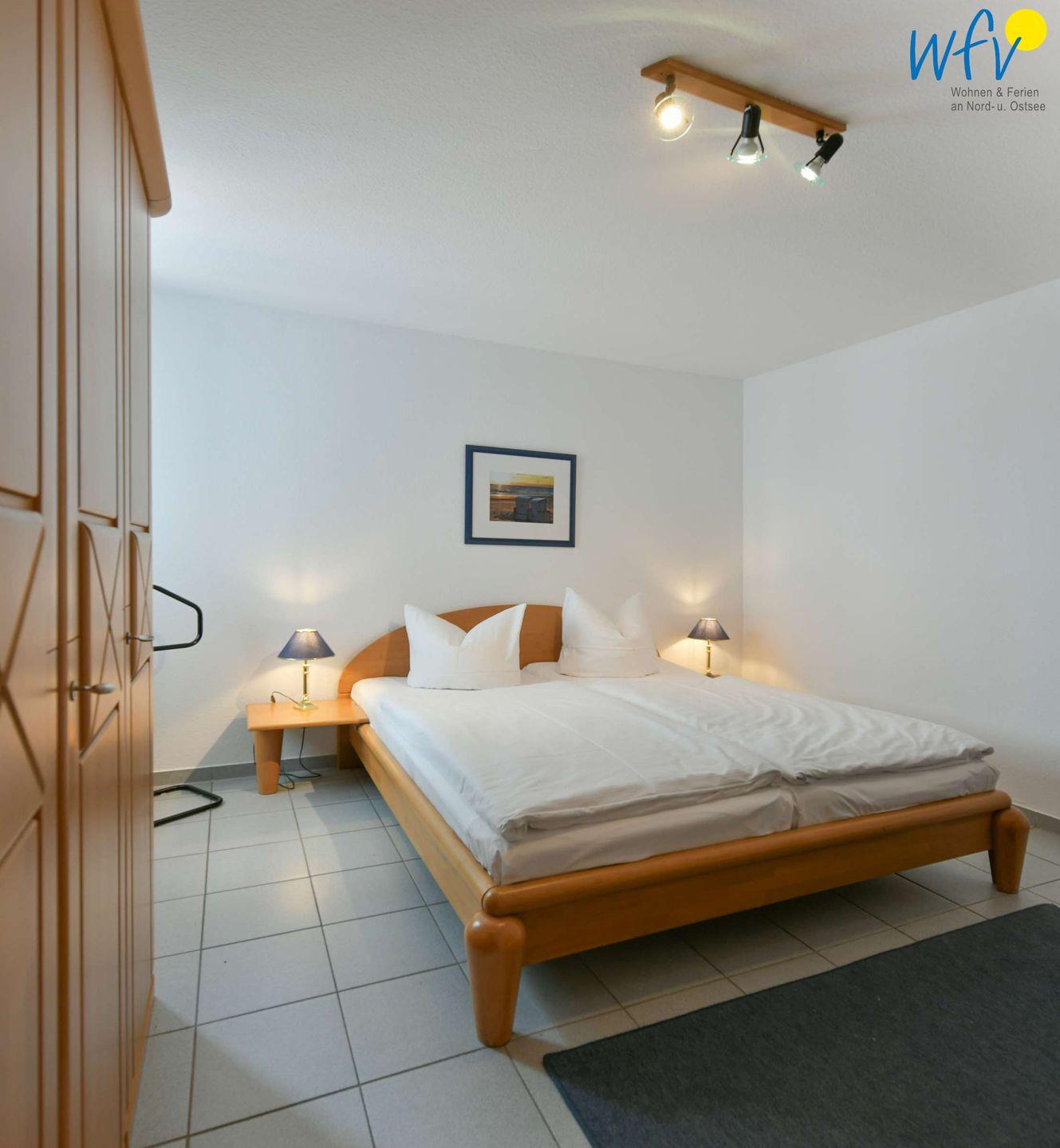Das separate Familienschlafzimmer ist mit einem Doppelbett (Liegefläche 1,80 m x 2 m) und einem Etagenbett geschmackvoll eingerichtet. Auf dem ausziehbaren Schlafsofa im Wohnbereich können zwei weitere Personen übernachten.