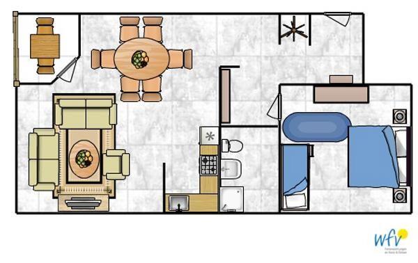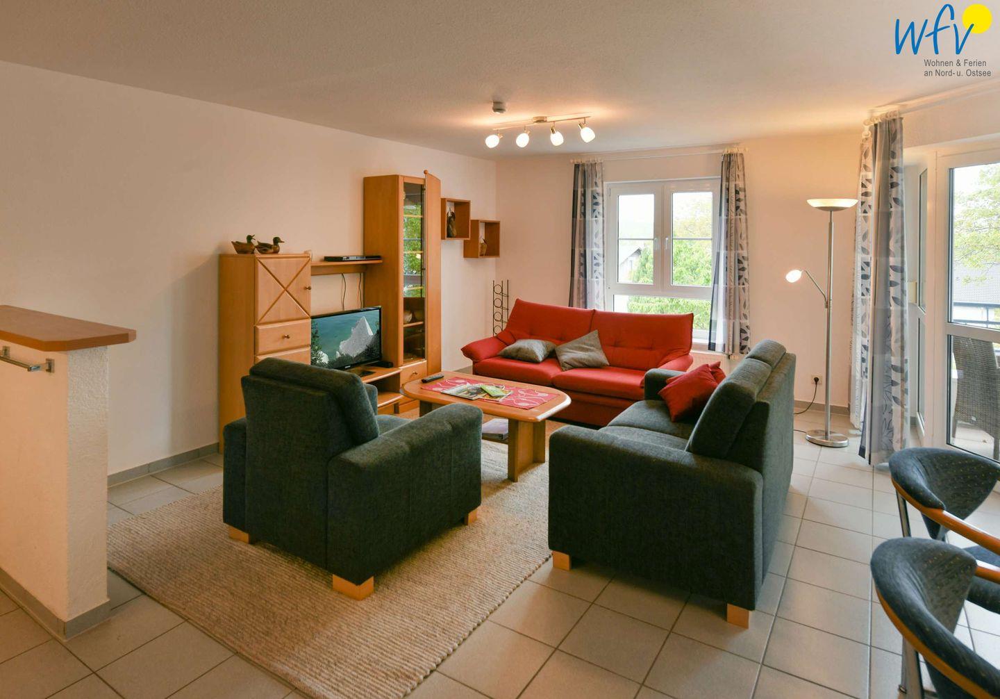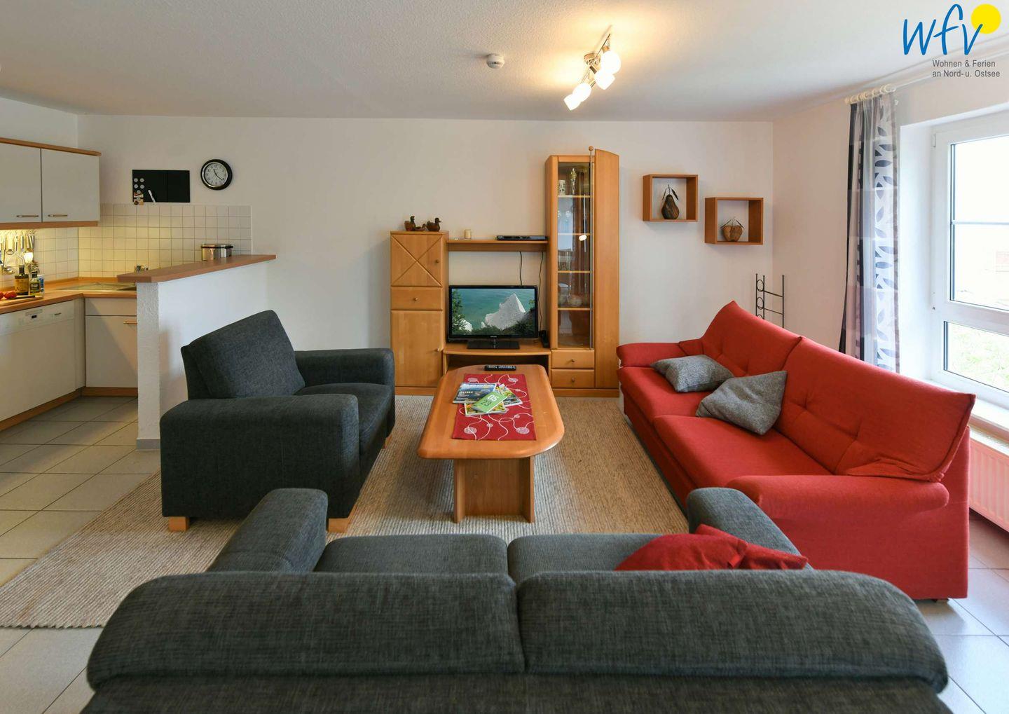Wunderbar relaxen können Sie vor allem im Wohn-/Essbereich der Ferienwohnung! Es erwartet Sie eine gemütliche Couchecke mit modernem TV (LED-Fernseher mit Kabelanschluss) und DVD-Player. Zudem steht Ihnen kostenlos freies WLAN zur Verfügung.