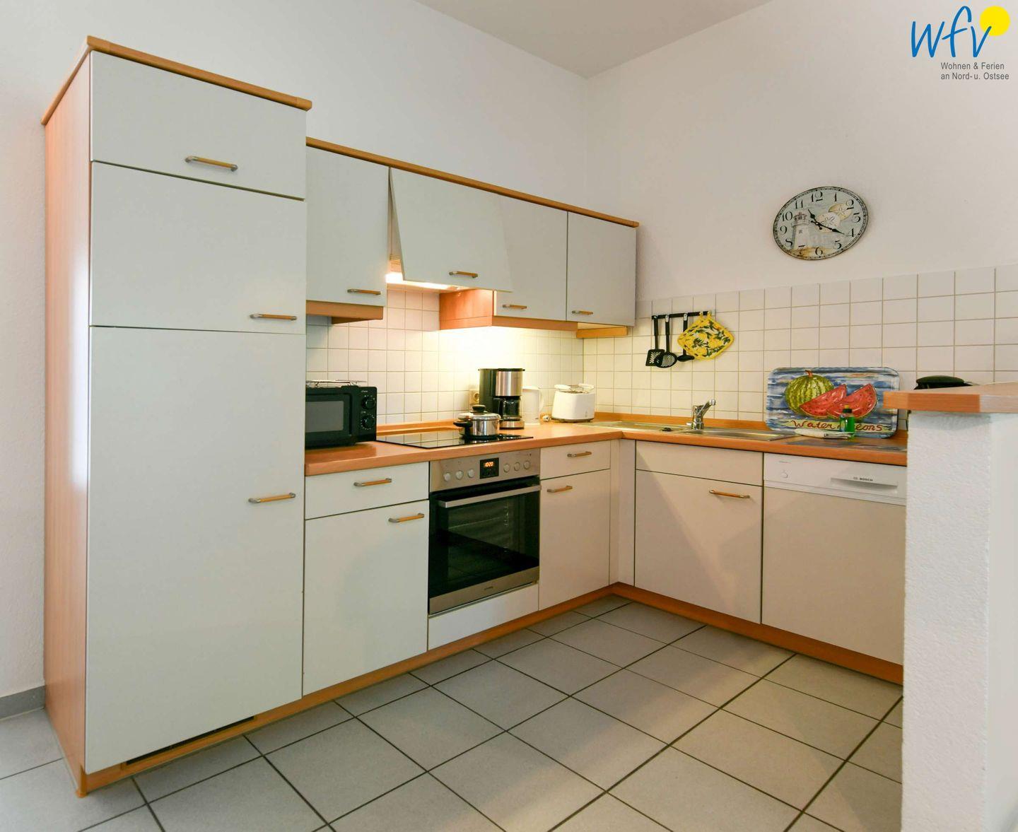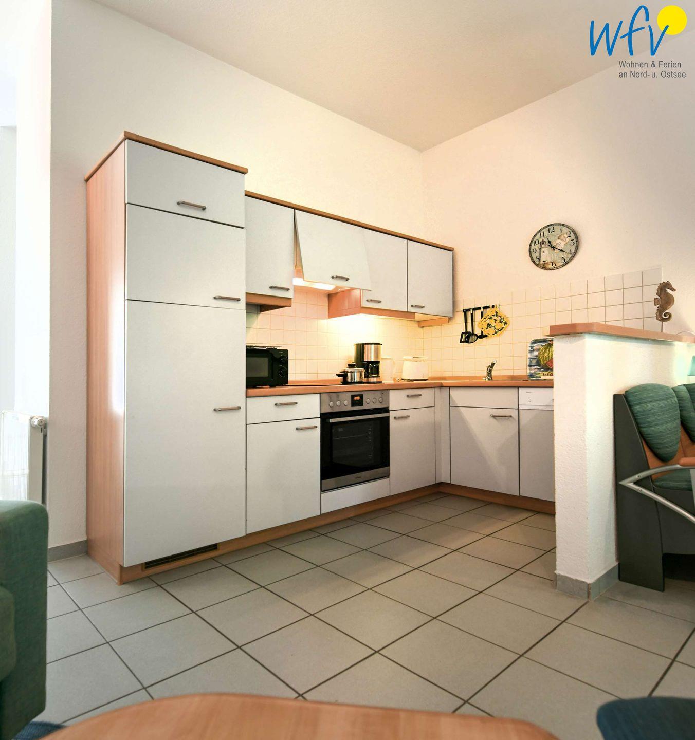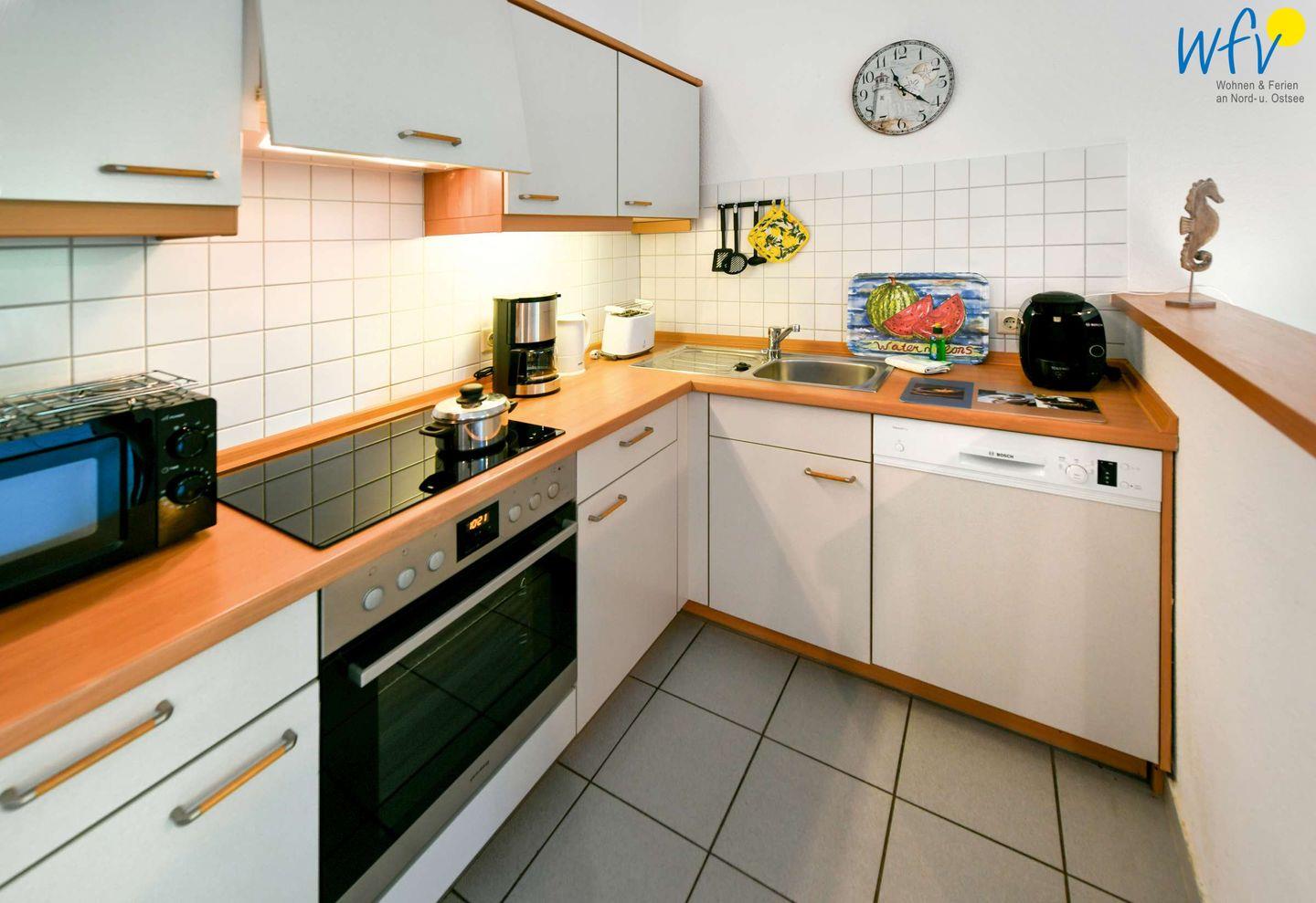 An den Wohnraum schließt sich eine offene Küche an (u.a. mit Mikrowelle, Spülmaschine, Ceranfeld etc.), sodass Sie sich bequem selbst verpflegen können.