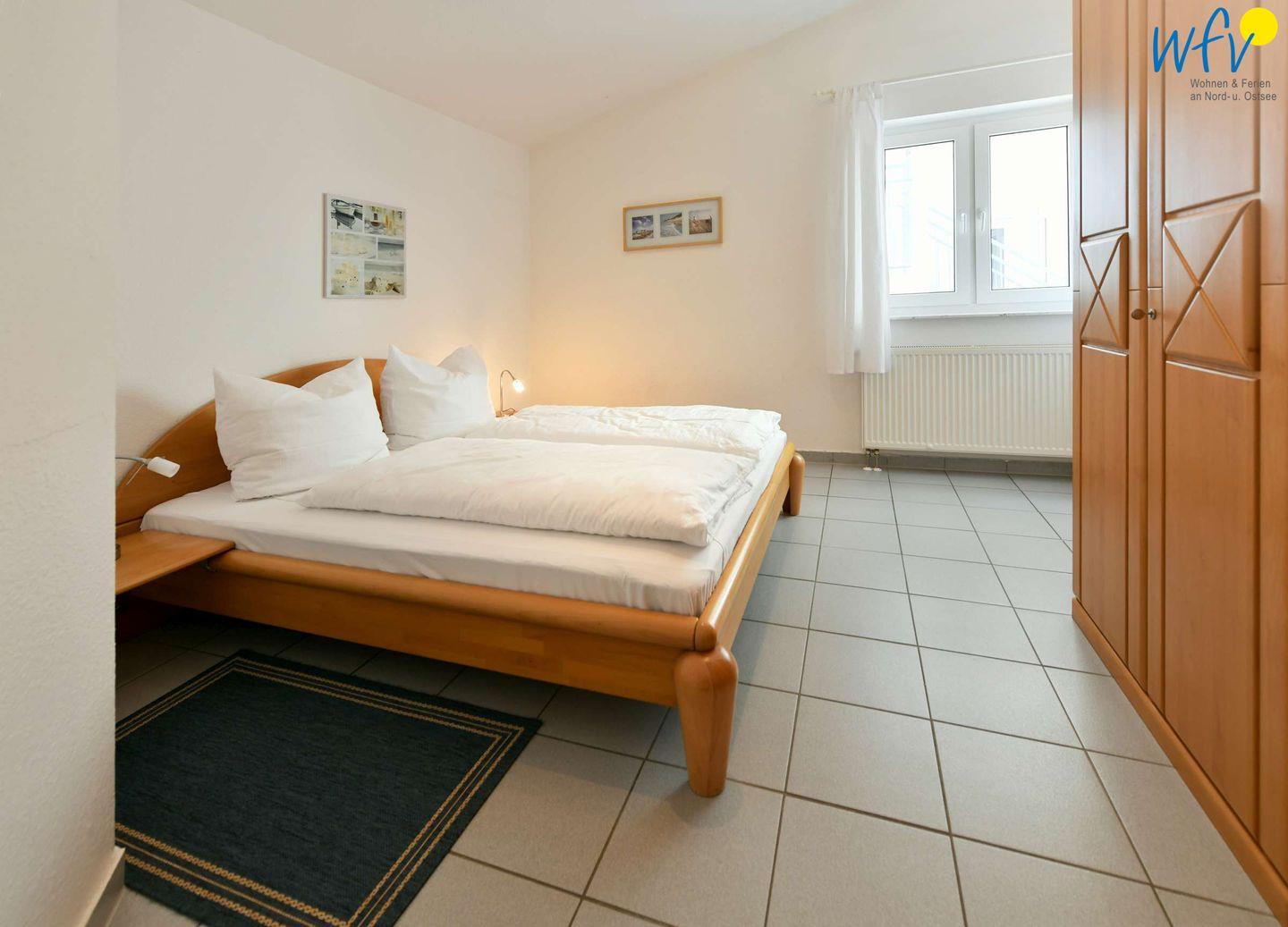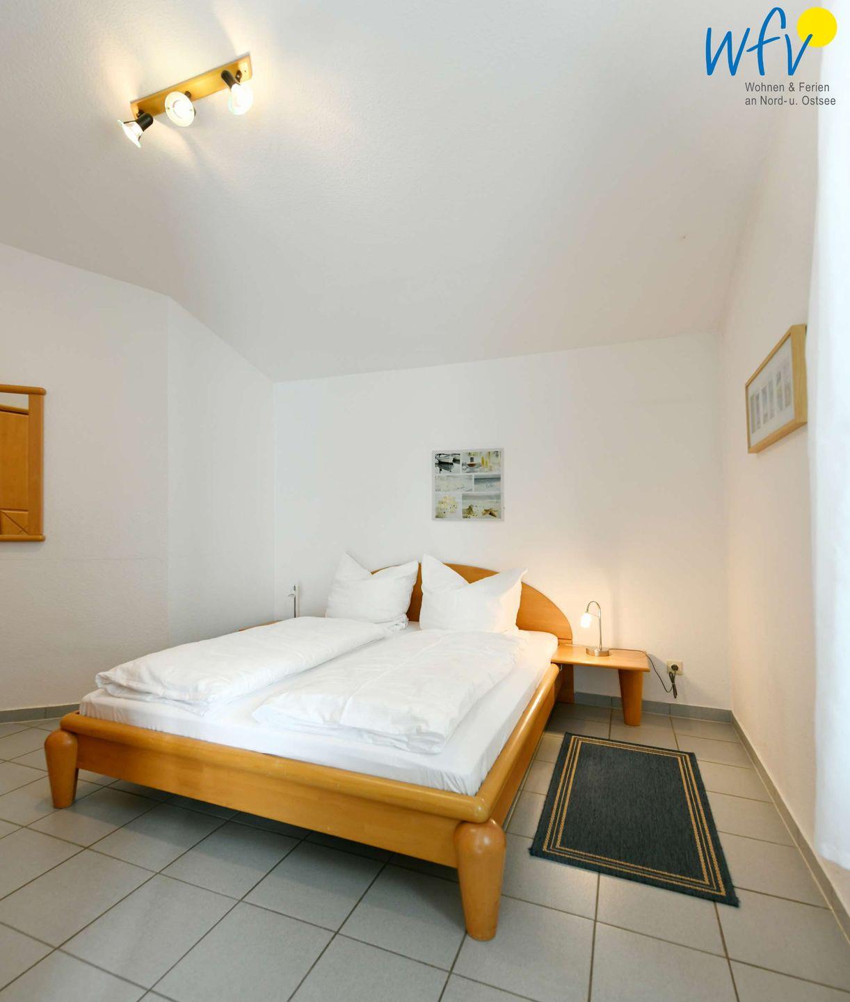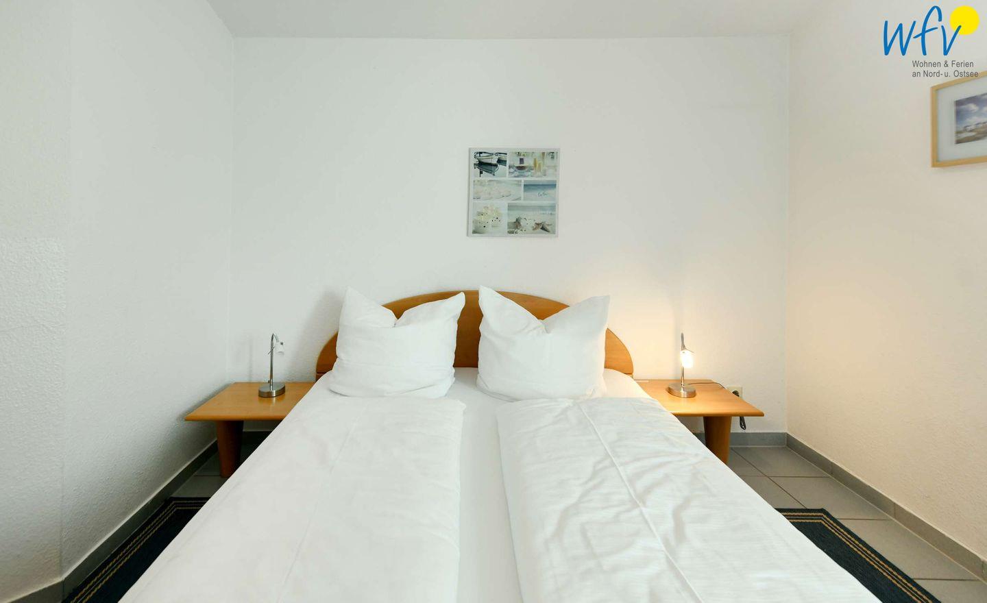 In dem separaten Schlafzimmer befindet sich ein Doppelbett (160 cm x 200 cm). Zwei weitere Personen können auf der Schlafcouch (140 cm breite Liegefläche) im Wohnzimmer übernachten.