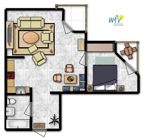 Helle Räume, stilvolles Mobiliar und eine liebevolle Einrichtung machen die Ferienwohnung zu Ihrer persönlichen Wohlfühloase! Auf 61 m² Wohnfläche erwartet Sie ein separates Schlafzimmer sowie ein großzügiger Wohn-/Essbereich mit offener Küche und ein komfortables Wannenbad. Die Ferienwohnung verfügt außerdem über zwei Balkone.