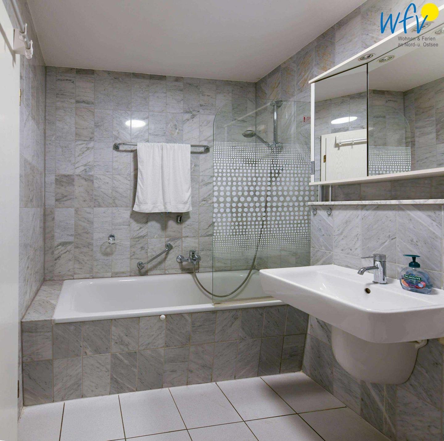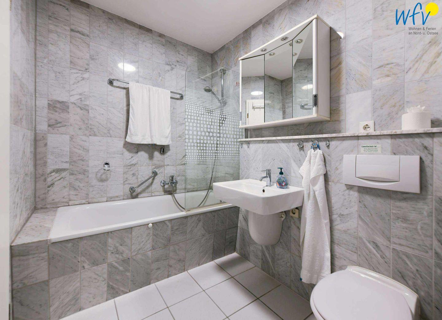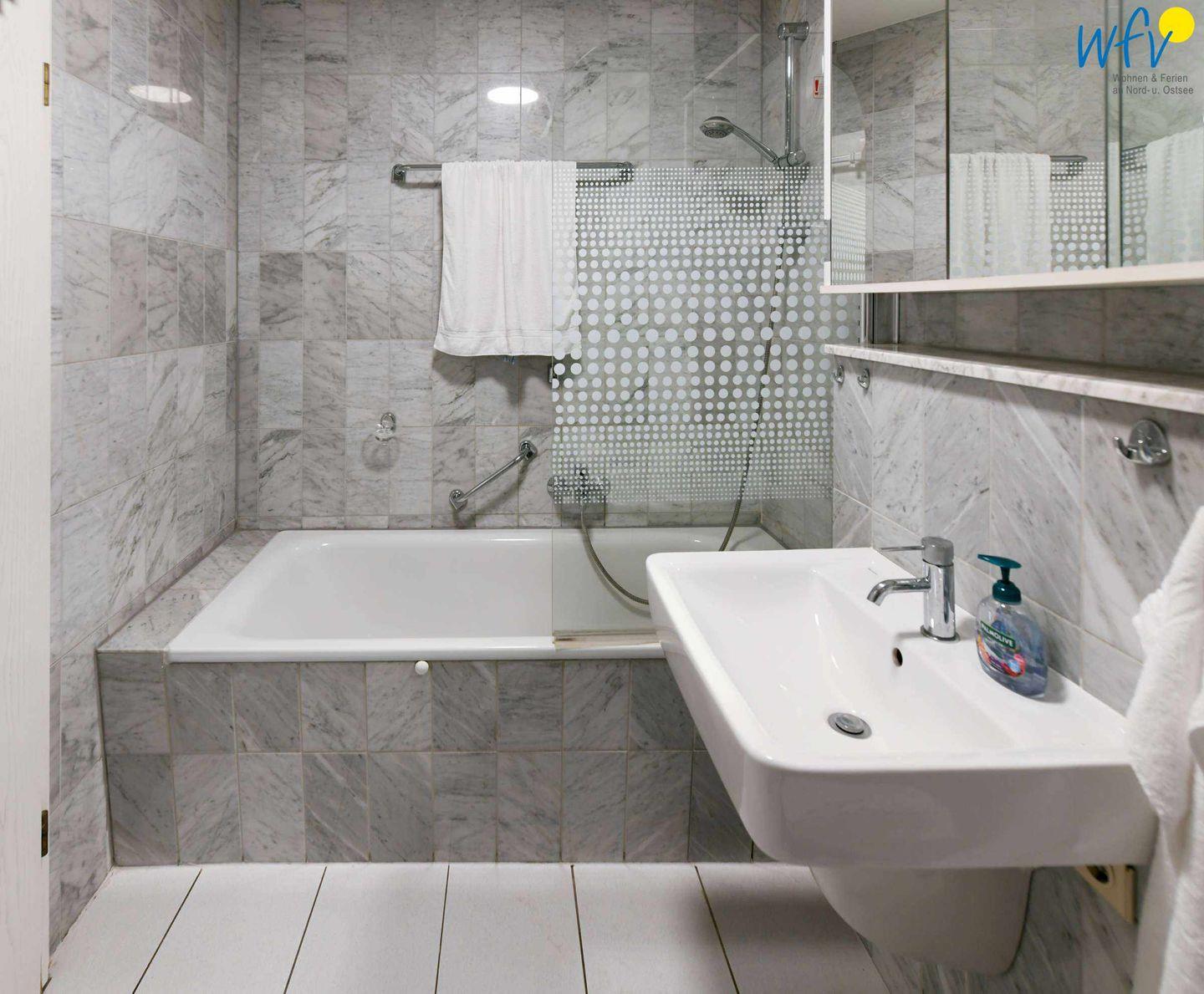 Zusätzlichen Wohnkomfort bietet Ihnen das mit Marmor ausgestattete Bad mit Badewanne. Ideal, um nach einem ausgiebigen Strandspaziergang ein wohltuendes Schaumbad zu genießen!