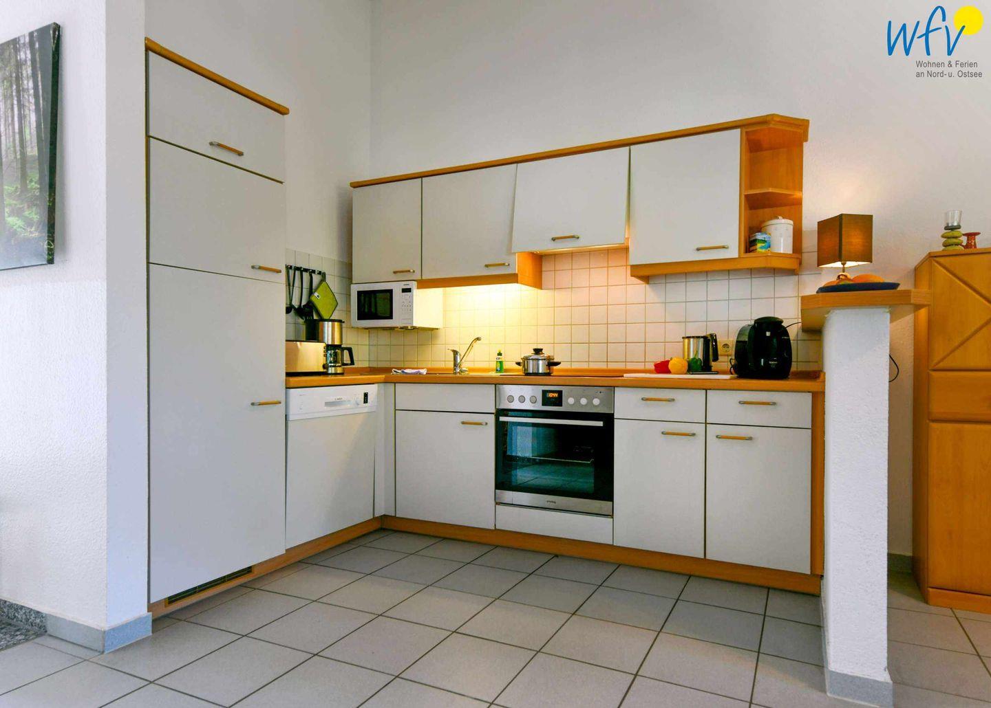 Oder möchten Sie gerne gemeinsame Kochabende verbringen? An den Wohnbereich schließt sich eine komplett ausgestattete Küche an (u.a. mit Mikrowelle, Spülmaschine, Ceranfeld etc.). Zudem befindet sich im Wohnzimmer ein großer Esstisch, an dem die ganze Familie Platz hat.