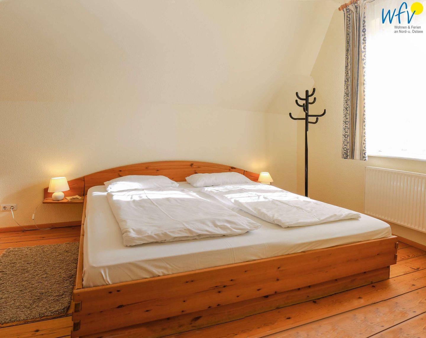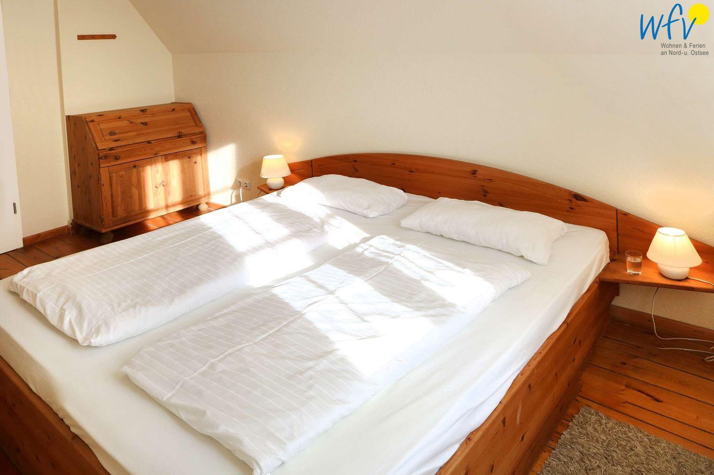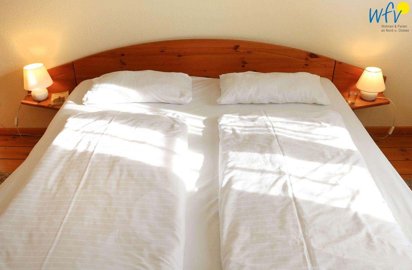 Wenn auf Rügen die Sonne untergeht, wartet in dem separaten Schlafzimmer ein komfortables Doppelbett auf Sie. Ein geräumiger Kleiderschrank bietet Platz für die Urlaubsgarderobe.