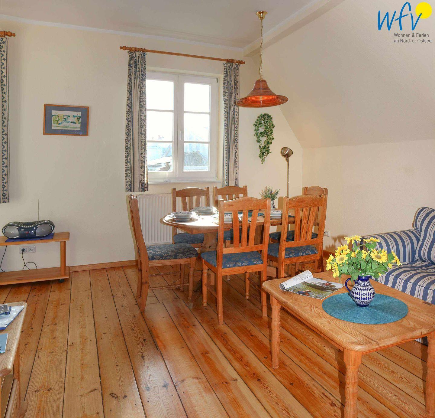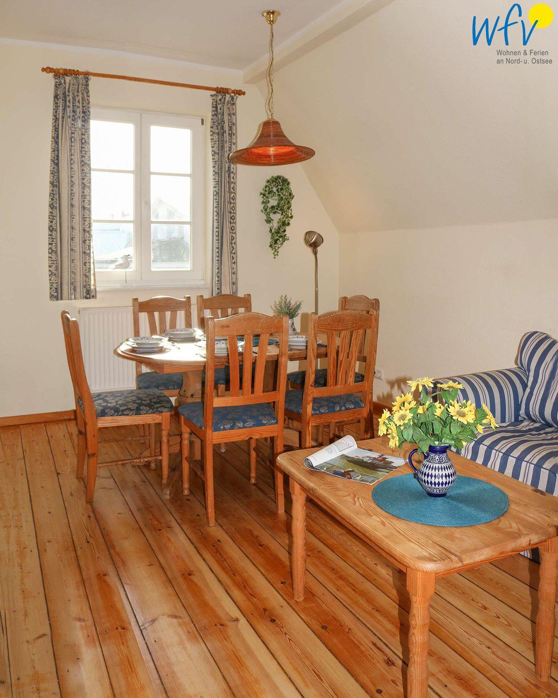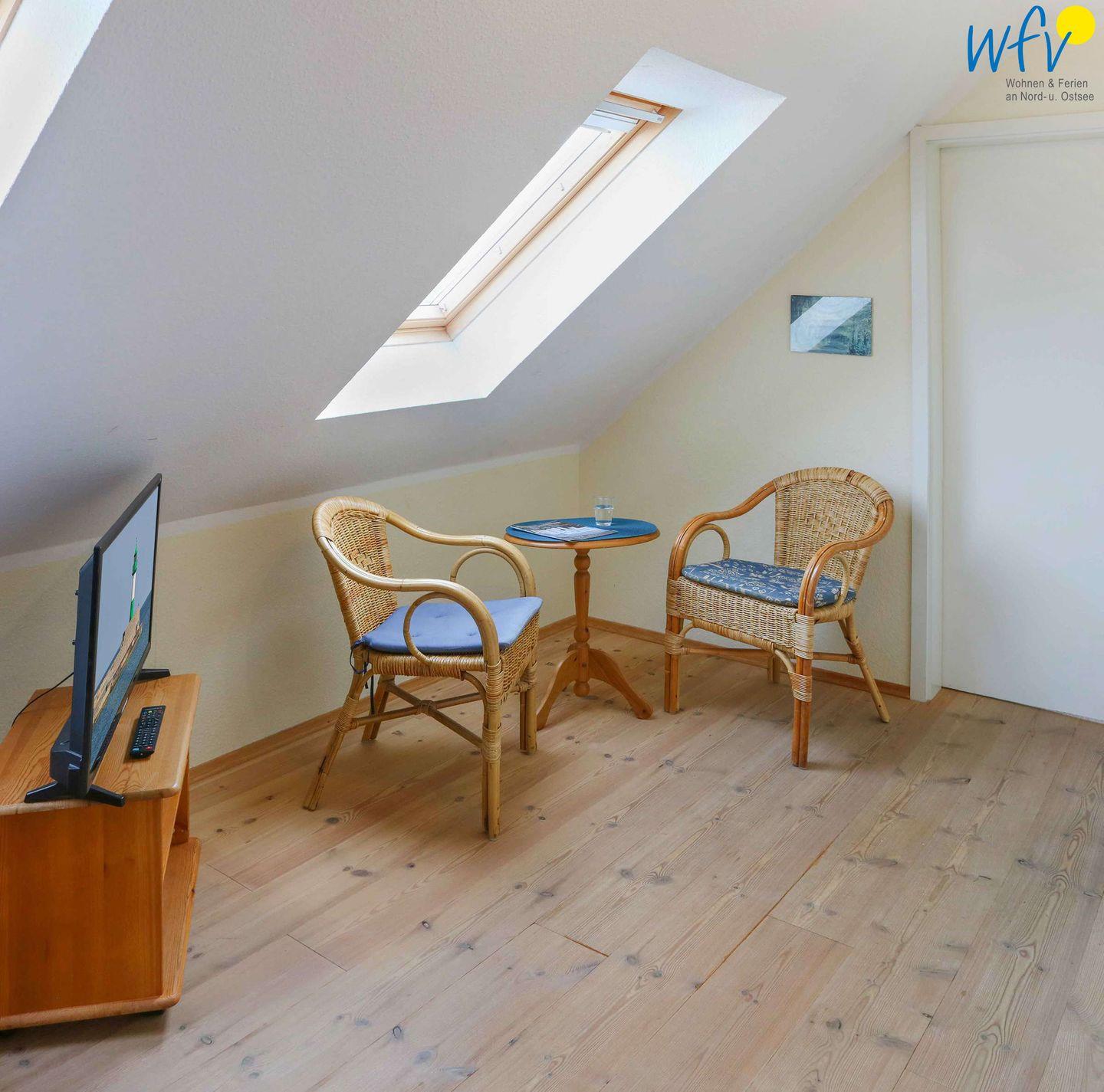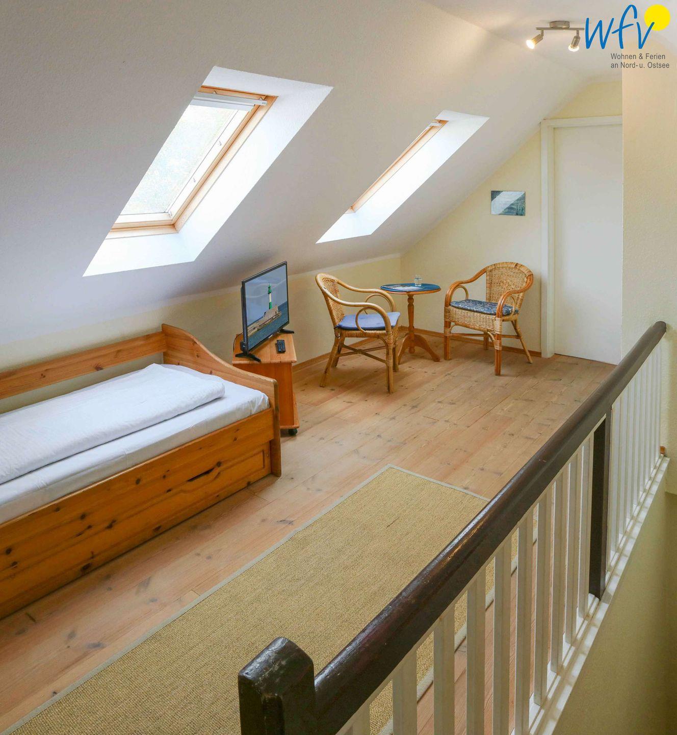 Im OG befindet sich ein Wohnzimmer mit Couchecke, Essbereich und integrierter Küche, ein Schlafzimmer mit Doppelbett (140 cm) und ein Duschbad mit WC. Das DG verfügt über ein Schlafzimmer mit einem Schlafsofa für eine Person (90 cm x 200 cm; Durchgangszimmer) und einen Schlafraum mit zwei Einzelbetten (je 190 cm x 90 cm) sowie über ein Gäste-WC. Bequeme Sitzecken in beiden oberen Schlafzimmern sorgen für gemütliche Gelegenheiten zum Lesen und Fernsehen.