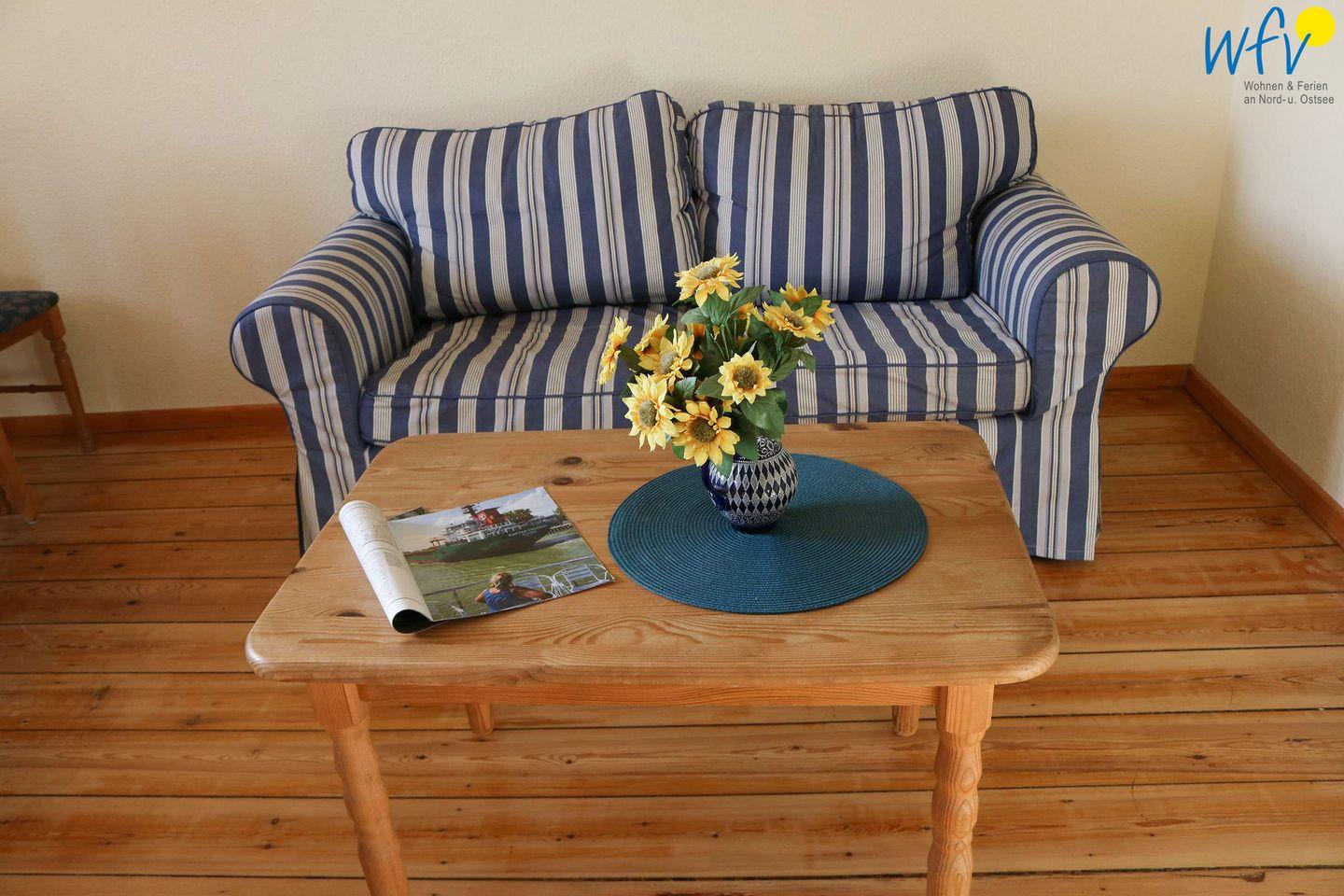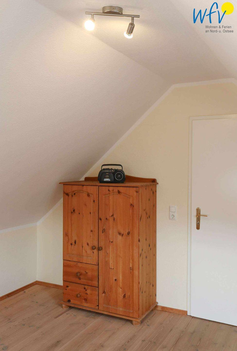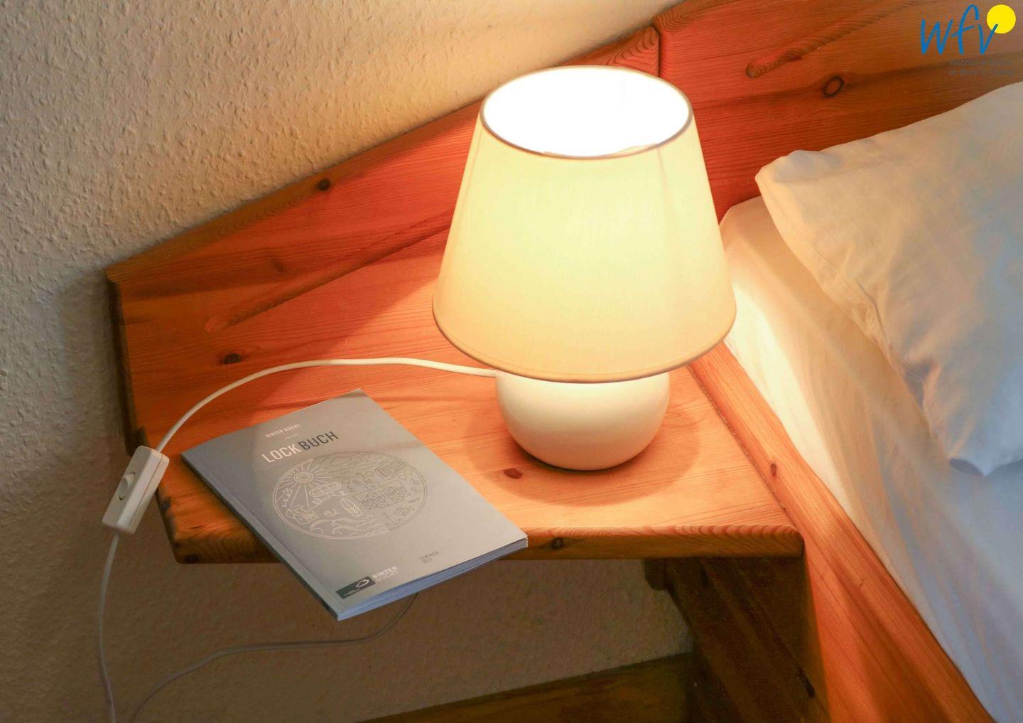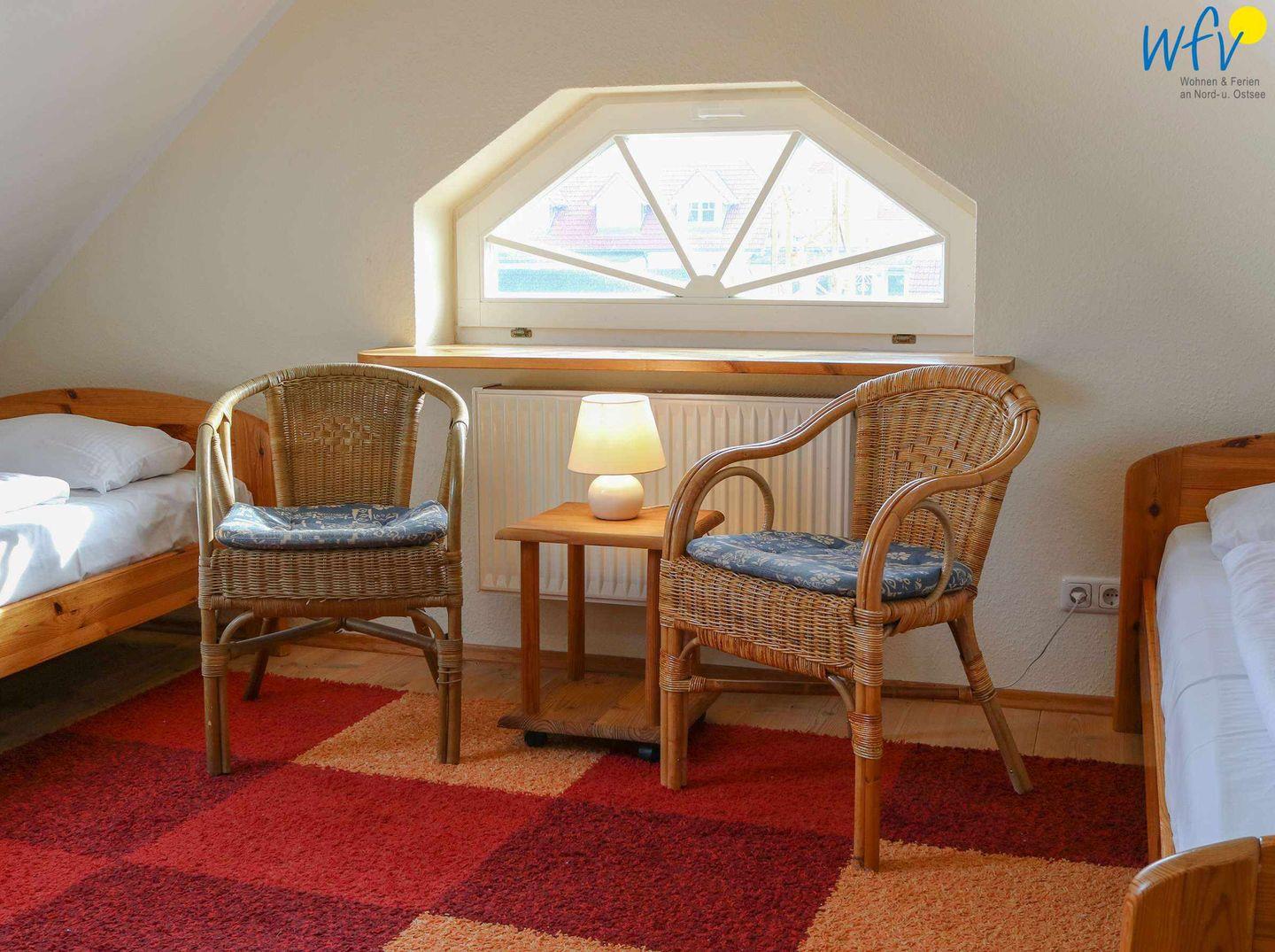 Im OG befindet sich ein Wohnzimmer mit Couchecke, Essbereich und integrierter Küche, ein Schlafzimmer mit Doppelbett (140 cm) und ein Duschbad mit WC. Das DG verfügt über ein Schlafzimmer mit einem Schlafsofa für eine Person (90 cm x 200 cm; Durchgangszimmer) und einen Schlafraum mit zwei Einzelbetten (je 190 cm x 90 cm) sowie über ein Gäste-WC. Bequeme Sitzecken in beiden oberen Schlafzimmern sorgen für gemütliche Gelegenheiten zum Lesen und Fernsehen.