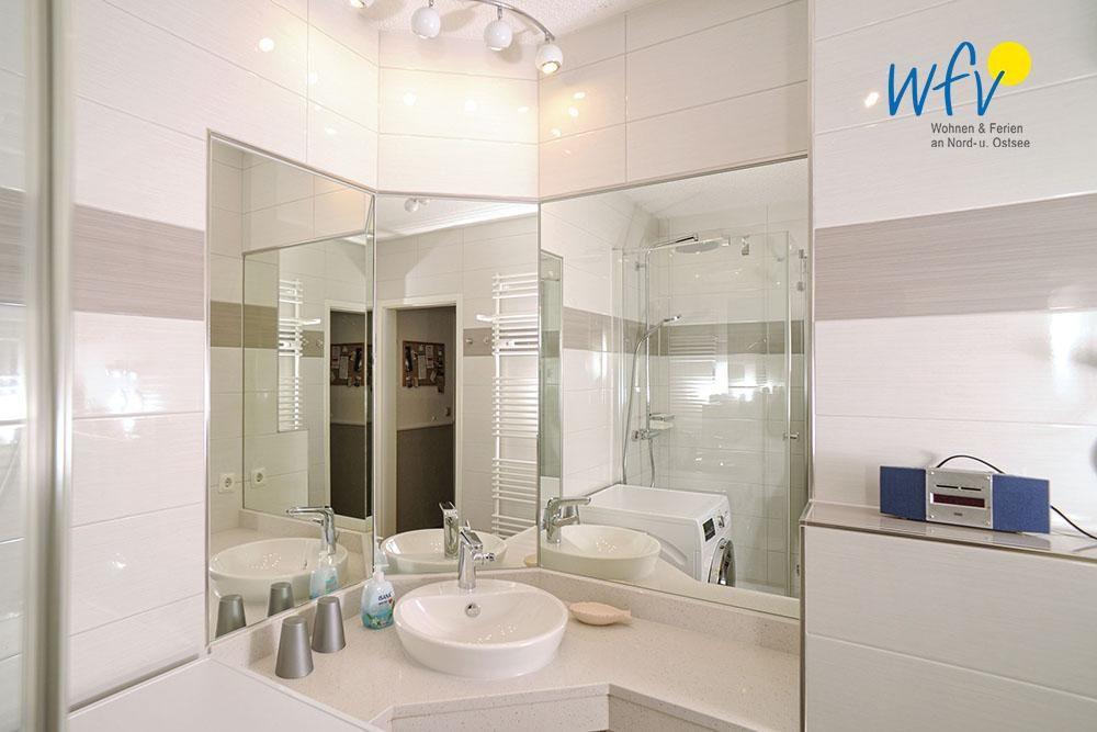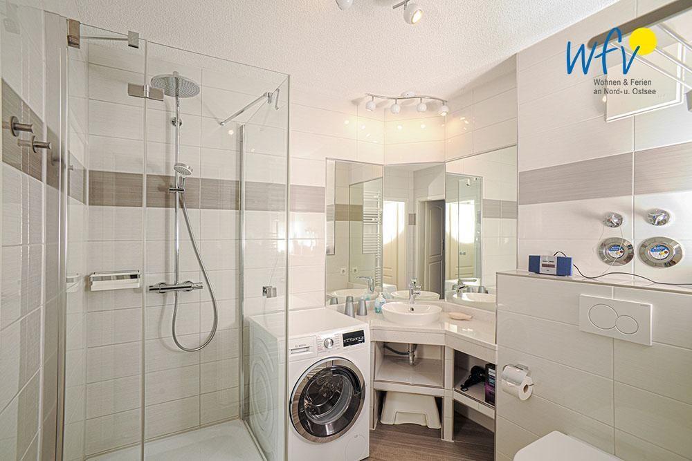 Das moderne Badezimmer mit Dusche bietet Ihnen weiteren Wohnkomfort. Gerne können Sie die hier stehende Waschmaschinen/Trocknerkombination nutzen.