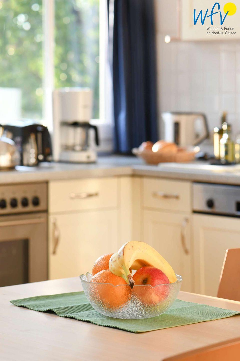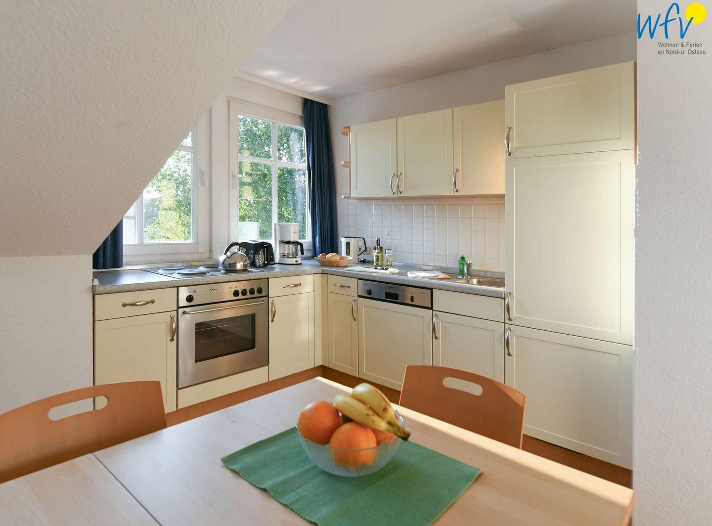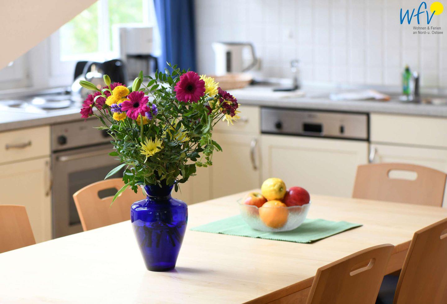 Für gemeinsame Kochabende ist die integrierte Küche komplett ausgestattet (u.a. mit Herd, Backofen und Spülmaschine). Der große Esstisch lädt zu gemeinsamen Mahlzeiten ein.