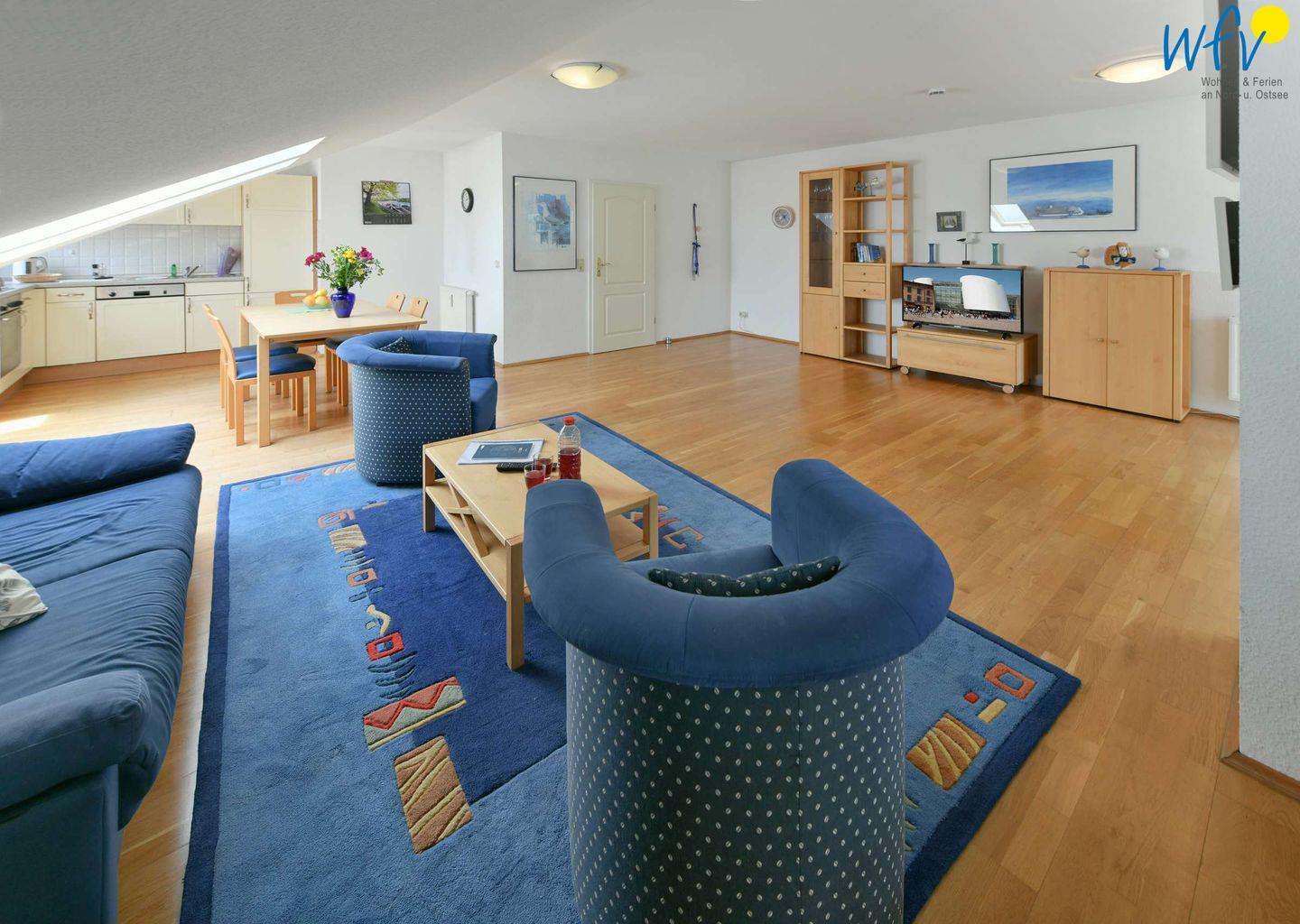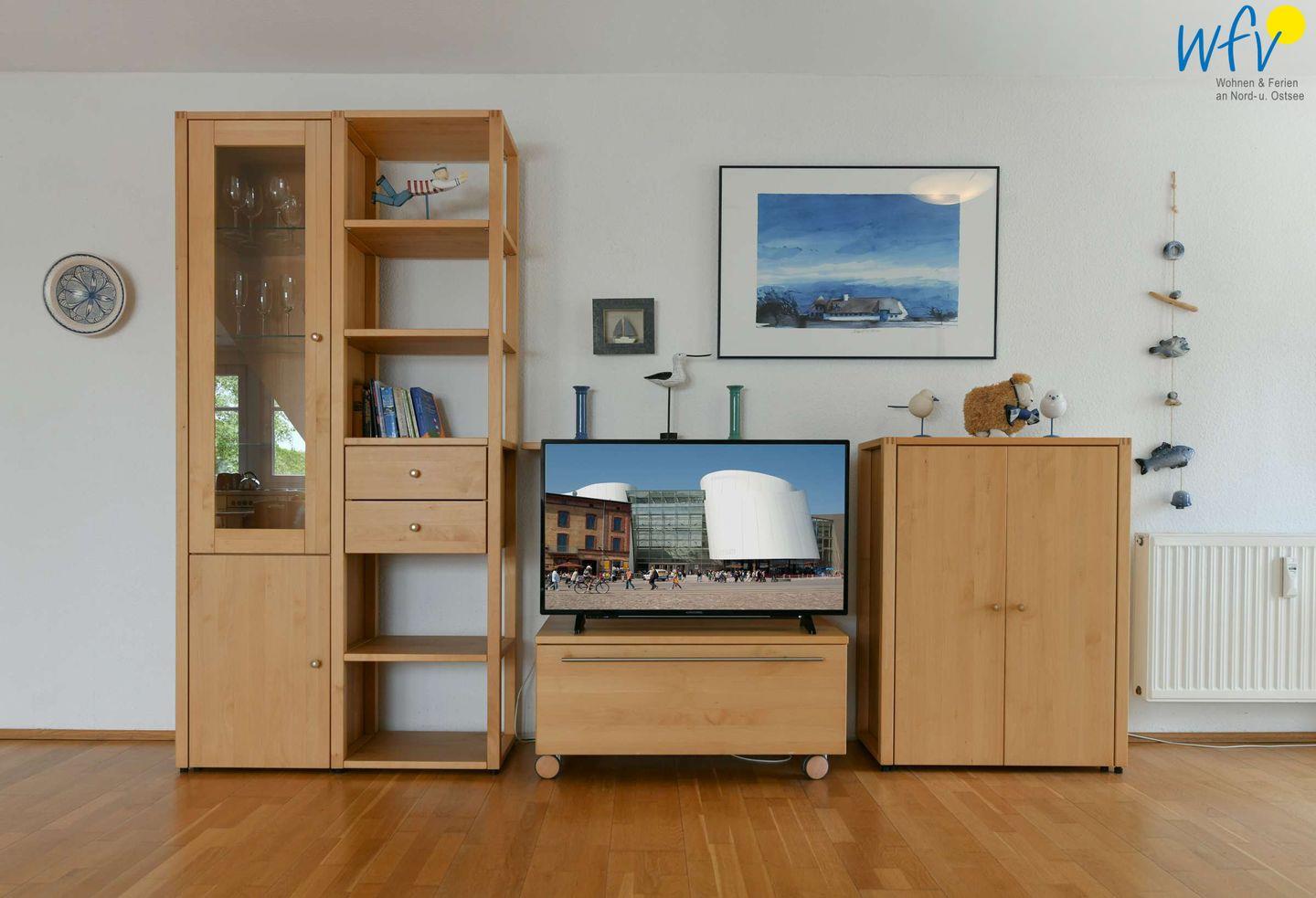 Die hochwertig und komfortabel eingerichtete Ferienwohnung empfängt Sie mit einem großzügigen hellen Wohnzimmer. Hier können Sie nach der Fahrradtour oder der Wanderung rundum entspannen. Ein modernes TV bietet Unterhaltung; zum Surfen vom Smartphone aus empfangen Sie freies WLAN.