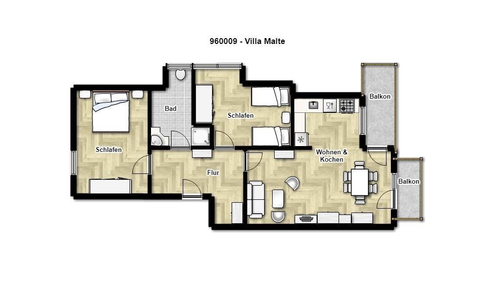 Diese komfortable Ferienwohnung mit zwei separaten Schlafzimmern, Wohnraum und zwei Balkonen garantiert Ihnen absolute Erholung! Sie ist perfekt für einen Urlaub mit bis zu fünf Personen.