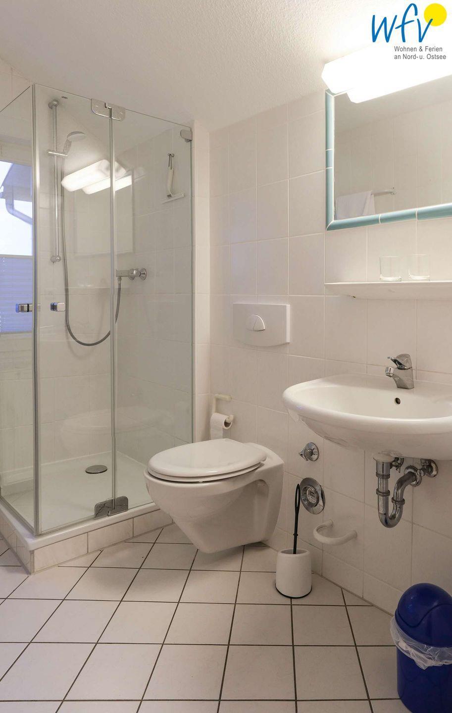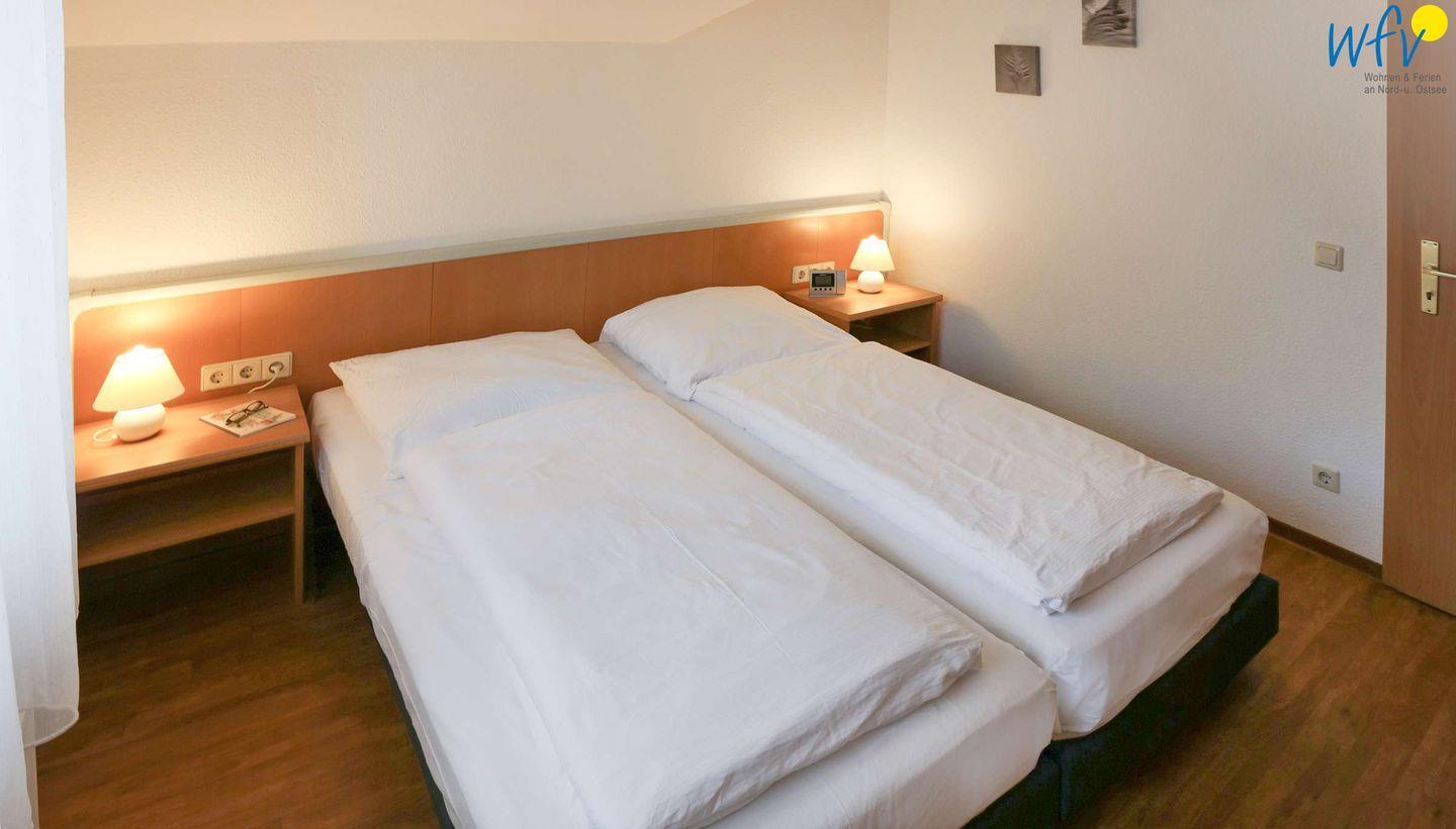 Des Weiteren verfügt die Ferienwohnung über ein separates Schlafzimmer mit Doppelbett (1,60 m x 2 m) und Kleiderschrank sowie über ein helles Tageslichtbad mit Dusche. Im Flur befinden sich eine Garderobe und ein Einbauschrank. Alle Räume gehen zentral vom Flur ab, sodass es kein Durchgangszimmer gibt.