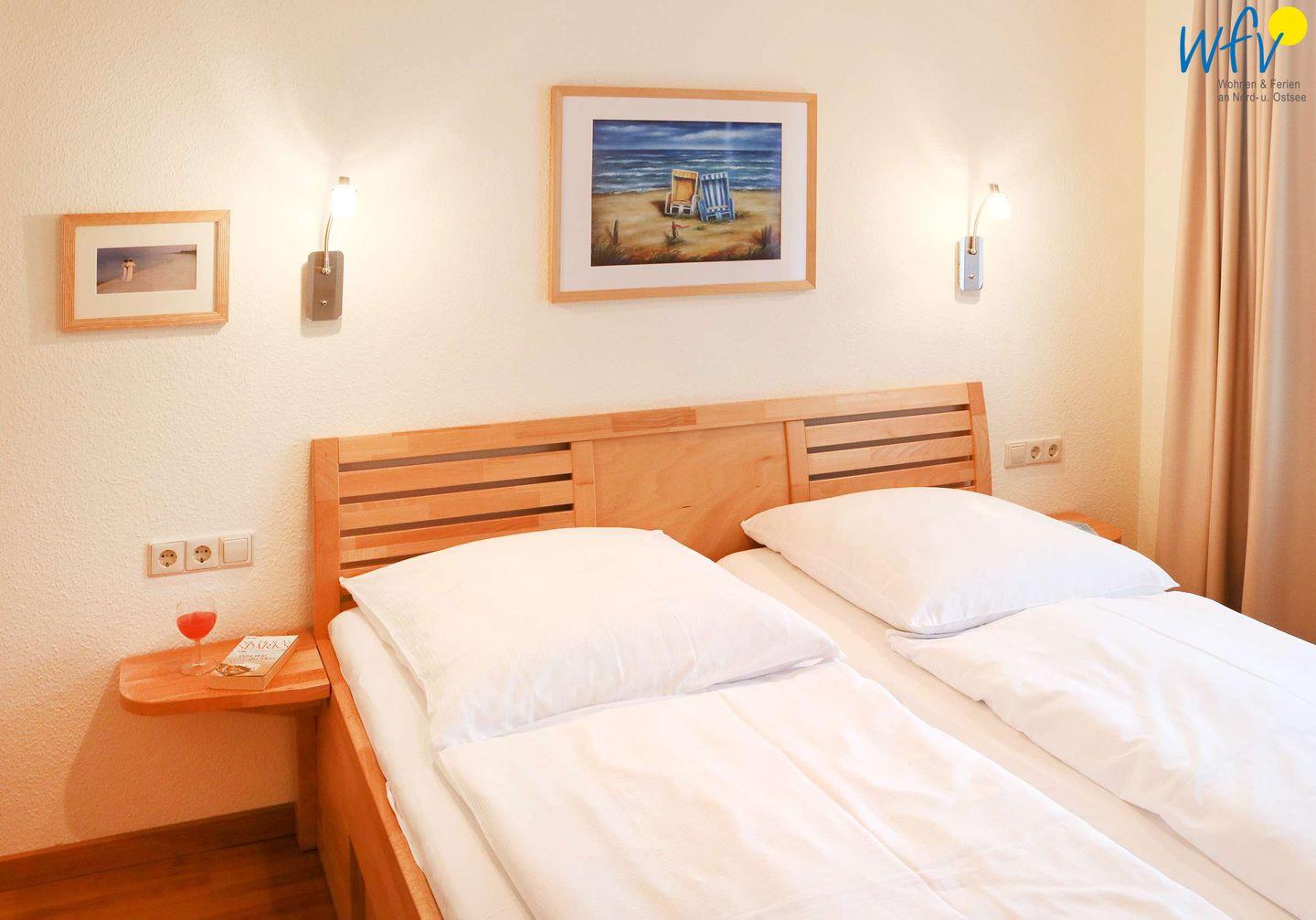 In dem separaten Schlafzimmer der Ferienwohnung befindet sich ein Doppelbett (1,80 m x 2 m). Das bequeme Schlafsofa im Wohnzimmer bietet eine Aufbettung für zwei weitere Personen (Liegefläche 1,40 m).
