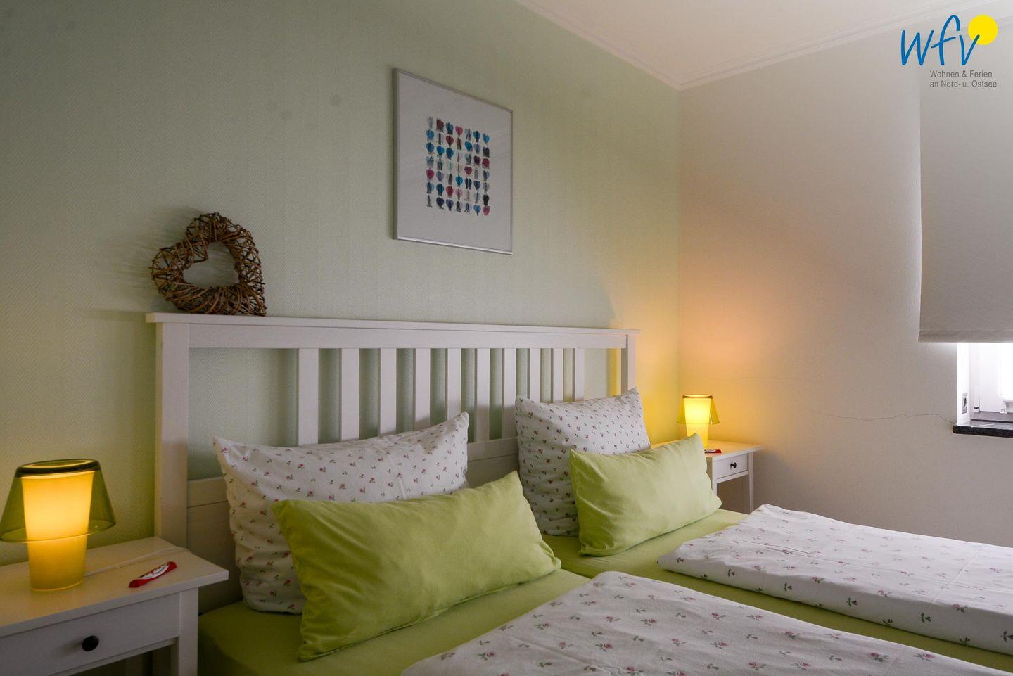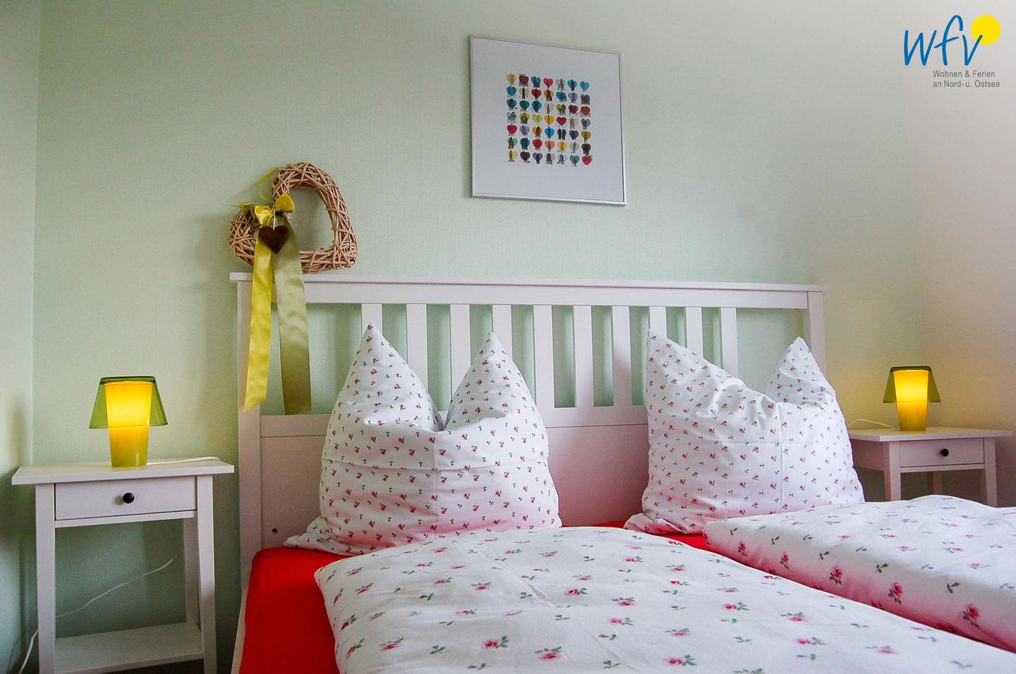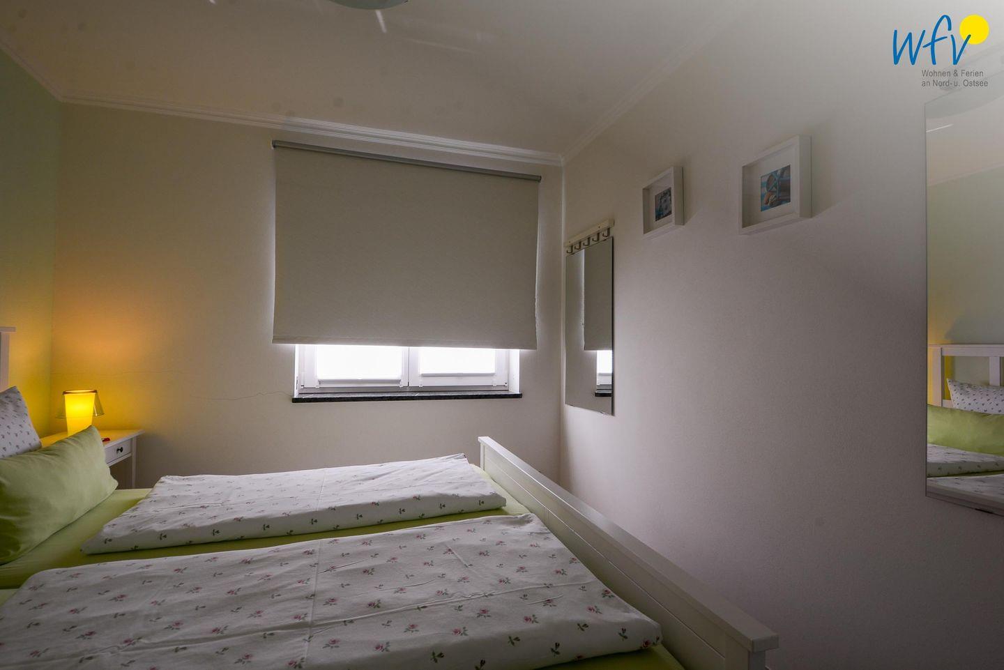 In dem separaten Schlafraum befindet sich ein Doppelbett und ein TV. Eine weitere Person kann im Wohnraum auf der komfortablen Schlafcouch übernachten.