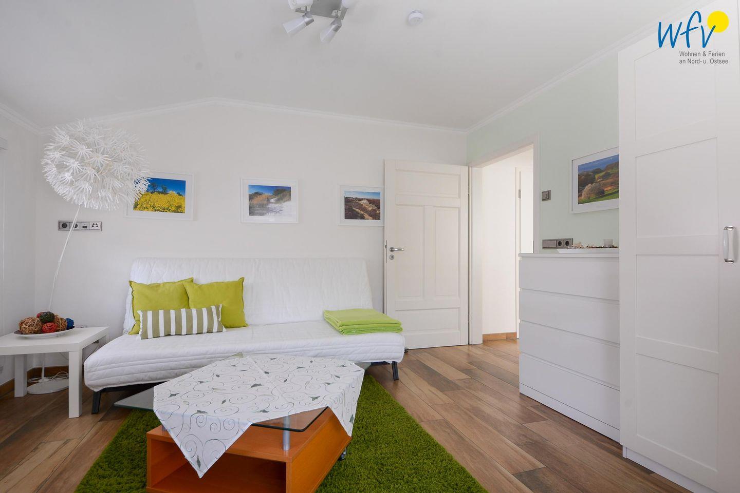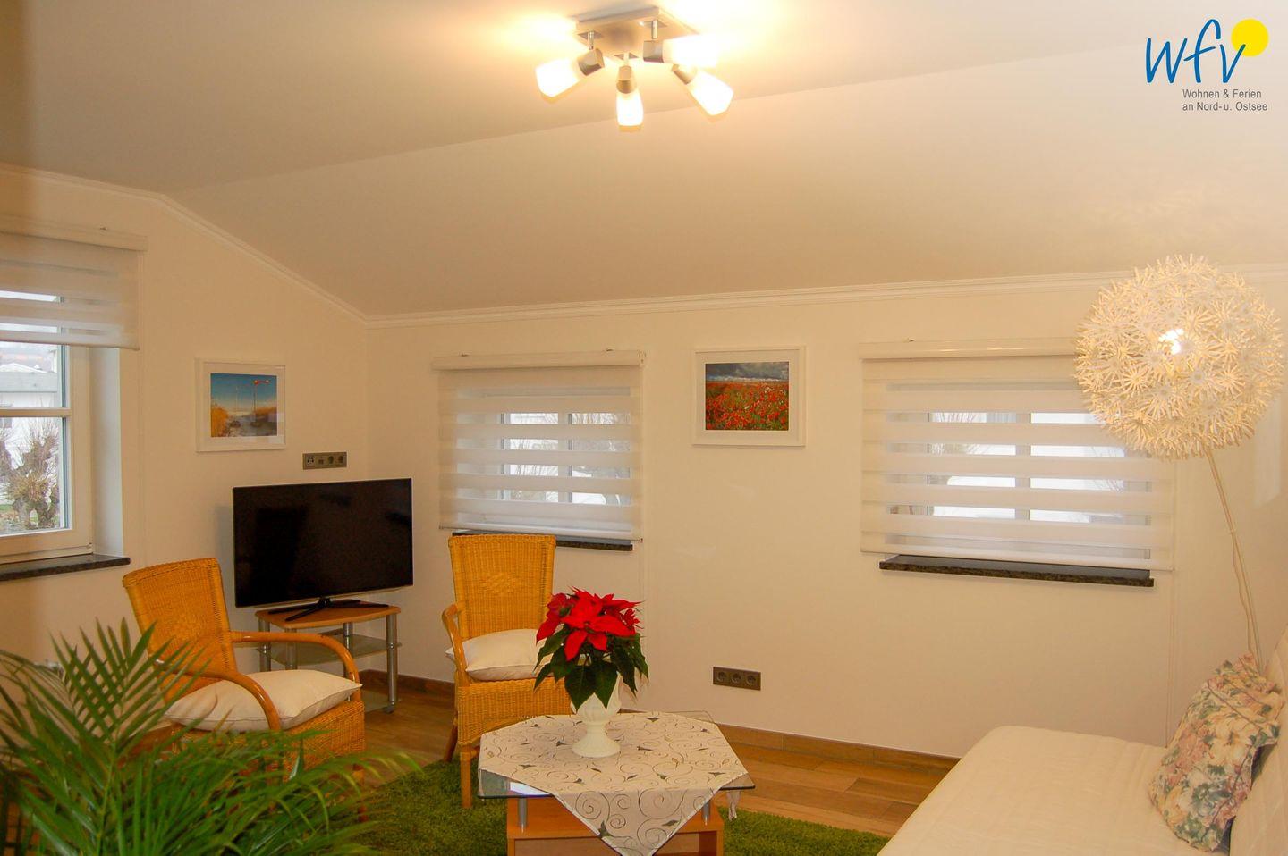 Urlaubszeit heißt Zeit zum Relaxen! Herrlich entspannen können Sie vor allem im Wohnraum der Ferienwohnung. Eine bequeme Sitzgruppe mit TV lädt zu gemütlichen Filmabenden ein. Es besteht die Möglichkeit, einen DVD-Player für Ihren Aufenthalt zu erhalten. Zum Surfen vom Smartphone aus empfangen Sie freies WLAN.