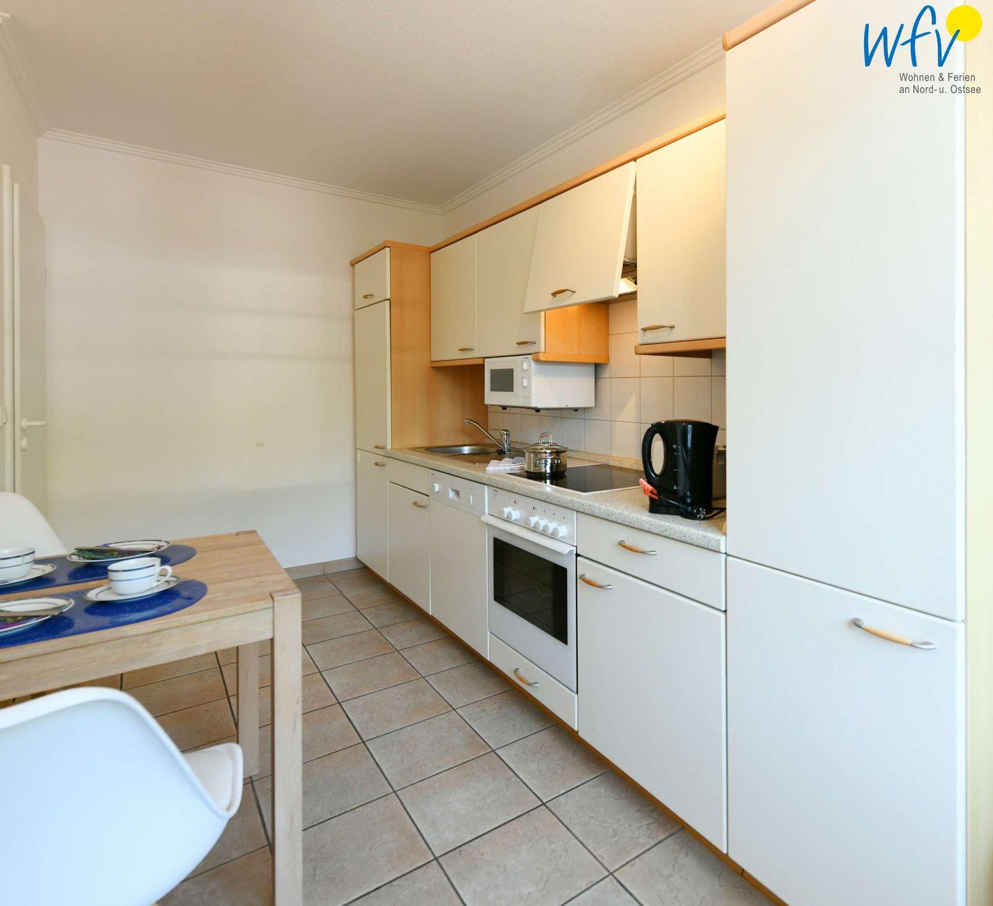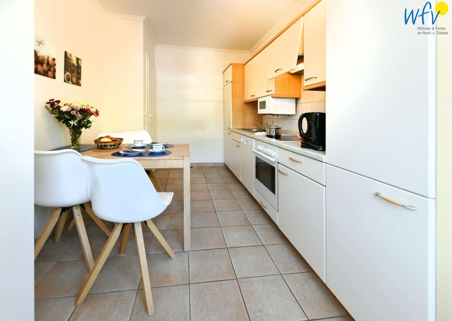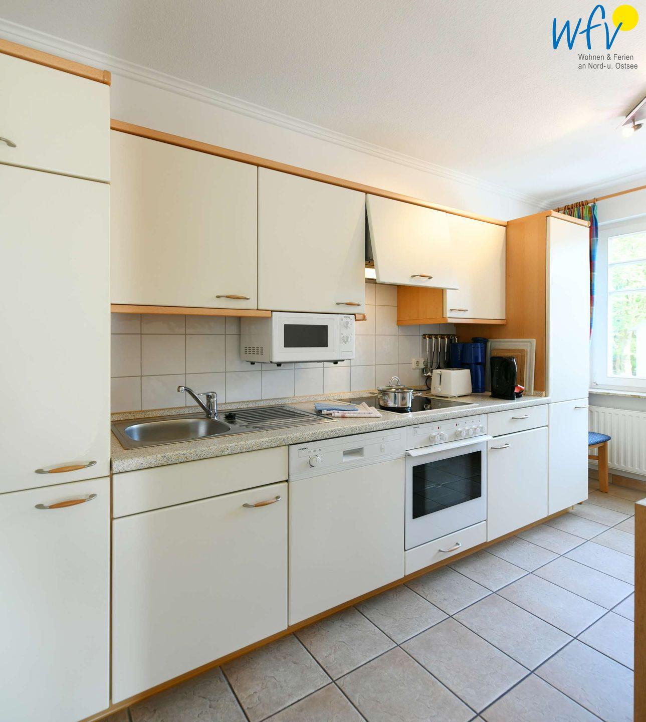 In der separaten Küche mit Essplatz lassen sich bequem leckere Mahlzeiten zubereiten. Sie ist u.a. mit Herd, Backofen, Mikrowelle und Spülmaschine ausgestattet.