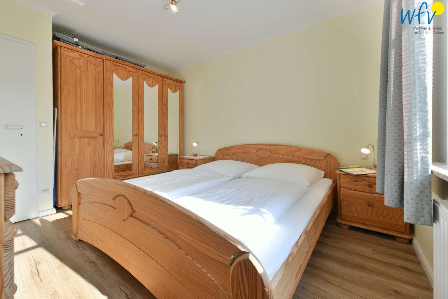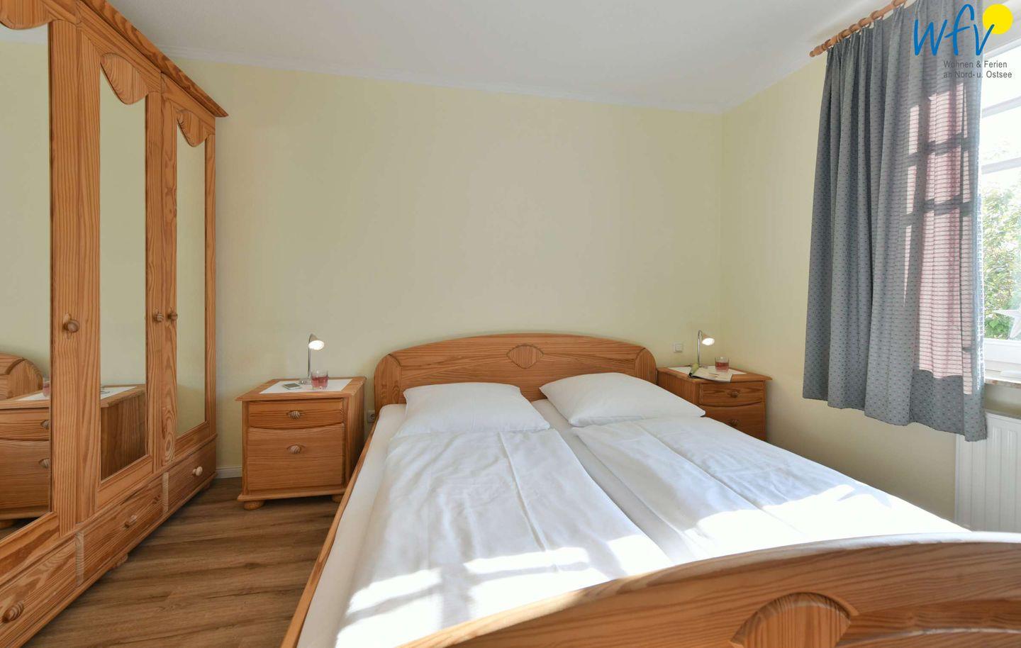 Ein separates Schlafzimmer mit Doppelbett ( 2 x 0,90 m x 2 m) sowie das Sofa (1,40 m x 2 m) im Wohnraum bieten Schlafmöglichkeiten für vier Personen.