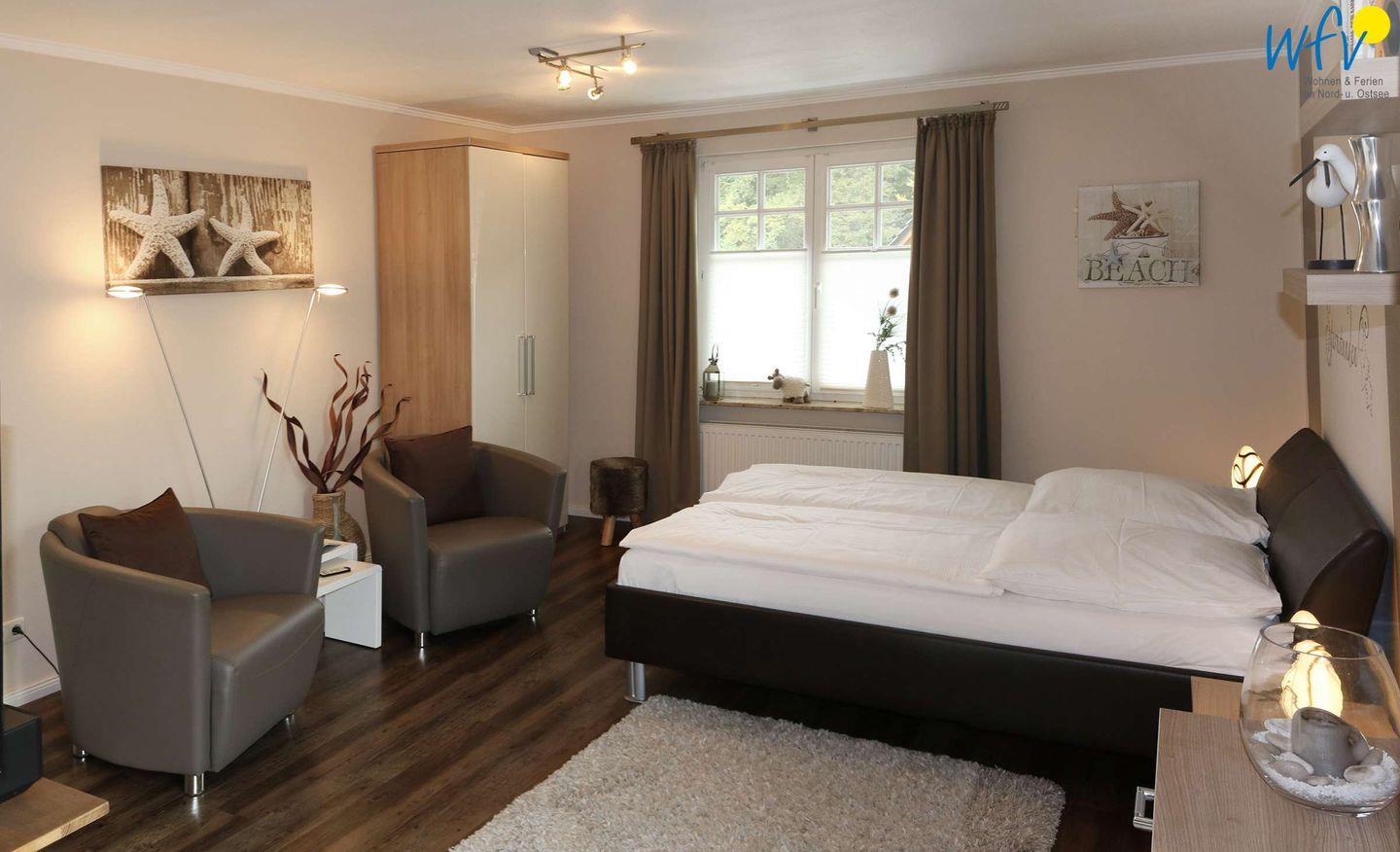 Das komfortable Doppelbett (160 cm x 200 cm) lädt zum ausgiebigen Ausschlafen ein. Ihre Urlaubgarderobe findet Platz im Kleiderschrank.