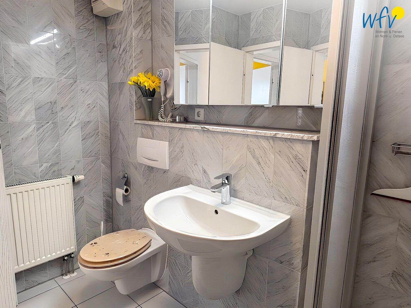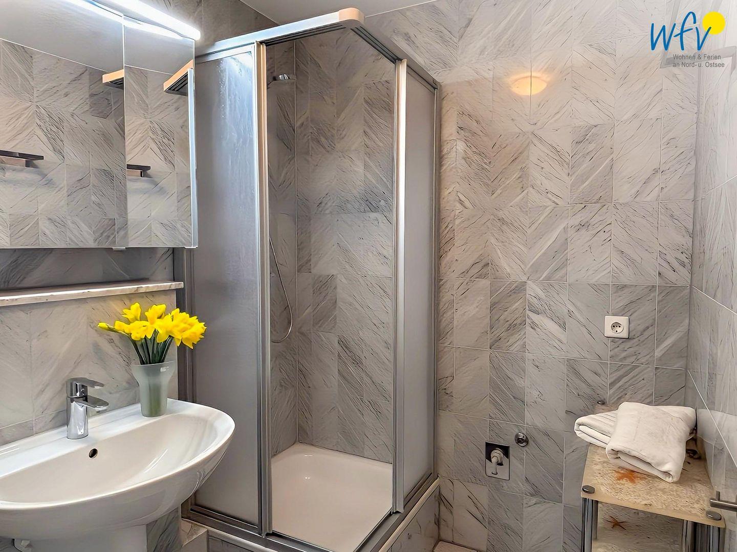 Eine einladende Wohnatmosphäre erwartet Sie auch in dem mit Marmor gefliesten Badezimmer. Es verfügt u.a. über eine Dusche, einen installierten Haartrockner und einen Spiegelschrank.