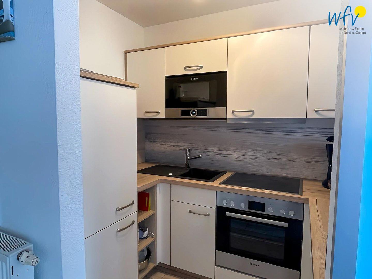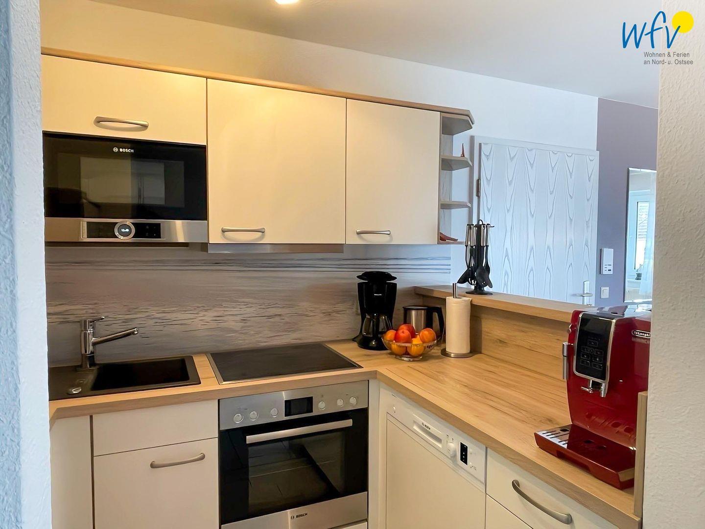 Für eine einfache und praktische Selbstverpflegung ist die offene moderne Küche komplett ausgestattet - u.a. mit einem 4-Platten-Ceranherd, einem Elektrobackofen, einer Mikrowelle, einem separaten Gefrierschrank und einer Spülmaschine. Als Kaffeeliebhaber können Sie zwischen einer klassischen Kaffeemaschine, einer Tassimo-Kapselmaschine und einem DeLonghi-Vollautomaten wählen (mit Bohnen und Kapseln befüllbar).