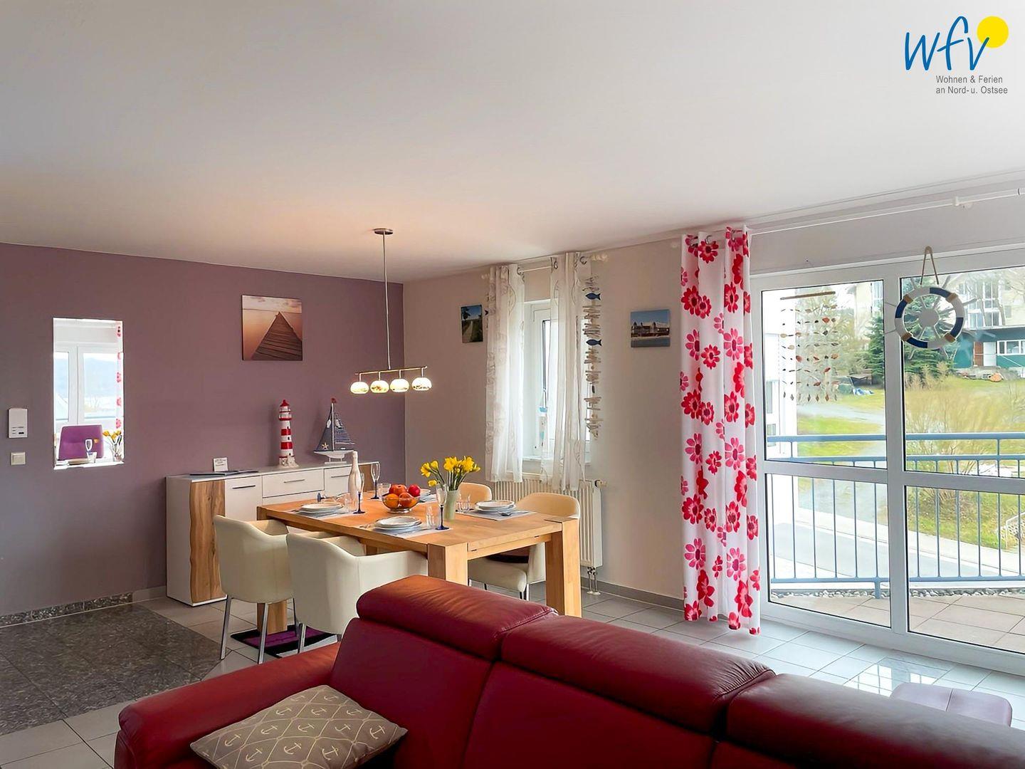 Es erwartet Sie eine komfortable und moderne Einrichtung. Liebevolle Accessoires und maritime Wandbilder sorgen für Gemütlichkeit und das entsprechende Ostseegefühl. In dem geräumigen Wohnzimmer laden eine gemütliche Couchlandschaft mit HiFi-Anlage, TV, DVD-Player und Blu-ray-Player sowie ein Relaxsessel und ein großer Esstisch zu entspannten Stunden ein. Vom Wohnzimmer aus haben Sie einen direkten Zugang auf den sonnigen überdachten Südbalkon, der einen schönen Ausblick in die Umgebung und auf den Schmachter See bietet. Auf den bequemen Gartenstühlen mit hochwertigem Granittisch können Sie hier wunderbar verweilen, entspannen und wohltuende Ostseeluft genießen.