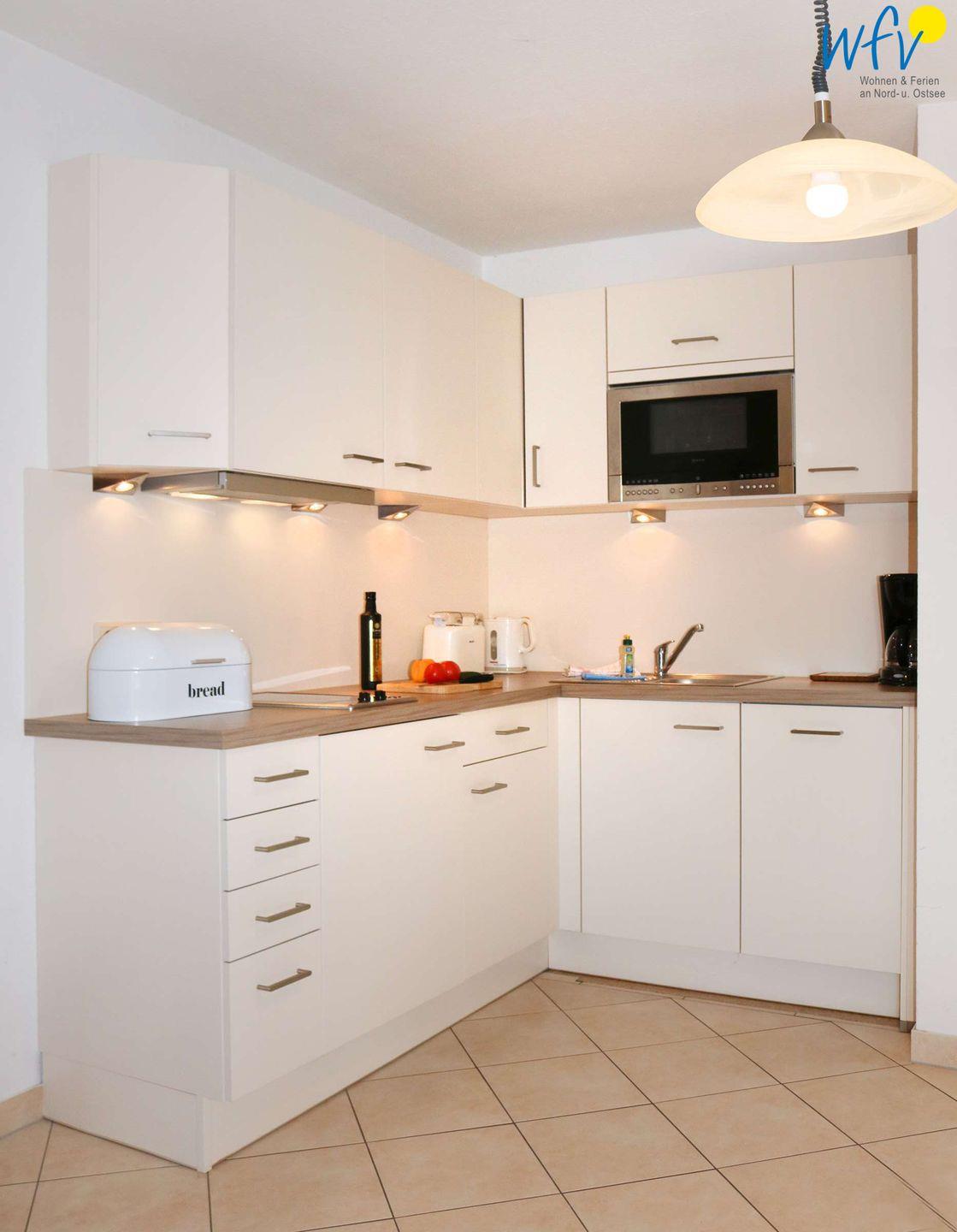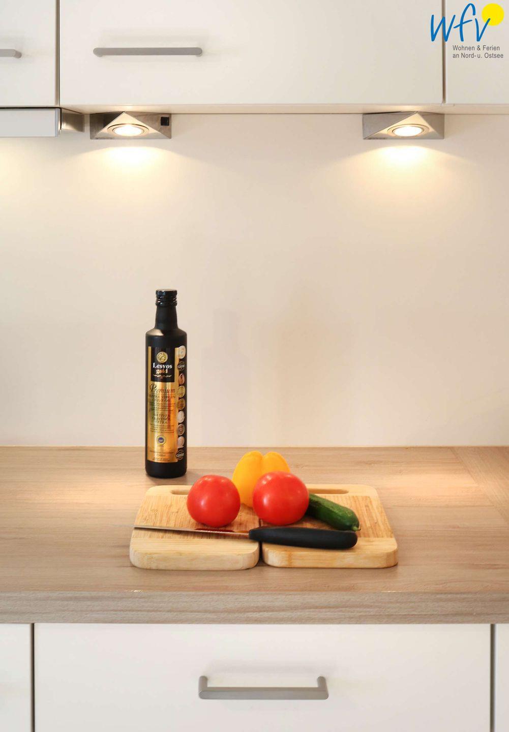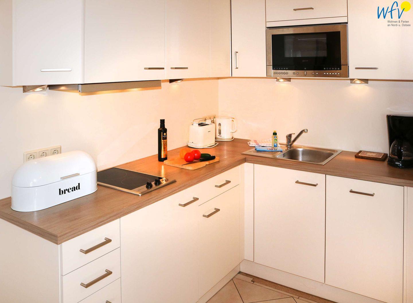 Für eine bequeme Selbstverpflegung verfügt die Küche der Ferienwohnung u.a. über einen Kühlschrank mit Gefrierfach, eine Mikrowelle, ein 2-Platten-Ceranfeld sowie über diverse Kleingeräte. Viele Restaurants und Bistros im nahegelegenen Binzer Ortskern und auf der Promenade verwöhnen Sie außerdem mit einer vorzüglichen Ostseeküche!
