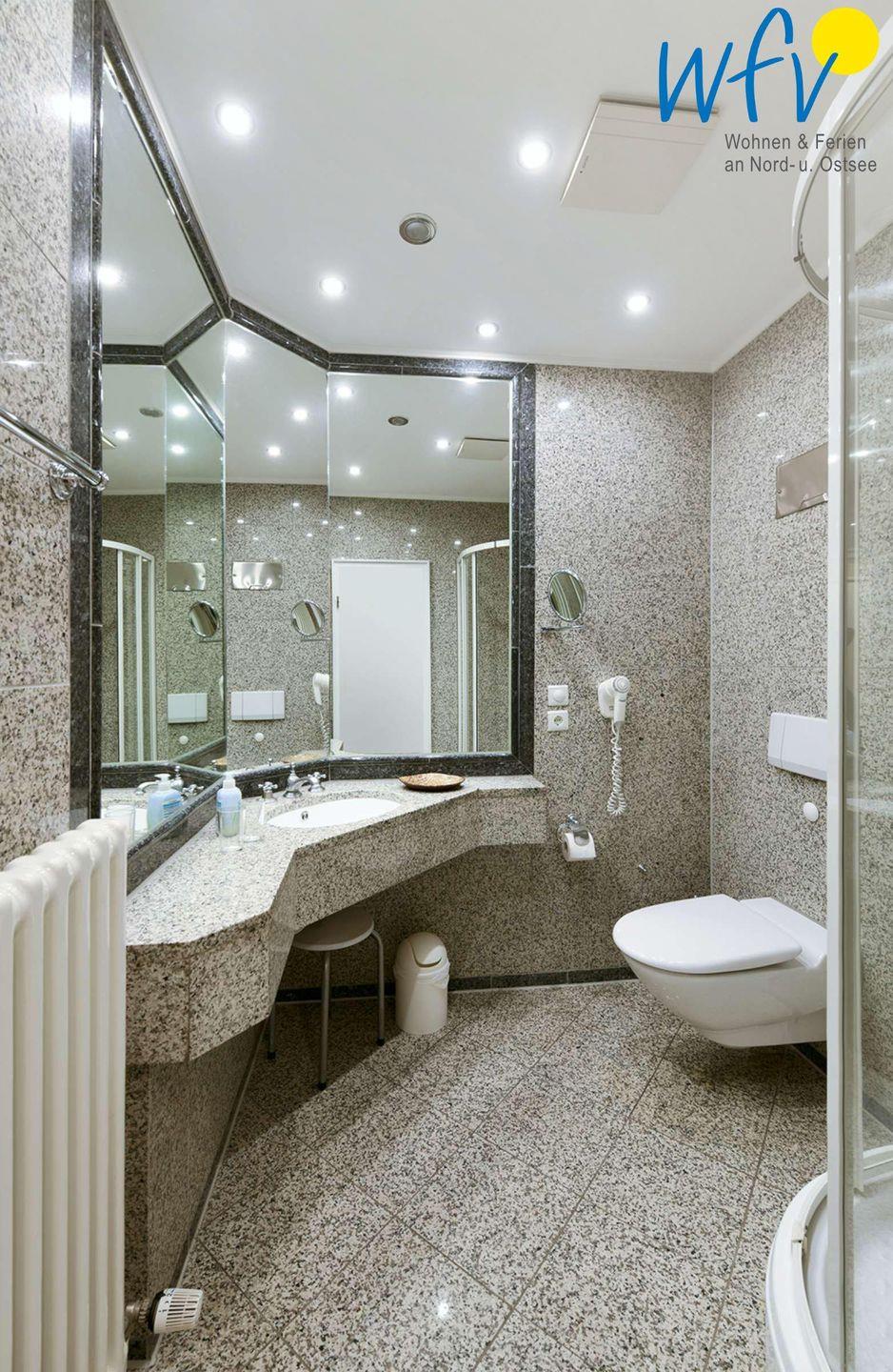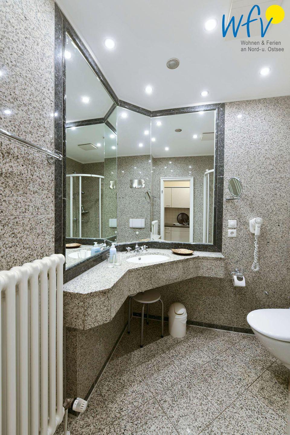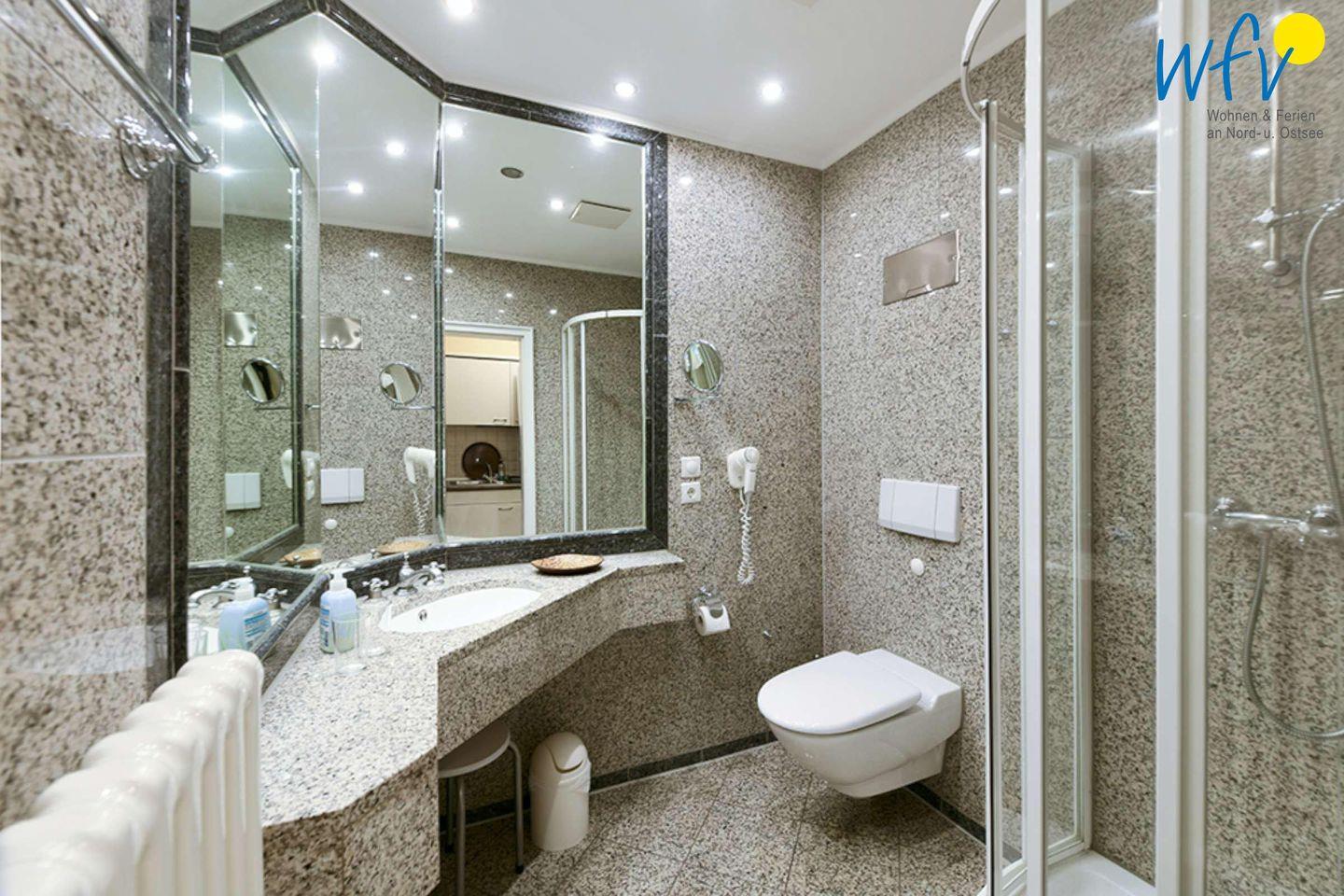 Für weiteren Wohnkomfort sorgt ein hochwertiges Granitbad mit Dusche, WC und Waschtisch.