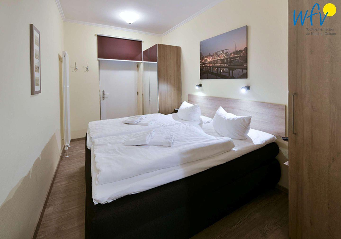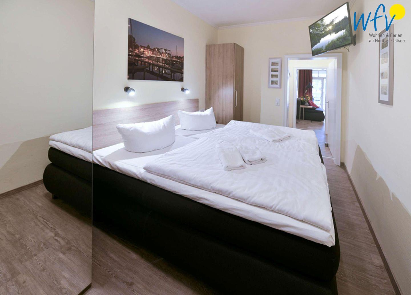 In dem separaten Schlafzimmer der Ferienwohnung „Adlerhorst“ befindet sich ein 1,80 m breites Boxspringbett, ein Kleiderschrank mit Ganzkörperspiegel und ein zweiter 40 Zoll Fernseher. Für weitere Schlafmöglichkeiten kann die Couch im Wohnbereich mit wenigen Handgriffen zu einem Bett (1,60 m breit) umfunktioniert werden.