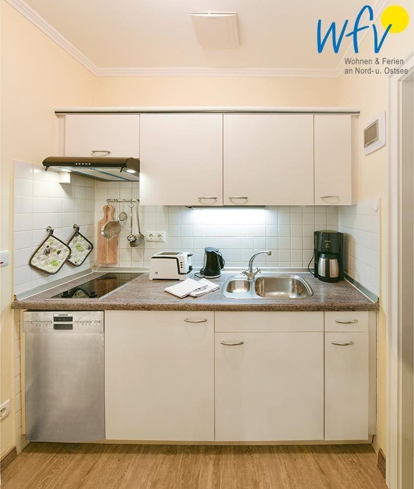 Damit Sie sich in Ihrem Rügen-Urlaub bequem selbst verpflegen können, verfügt die Ferienwohnung „Adlerhorst“ über eine gut ausgestattete Küchenzeile – u.a. mit 2 Platten-Ceranfeld, Kühlschrank mit Gefrierfach, Geschirrspüler, Kaffeemaschine, Wasserkocher und Toaster.