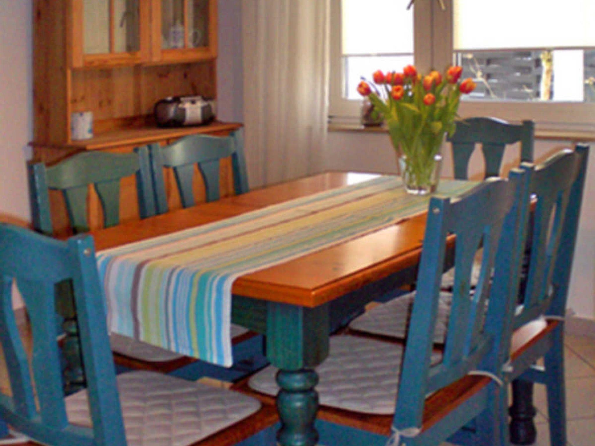 Die 65m² große ebenerdige Ferienwohnung verfügt über einen Wohnraum mit TV, DVD-Player und offener Küche mit großem Esstisch. Die Küche ist großzügig und voll ausgestattet, unter anderem auch mit Mikrowelle und Spülmaschine. Die Verbindung zum Wohnbereich gibt das Gefühl im Gesamtgeschehen dabei zu sein. Das Schlafzimmer ist mit einem Doppelbett und einem Einzelbett eingerichtet. Das Zustellen eines Babyreisebettes ist in diesem Zimmer möglich. Eine Aufbettung ist im Wohnraum auf dem Sofa möglich. Das Bad ist mit Dusche, WC und einer Waschmaschine ausgestattet.