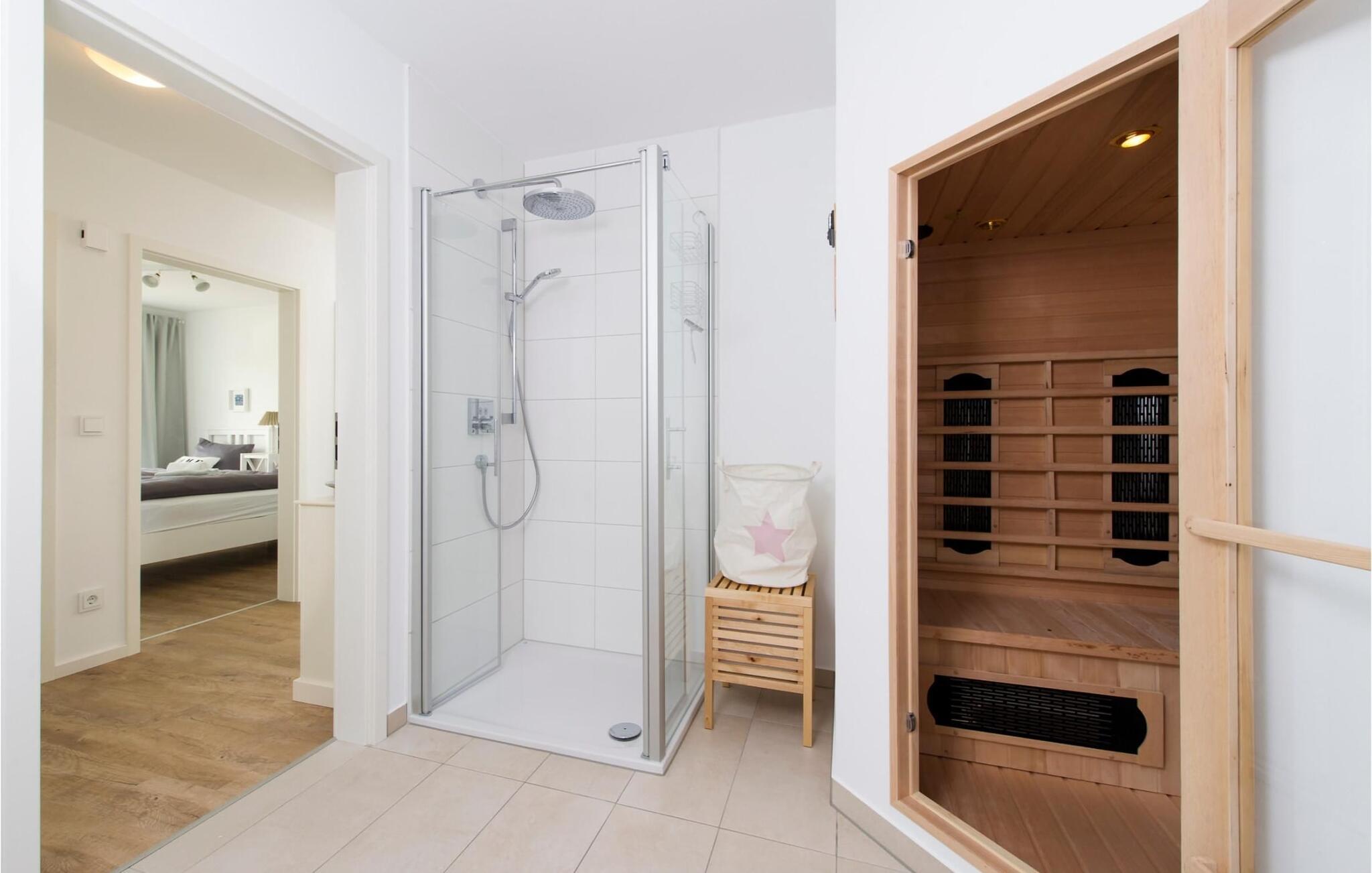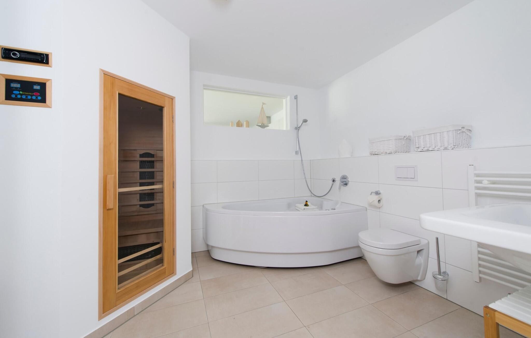 Das voll ausgestattete große Badezimmer macht den Ostseeurlaub zum Wellness-Trip. Entspannen lässt es sich hier in Whirlwanne oder Sauna. Die bodengleiche Regendusche bietet zusätzlichen Komfort.