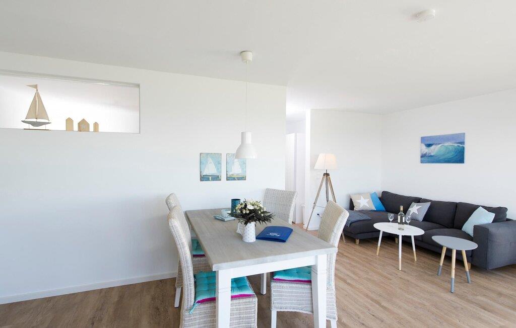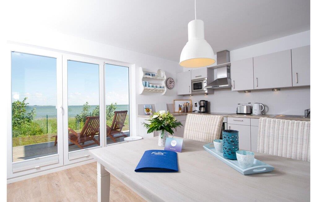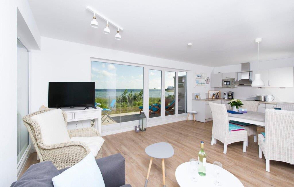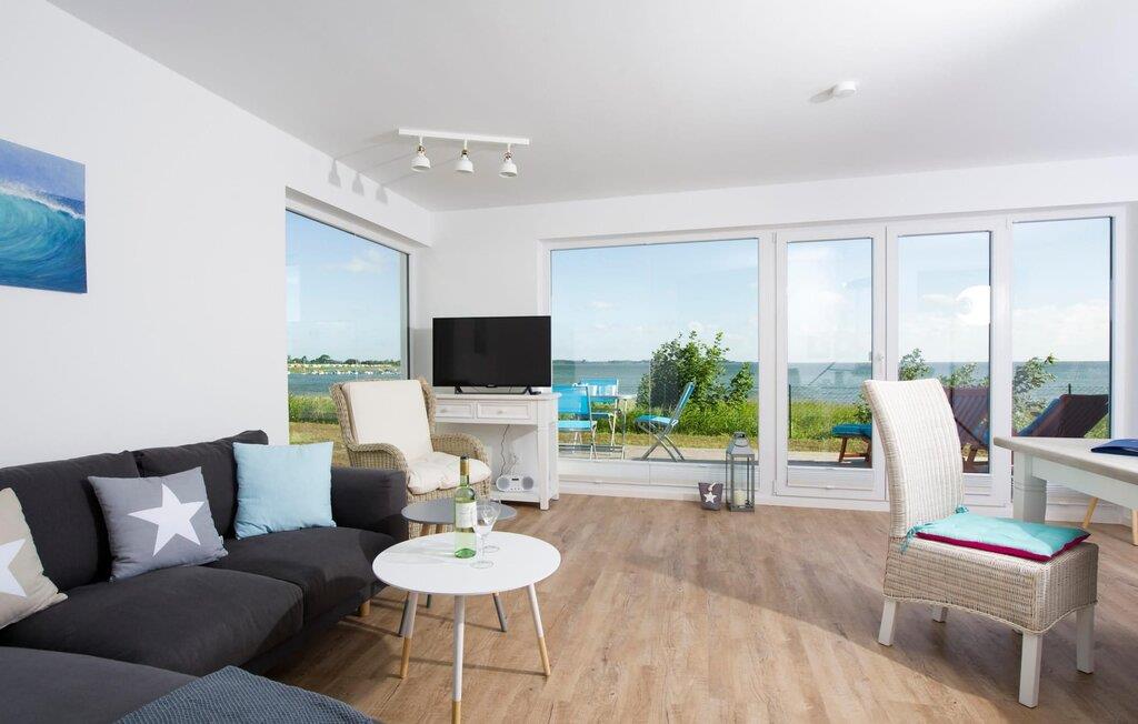Der Wohn-/Essbereich der Ferienwohnung besticht mit großen Fensterfronten, durch welche der Blick auf die direkt angrenzende Terrasse und den Ostseefjord Schlei fällt. Das bequeme Sofa mit Ausziehmöglichkeit und hochwertigem Lattenrost bietet höchsten Komfort. Die rundum ausgestattete Küche lässt keine Wünsche offen. Ob am massiven Esstisch oder auf der komfortablen Sitzgruppe im Wohnzimmer, der Blick fällt auf das phänomenale Wasser-Panorama der Schlei.