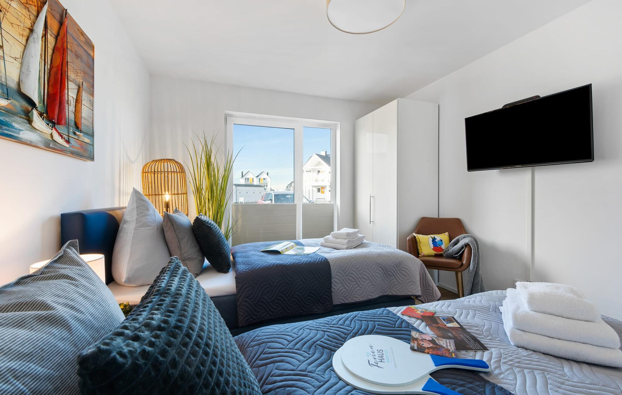 Für erholsame Nächte stehen zwei Schlafzimmer bereit. Eines mit einem Doppelboxspringbett und eines mit zwei Einzelboxspringbetten. Für die schönen Träume müsst ihr allerdings selbst sorgen. Und falls es nicht klappt mit dem Schlafen, steht ein weiterer TV zur Verfügung.