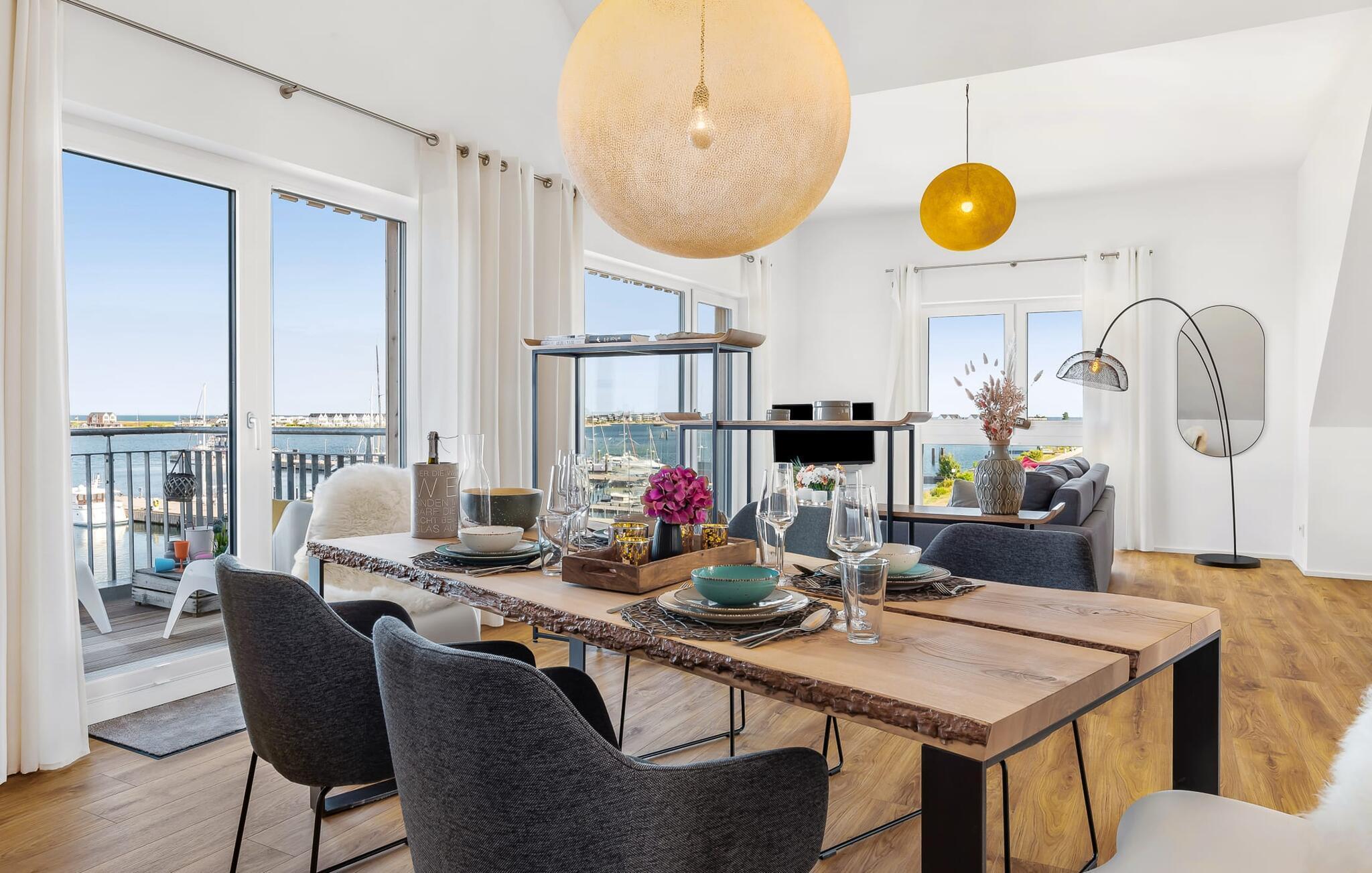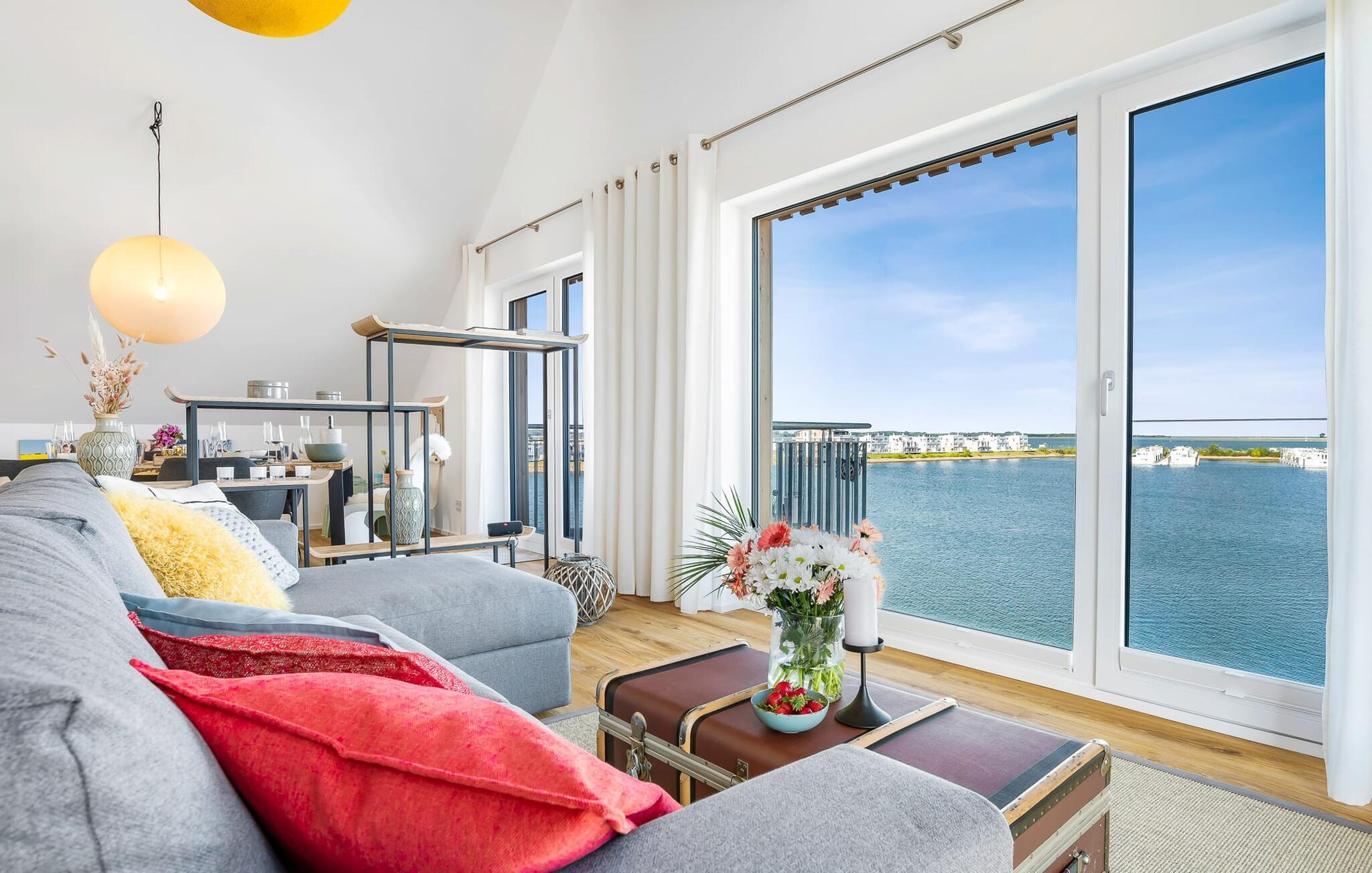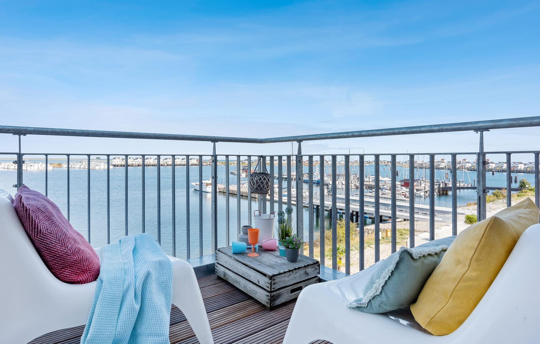 Moderne Ferienwohnung in Olpenitz mit Hafenblick und Balkon, ideal für erholsame Tage an der Ostsee.