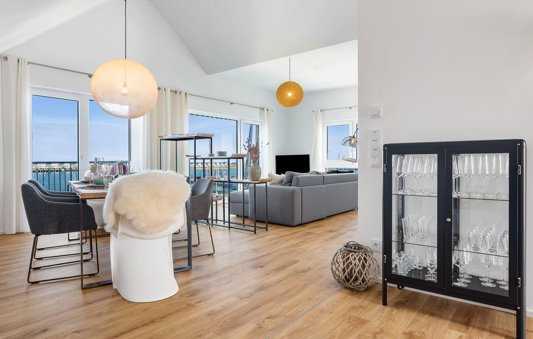 Bereits beim Öffnen der Wohnungstür fällt der Blick durch die bodentiefe Fensterfront des offenen Wohn-/Essbereichs über den Balkon auf das Hafenpanorama mit seinem bunten Treiben. Lasst euch hier bei uns (54°N 10°O) von den Farben der BLAUEN STUNDE überwältigen. Das Farbspiel ist bei jedem Wetter einmalig und wird euch begeistern!