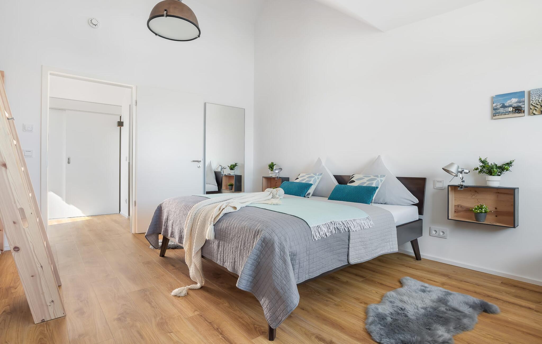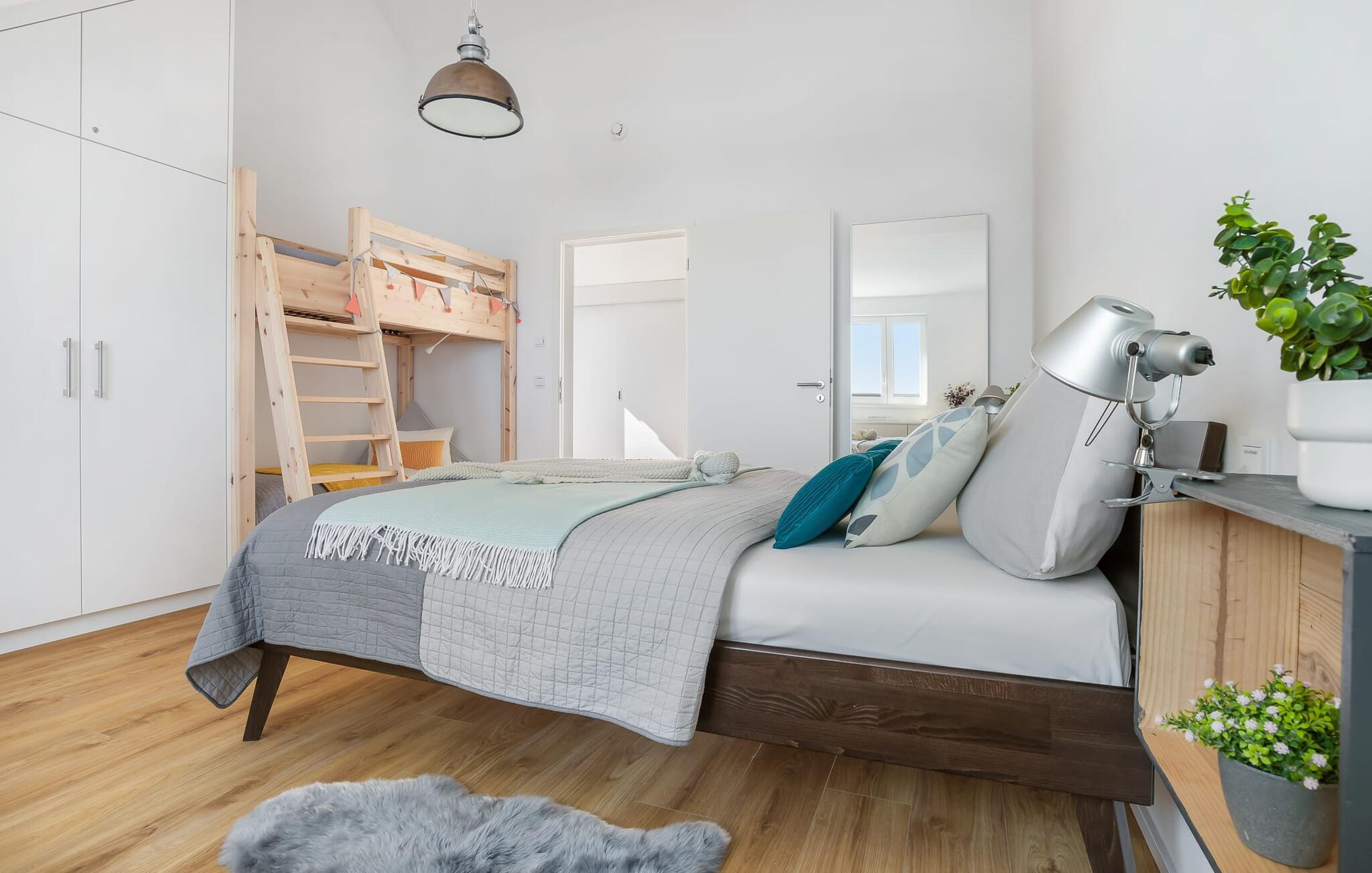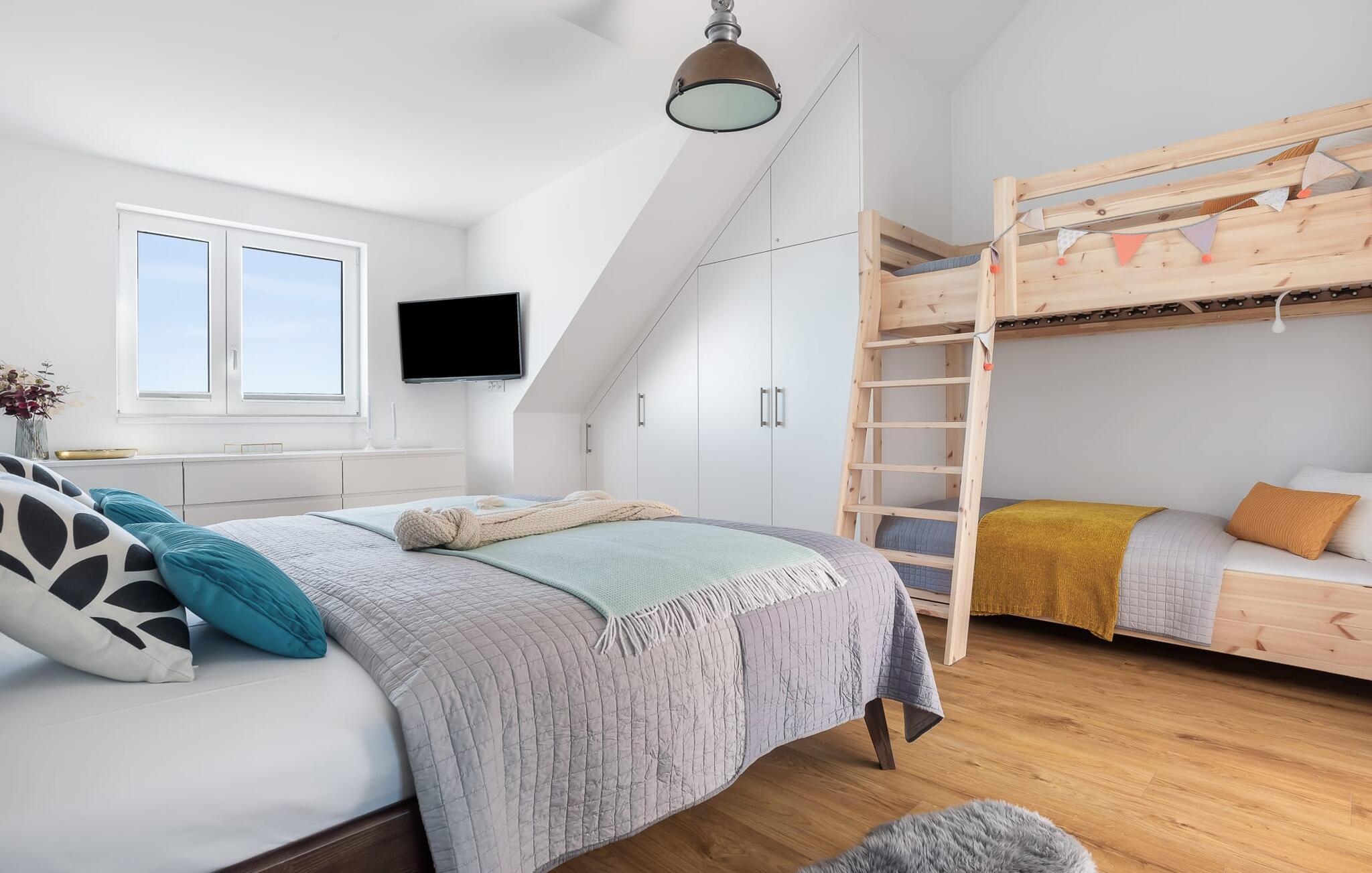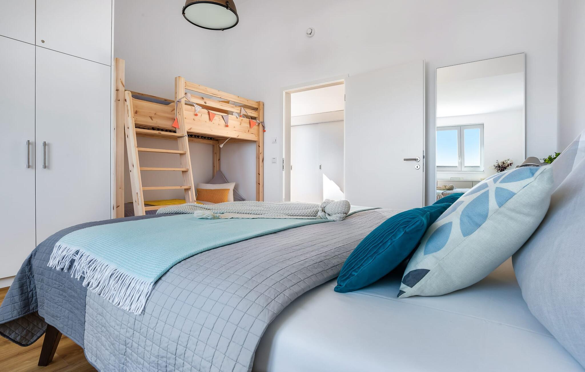 Das geräumige Schlafzimmer bietet direkt vier gemütliche Schlafplätze. Für Familien ist das Hochbett als Piratenschiff ein idealer Schlafplatz für Kinder, die Erwachsenen schlafen komfortabel in einem Doppelbett. Doch auch Erwachsene können im Hochbett übernachten. Bis zu 6 Personen haben Platz in dem Apartment, denn mit nur wenigen Handgriffen lässt sich das Sofa im Wohnzimmer in zwei weitere Schlafplätze verwandeln. Einem Urlaub mit den besten Freunden steht folglich nichts mehr im Wege.