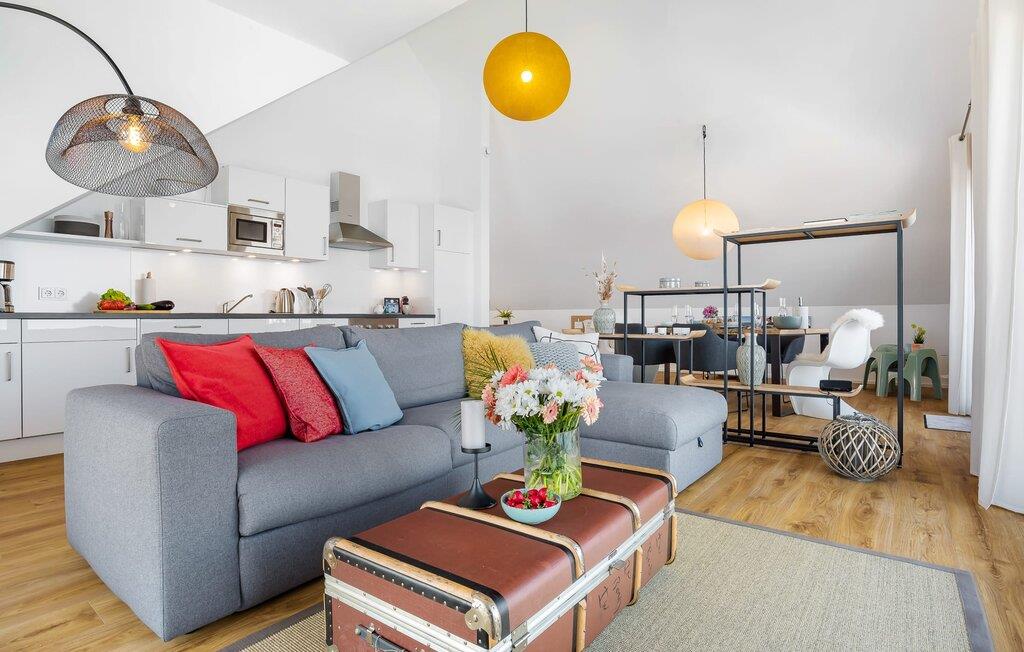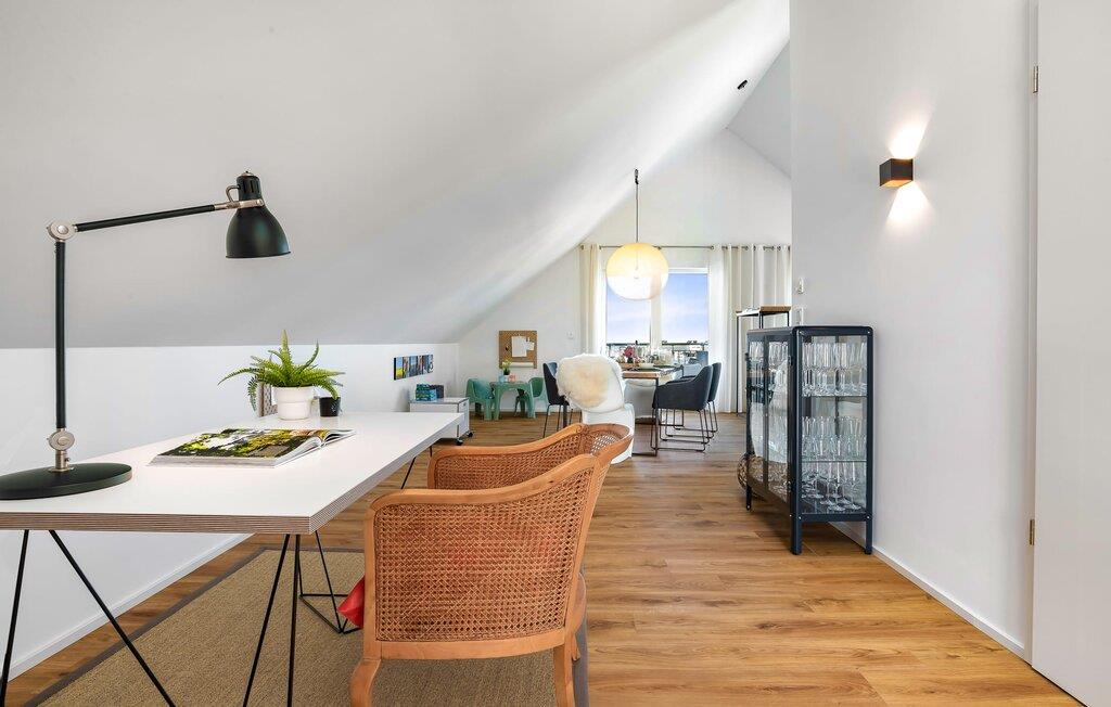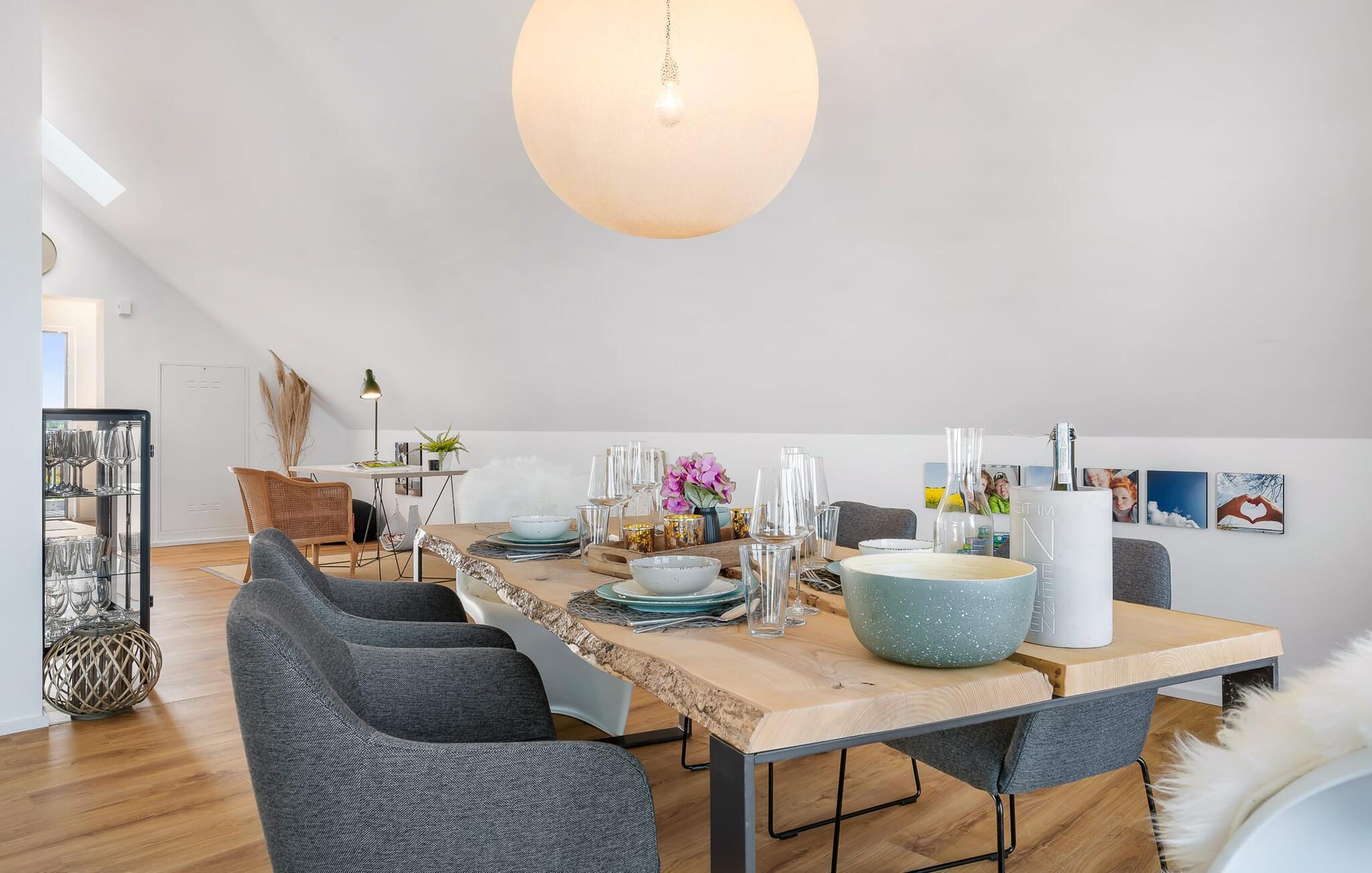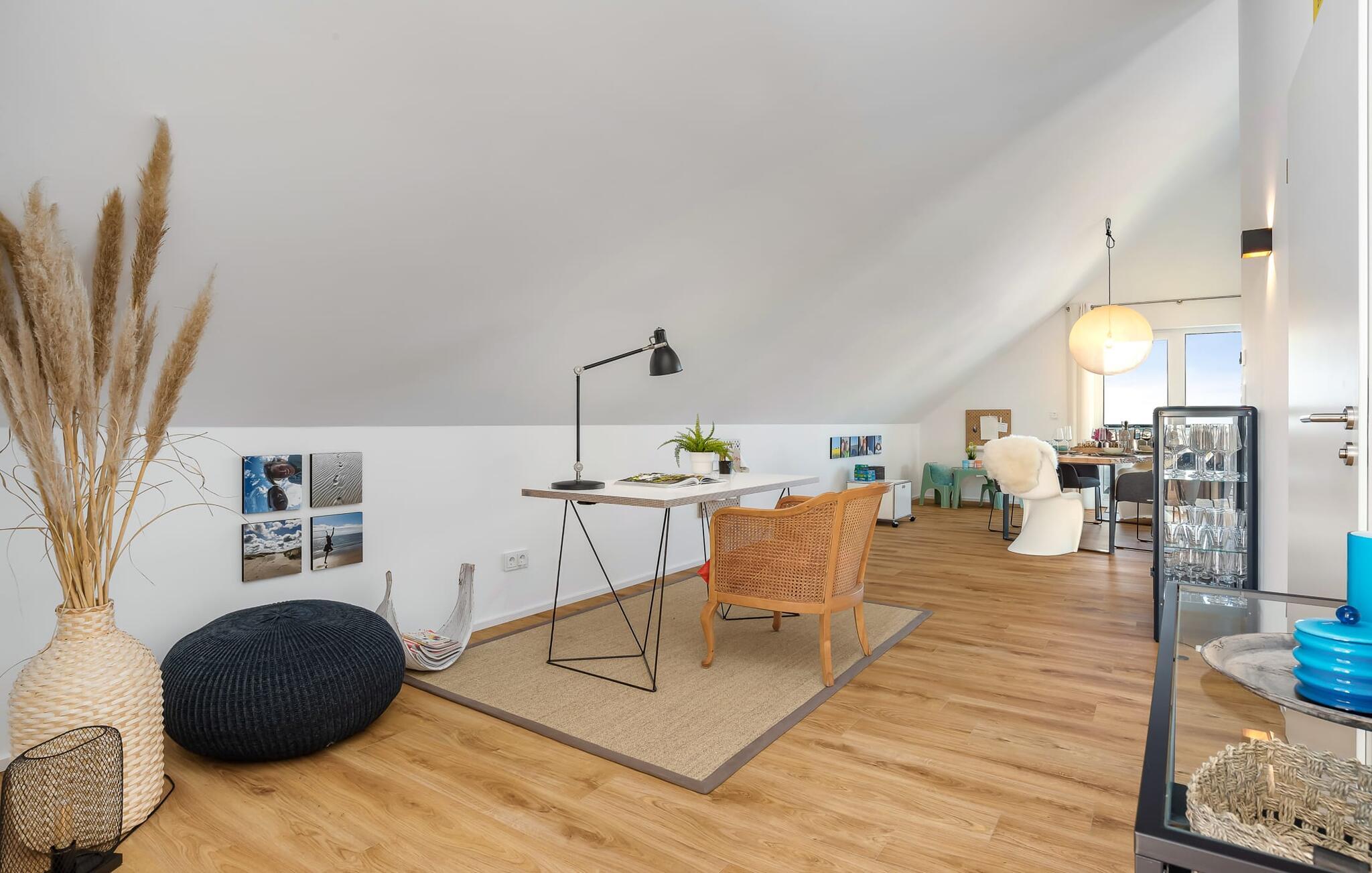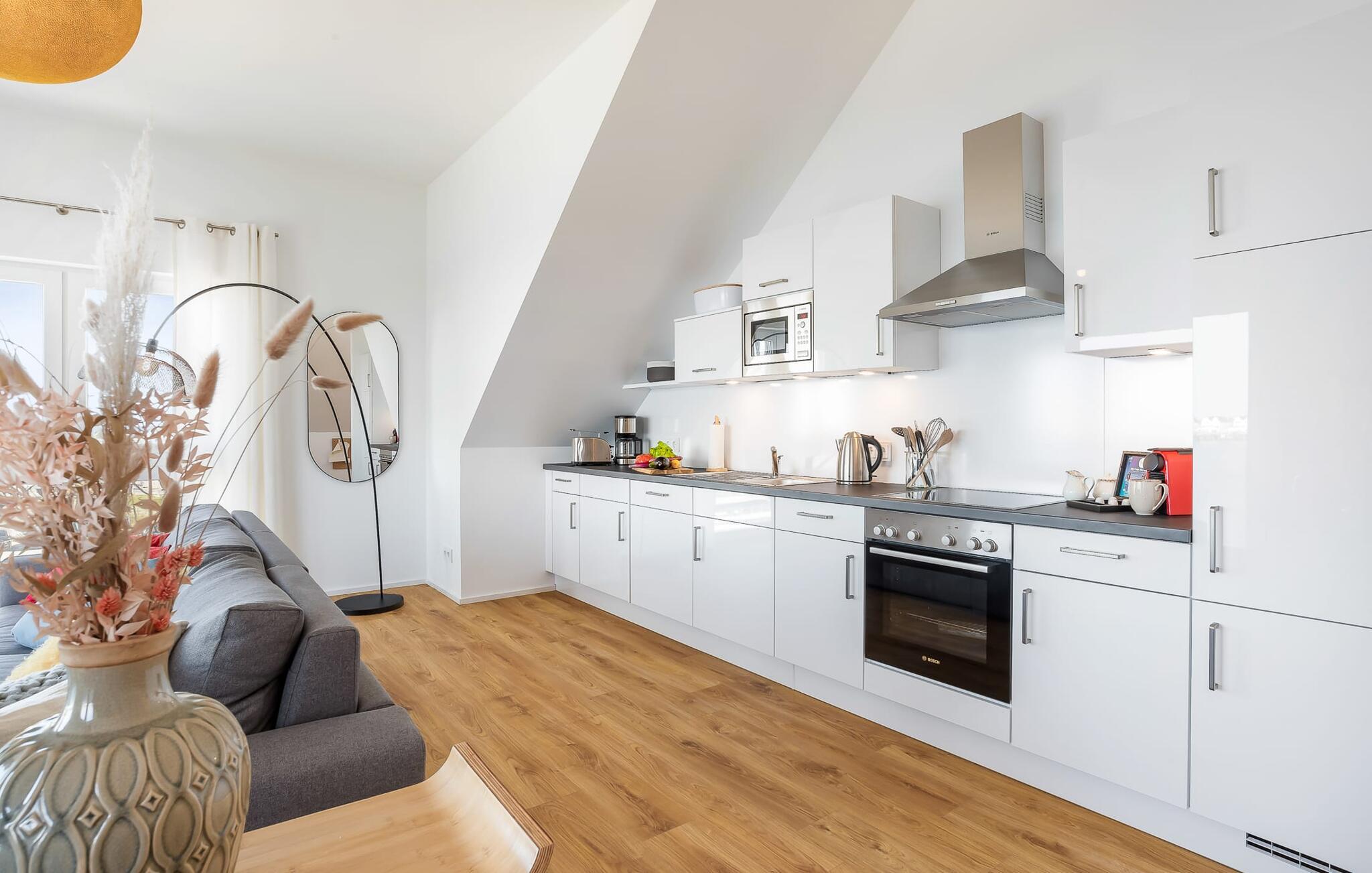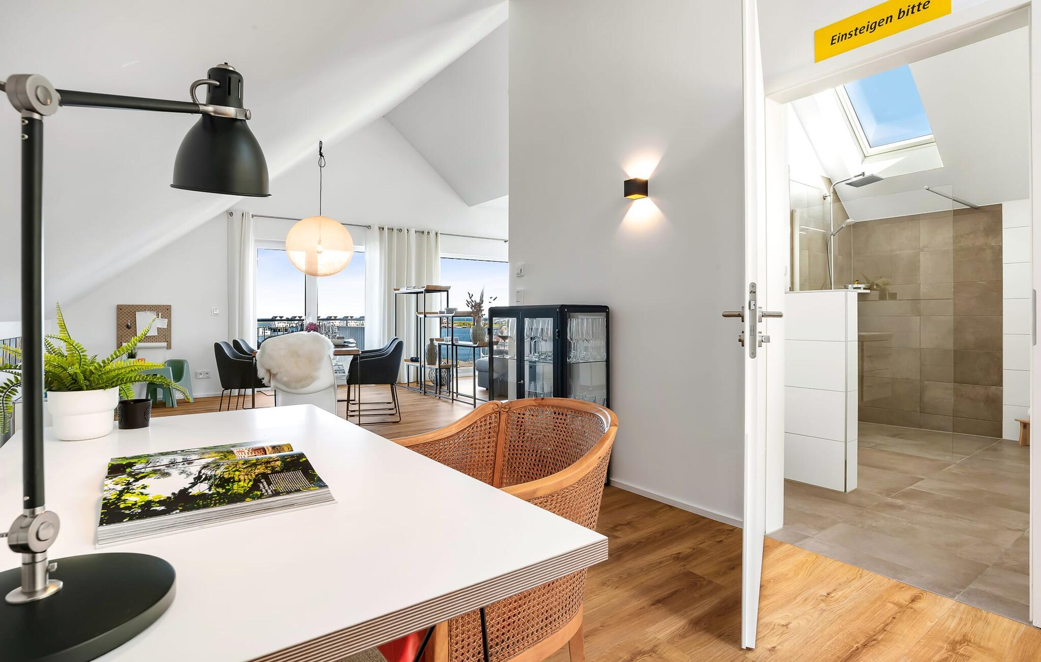 Die im nordisch lässigem Einrichtungsstil gehaltene Ferienwohnung ist sowohl modern als auch einladend und strahlt Gemütlichkeit aus. Der großzügige und offene Wohn-, Ess- und Küchenbereich bietet allen Komfort, den ihr von eurem Zuhause kennt. Und wer das Home Office ans Meer verlegen möchte, wird hier fündig: Ein separater Arbeitsplatz mit Blick auf die Schlei und dem Gefühl der Weite und Leichtigkeit der See runden die Ausstattung der Wohnung ab. Nach Arbeit fühlt sich das in der Blauen Stunde nicht an!