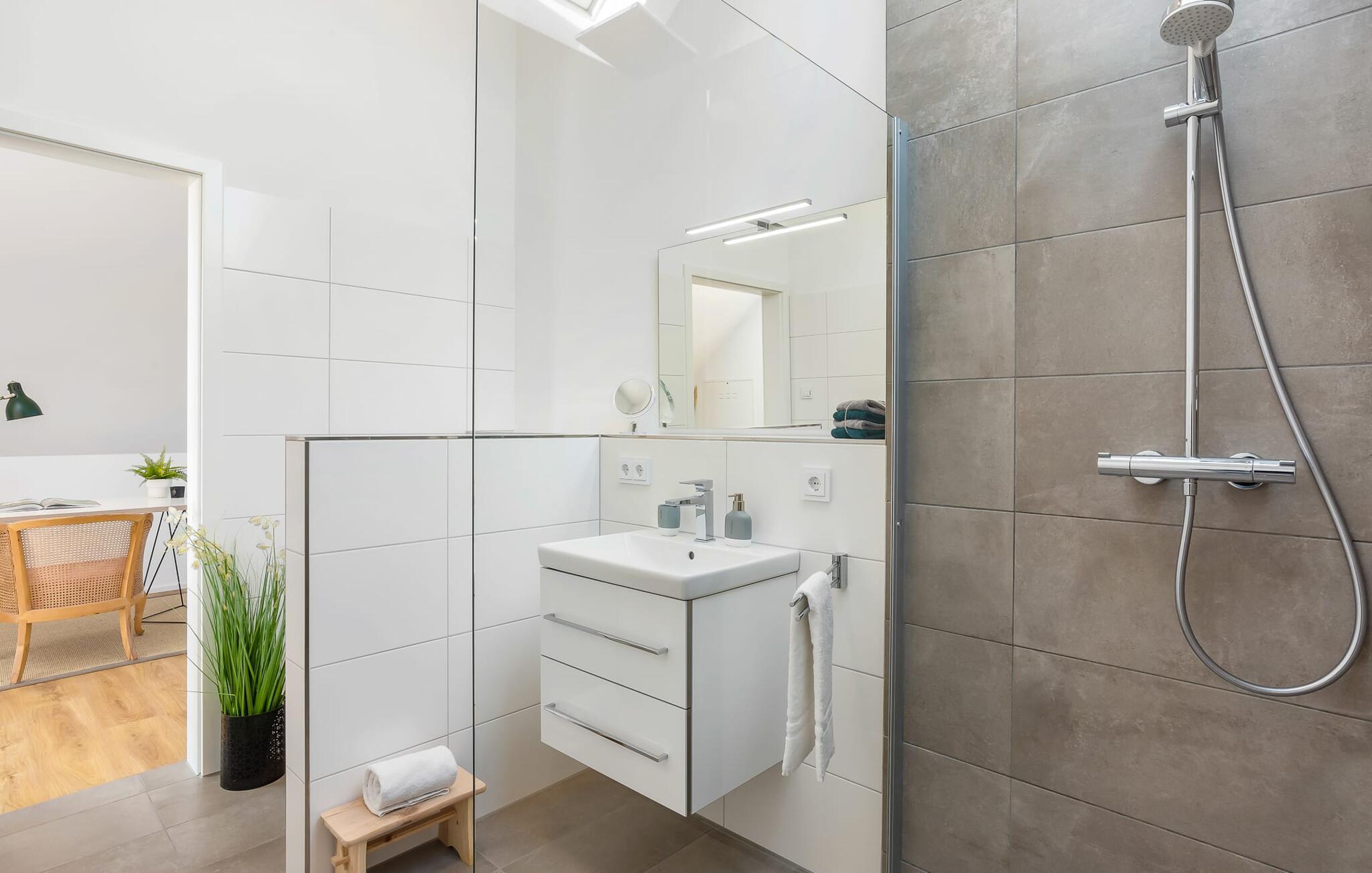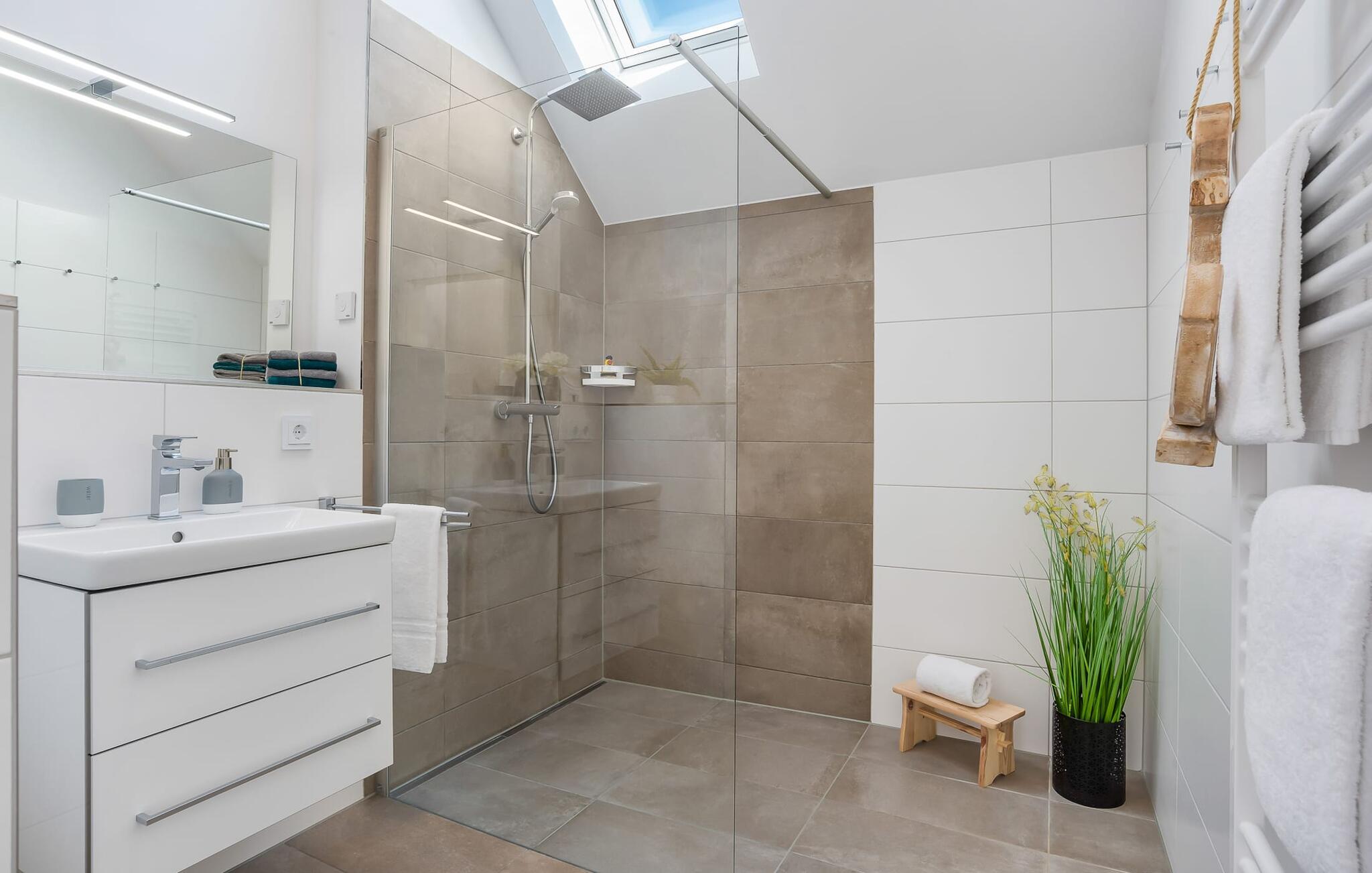 Im Bad befindet sich neben allem Nützlichen eine bodengleiche Dusche für den frischen Start in einen neuen Urlaubstag.